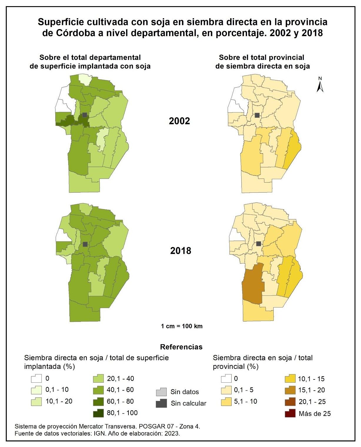 Figura 3.1. Evolución de la superficie cultivada en la provincia de Córdoba a nivel departamental, en porcentaje. Años 1988, 2002 y 2018.