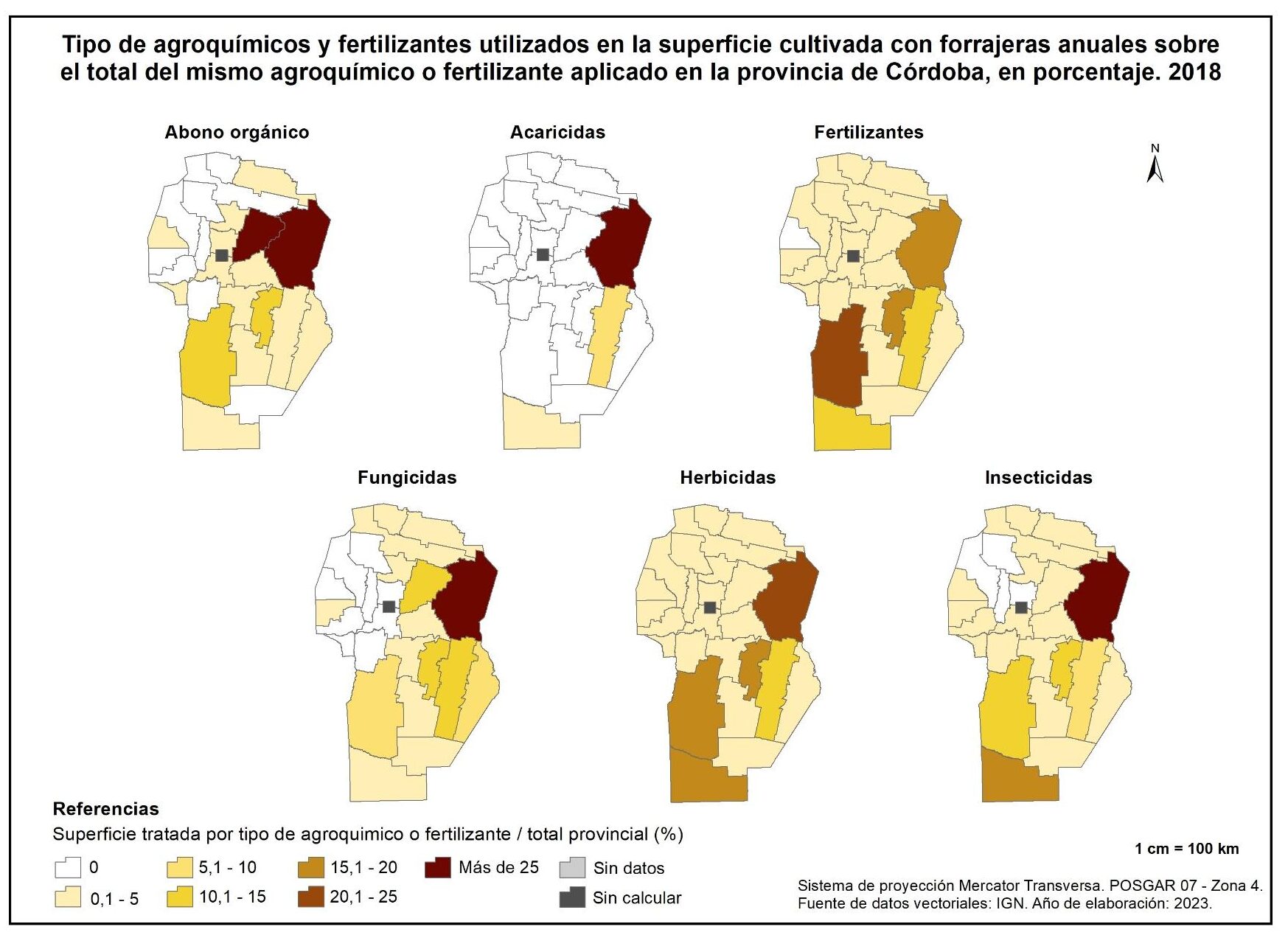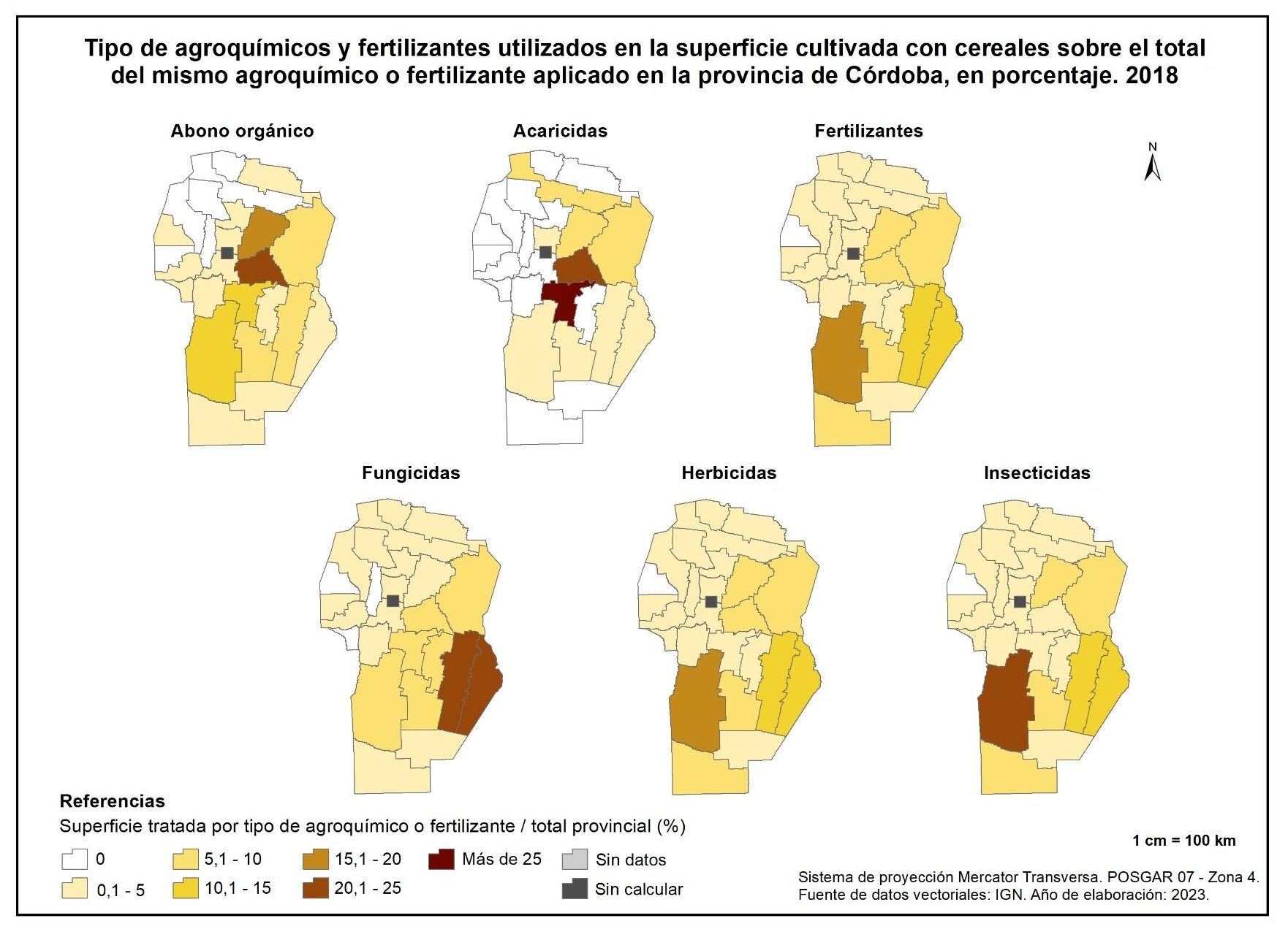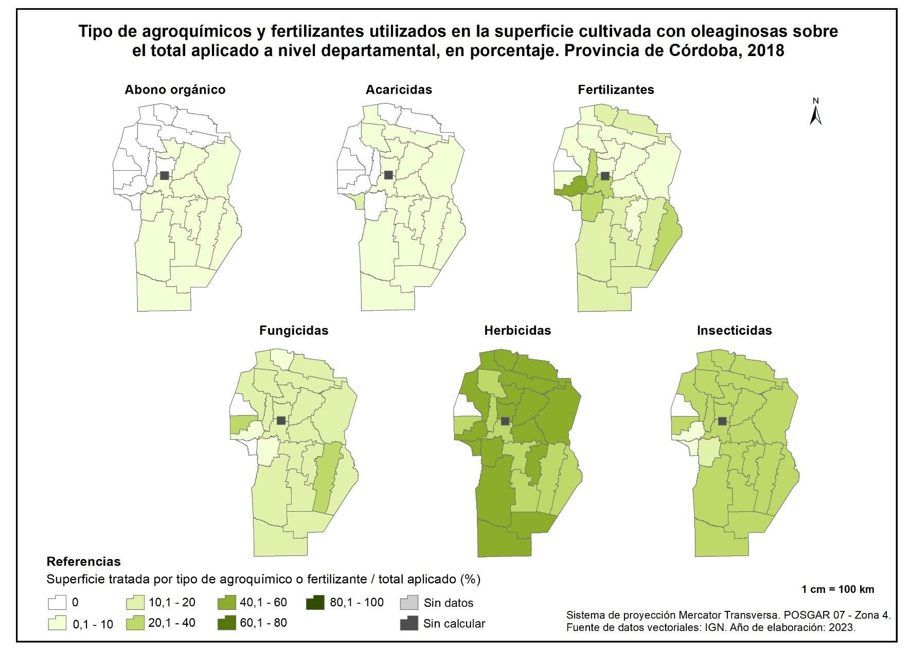 La aplicación de fertilizantes se concentra mayormente en Ischilín y Cruz del Eje con porcentajes del 45 y 25% respectivamente, mientras que los fungicidas se aplican esencialmente en San Javier (72%).