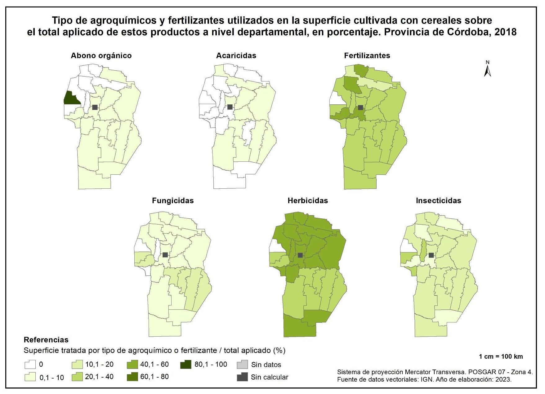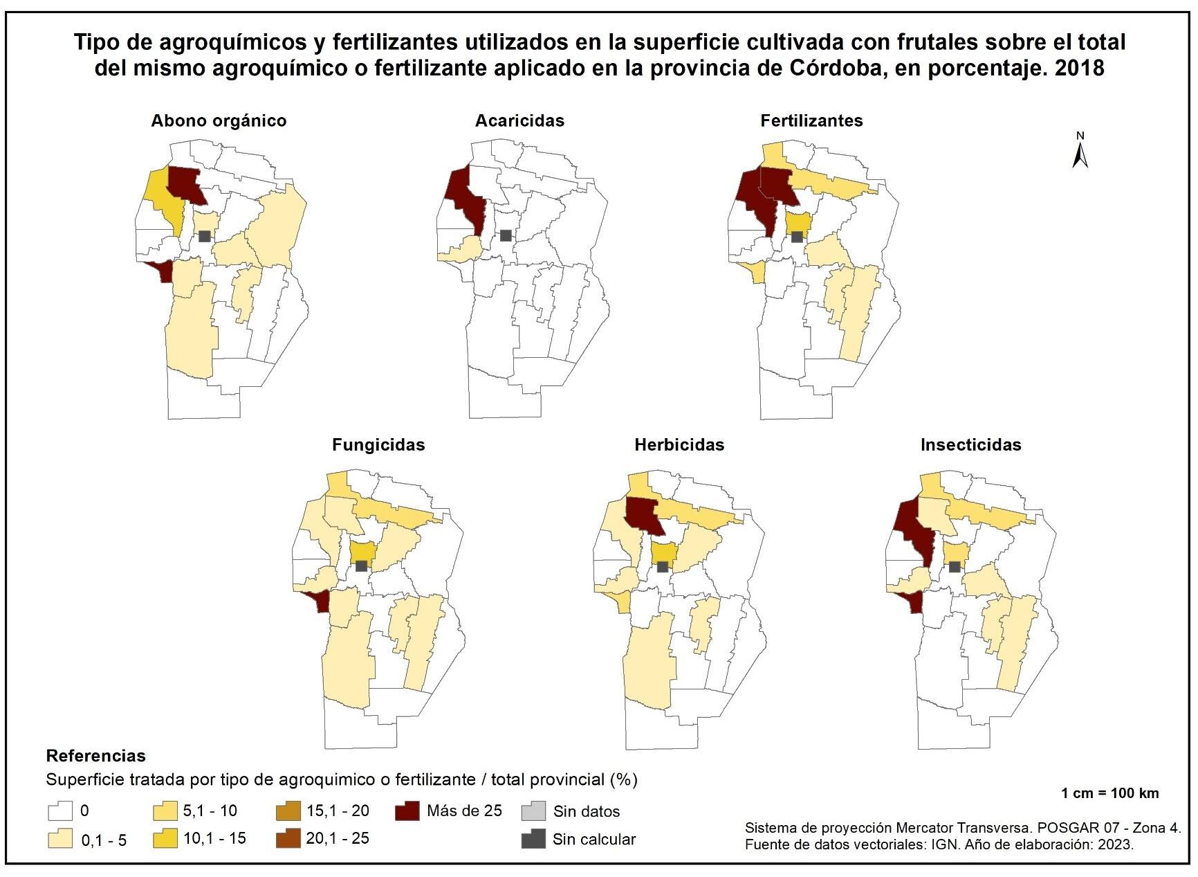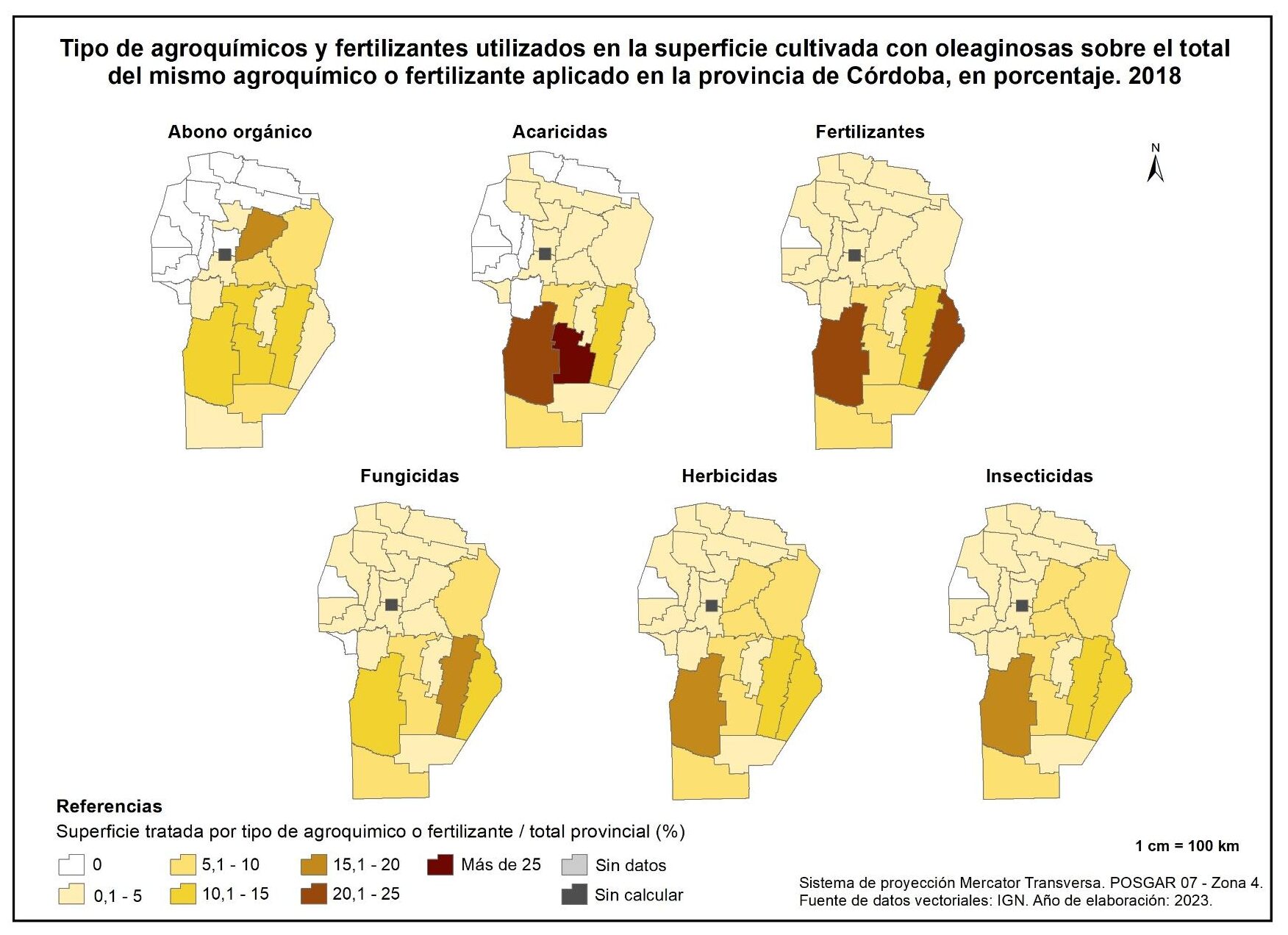 La aplicación de fertilizantes se concentra mayormente en Ischilín y Cruz del Eje con porcentajes del 45 y 25% respectivamente, mientras que los fungicidas se aplican esencialmente en San Javier (72%).