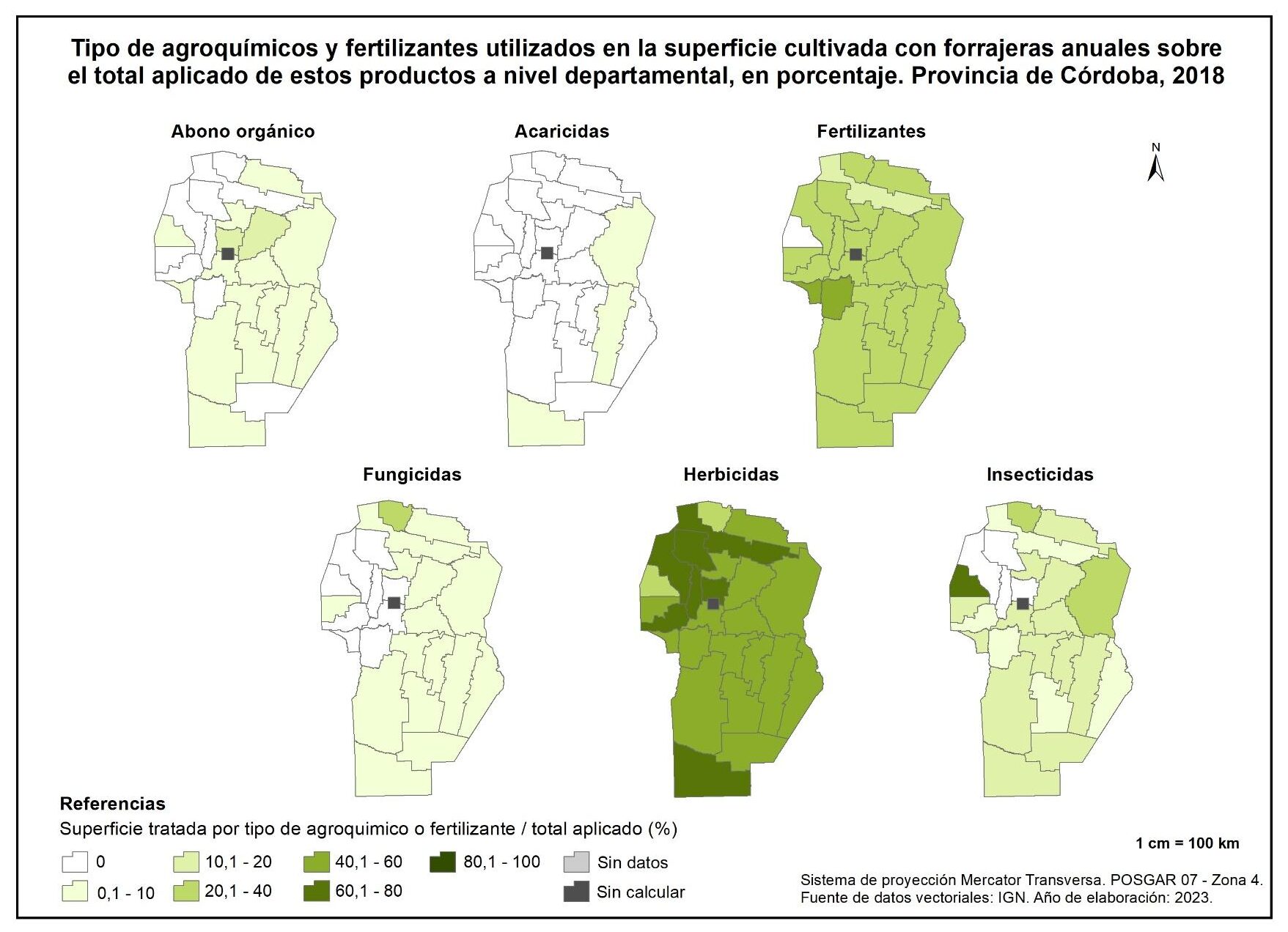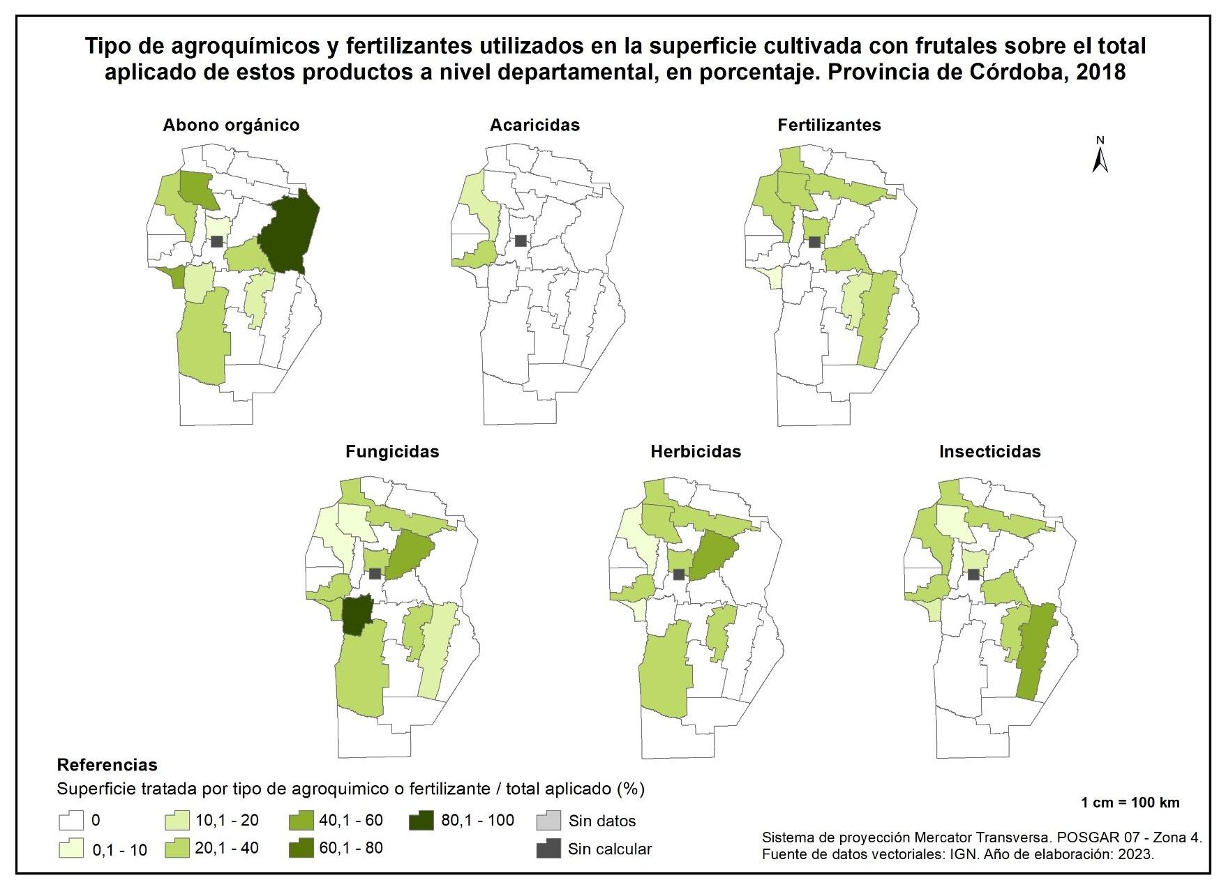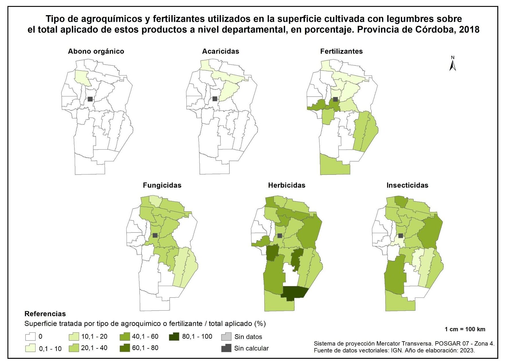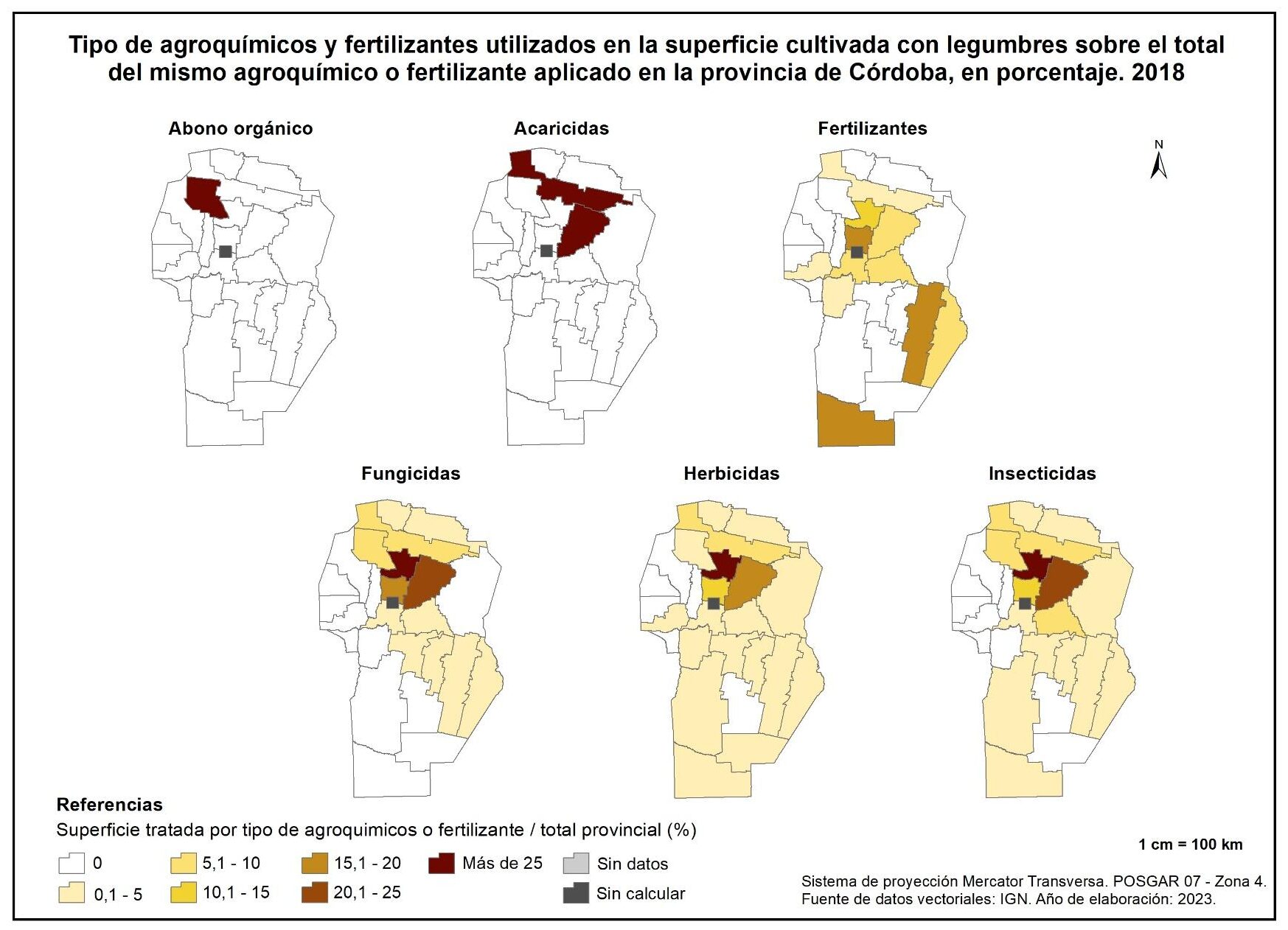De esta manera, Ischilín es el único departamento en el que se aplica abono orgánico en legumbres. Con relación a los acaricidas, los departamentos de Tulumba y Río Primero concentran el 100% del total aplicado, mientras que los fertilizantes registran mayores aportes en Colón, Unión y General Roca, con valores de entre el 15 y 20%.