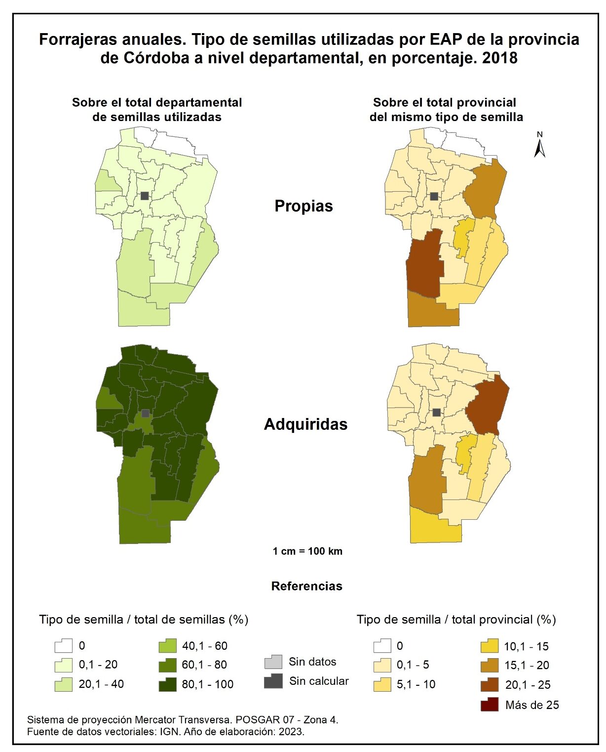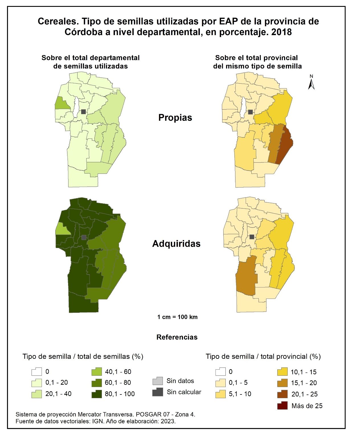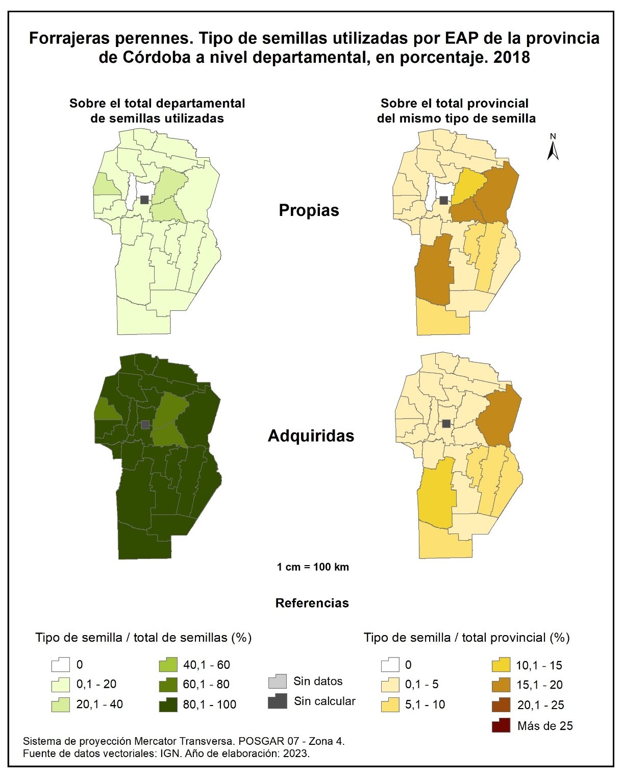 Con relación a la participación del tipo de semillas utilizadas para cereales en EAP sobre el total departamental de semillas utilizadas en 2018 (figura 3.98, columna izquierda) detenta el 22% en lo que respecta a las semillas propias, mientras que para semillas adquiridas el promedio alcanza el 78%. Casi toda la provincia registra entre el 80 y 100% de participación de las semillas de cereales adquiridas, a excepción de los departamentos del este y de Minas. En tanto que las semillas propias sobresalen, aunque en menor porcentaje, en los departamentos del este cordobés, con valores que no superan el 32%, y en Minas con el 50%.
