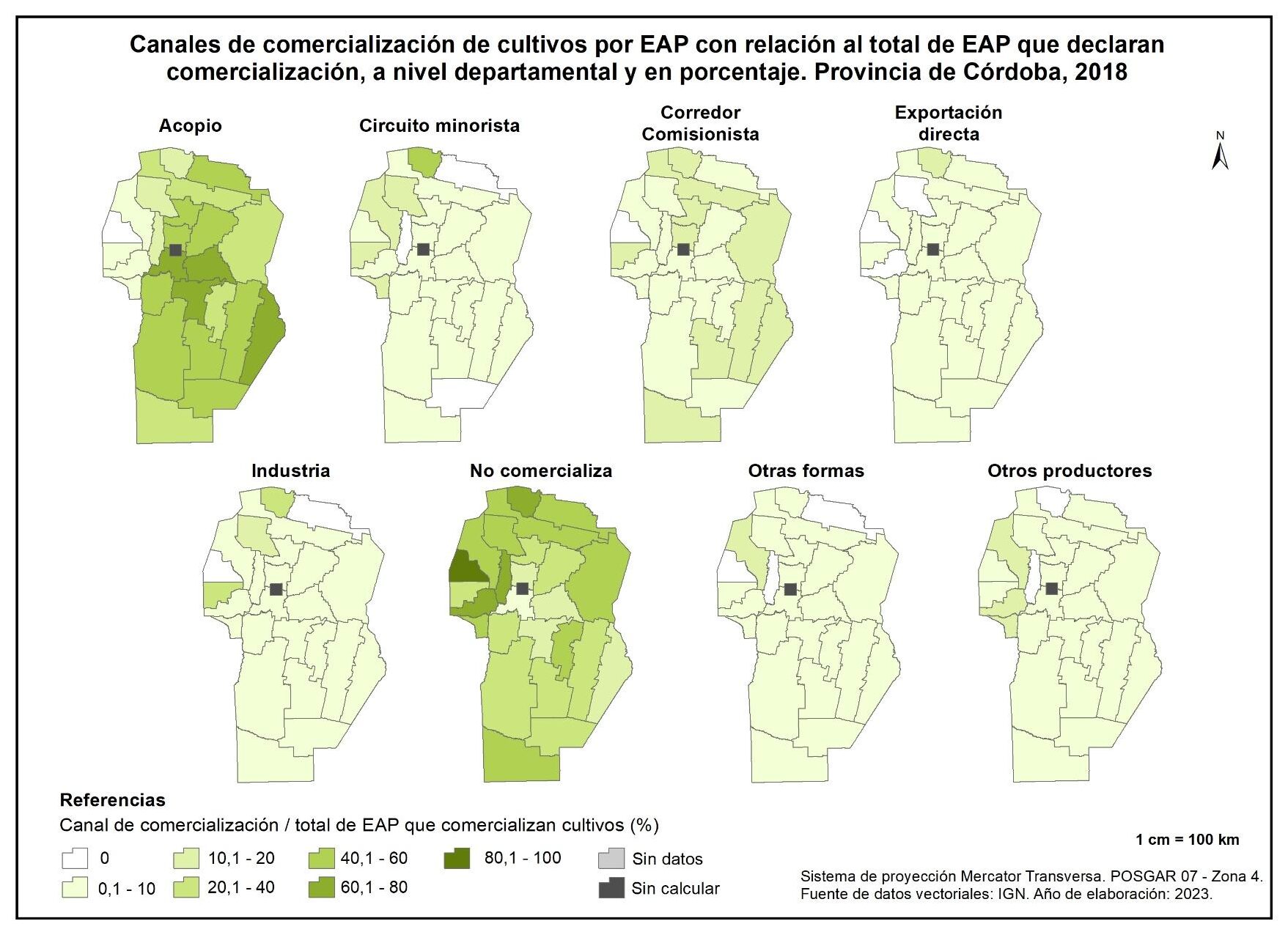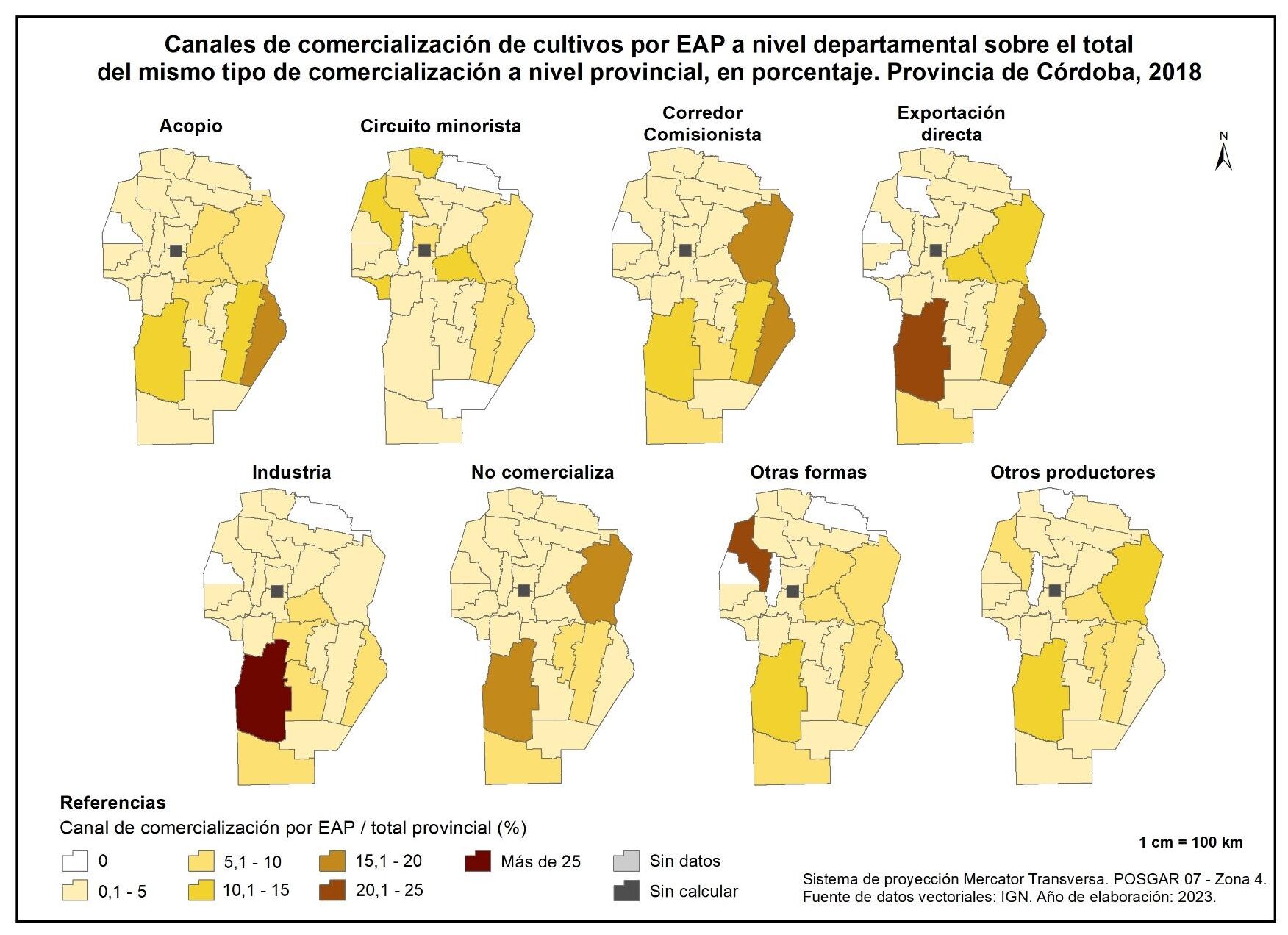 Este subapartado se refiere a la comercialización de los cultivos realizados en la provincia de Córdoba y se compone de dos mapas que recuperan, para el año 2018, los resultados vinculados a la participación relativa de cada tipo de comercialización identificada en el CNA: acopio, circuito minorista, corredor comisionista, exportación directa, industria, con otros productores, otras formas de comercialización y no comercialización.