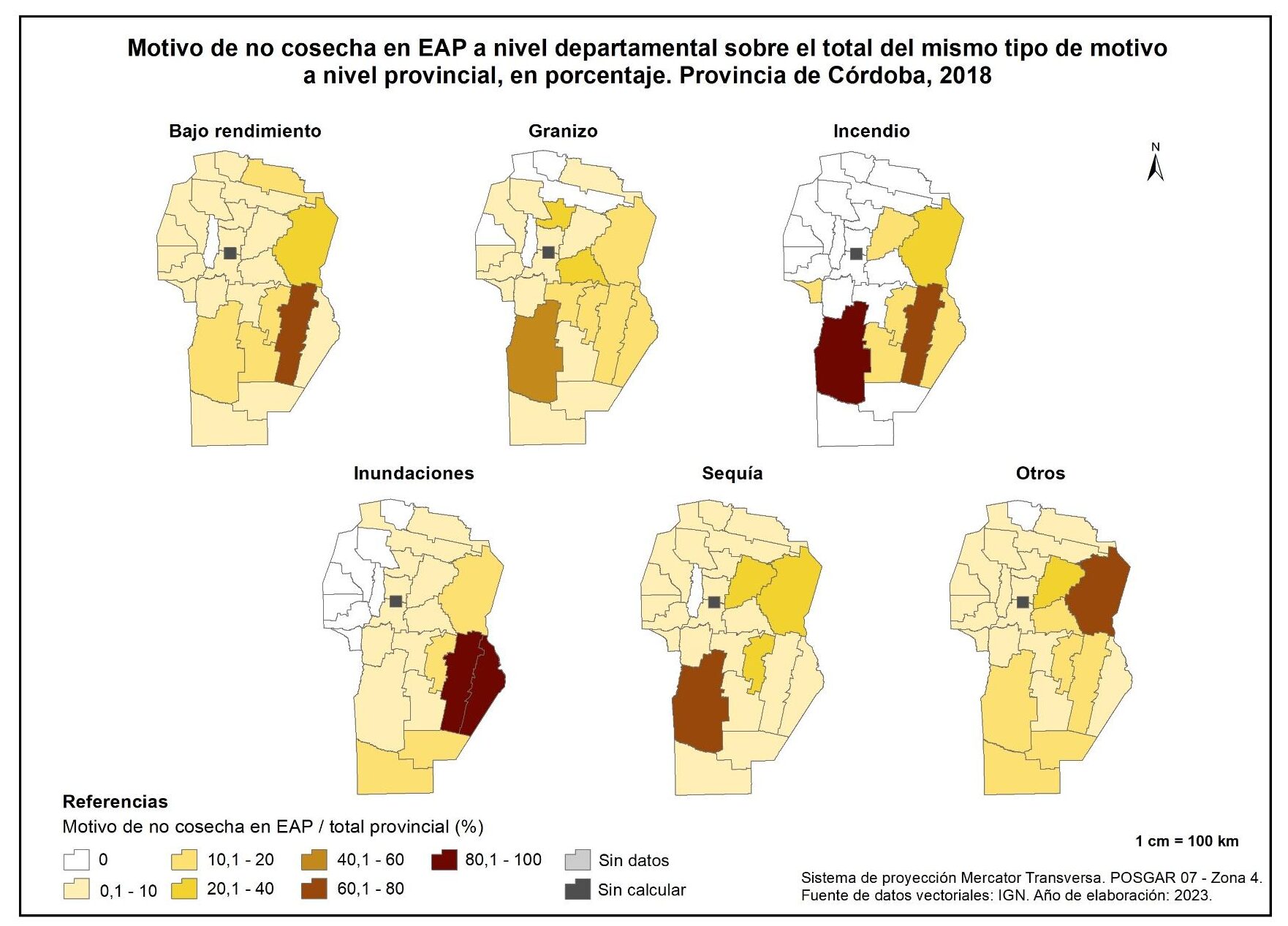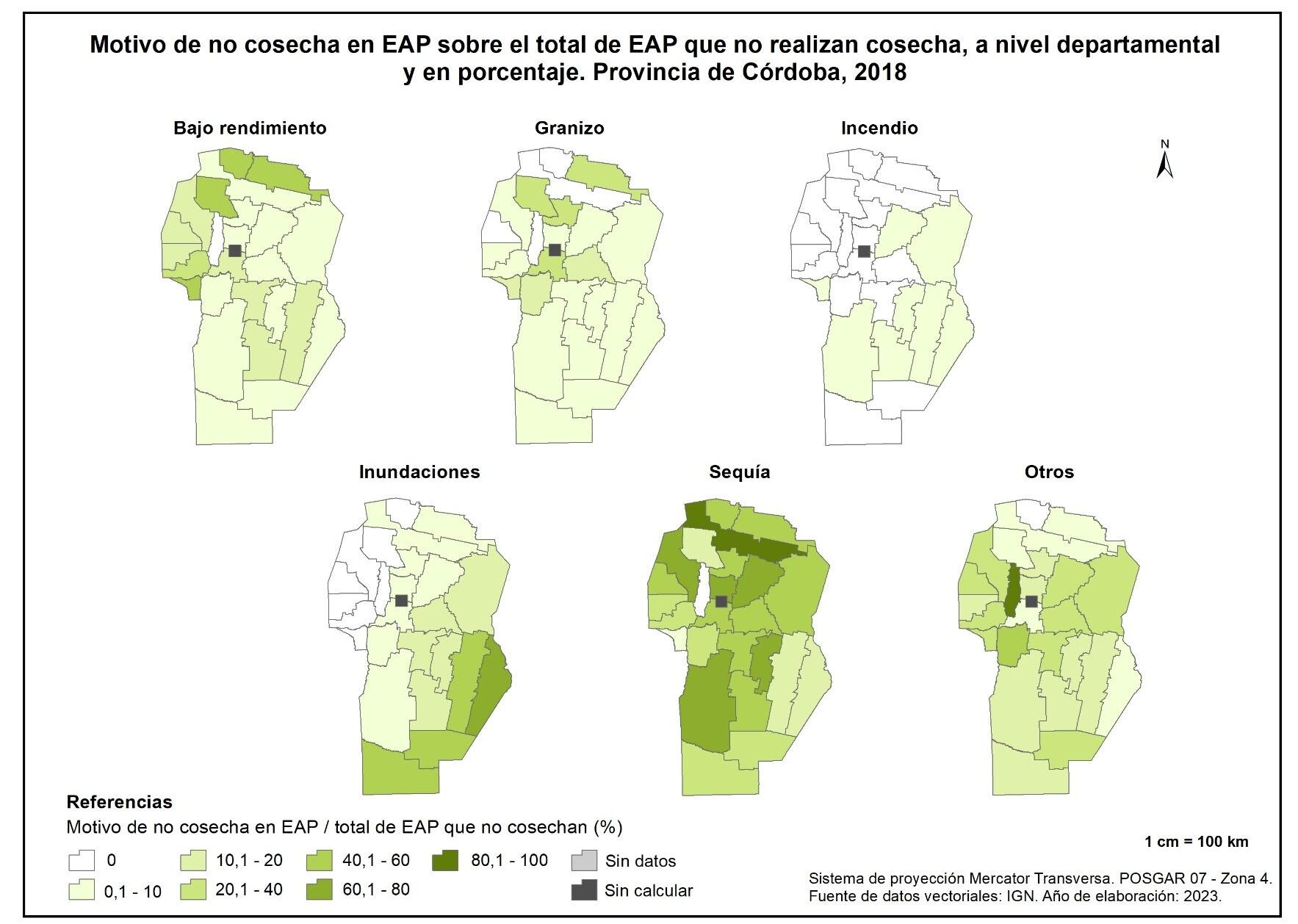 El último subapartado de este capítulo vinculado a agricultura incorpora la representación cartográfica y el análisis de los motivos de no cosecha, en el año 2018, en la provincia de Córdoba.
