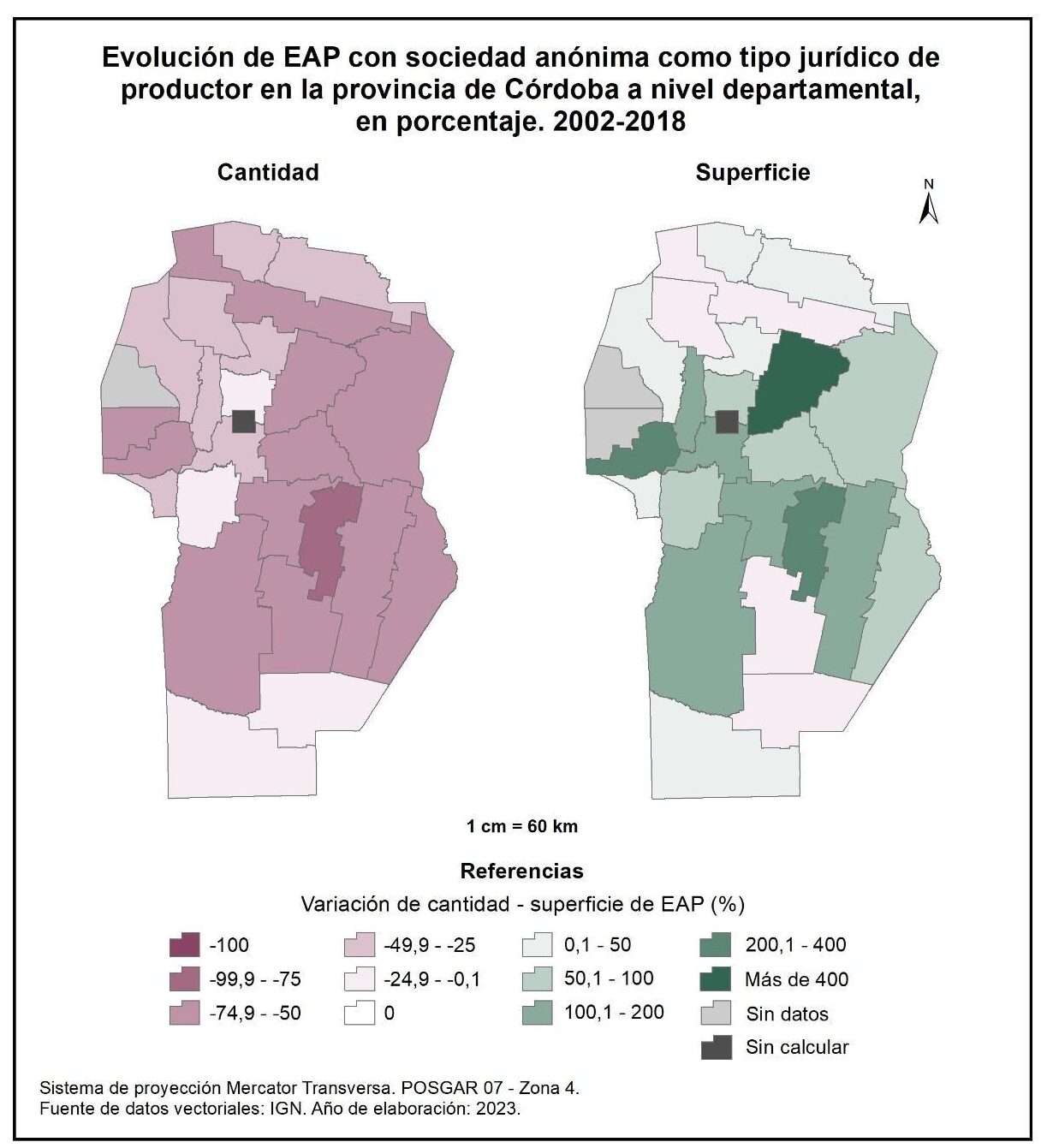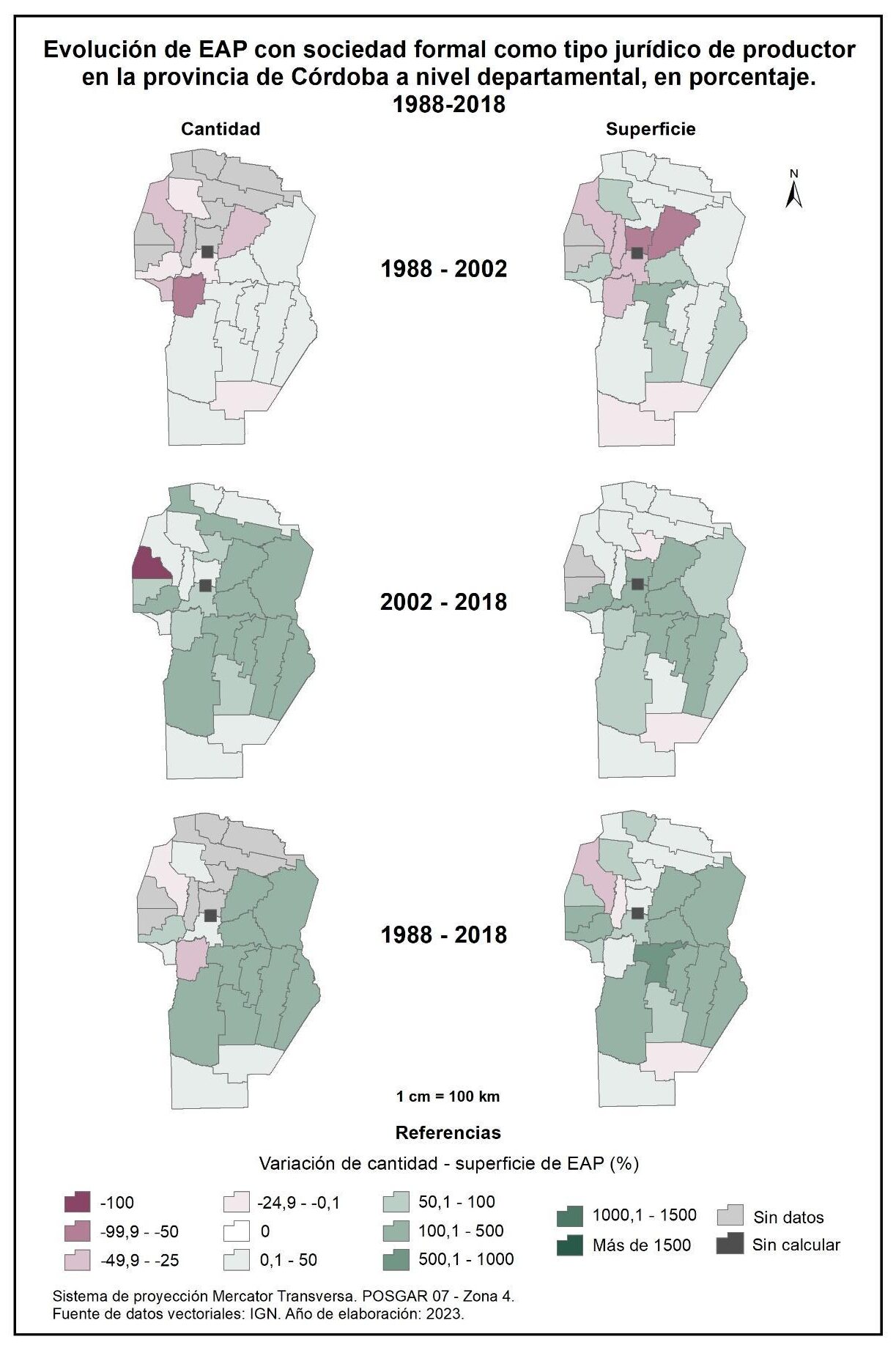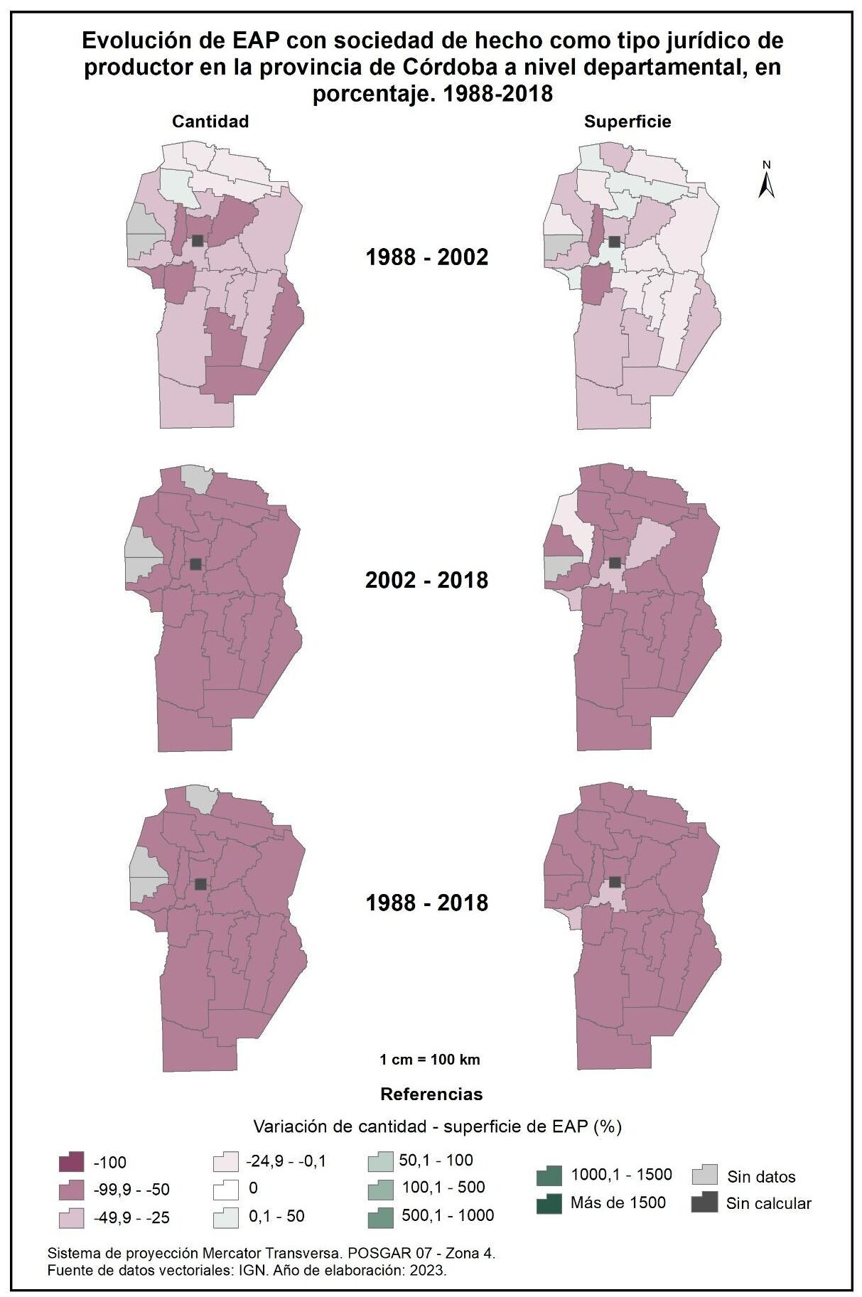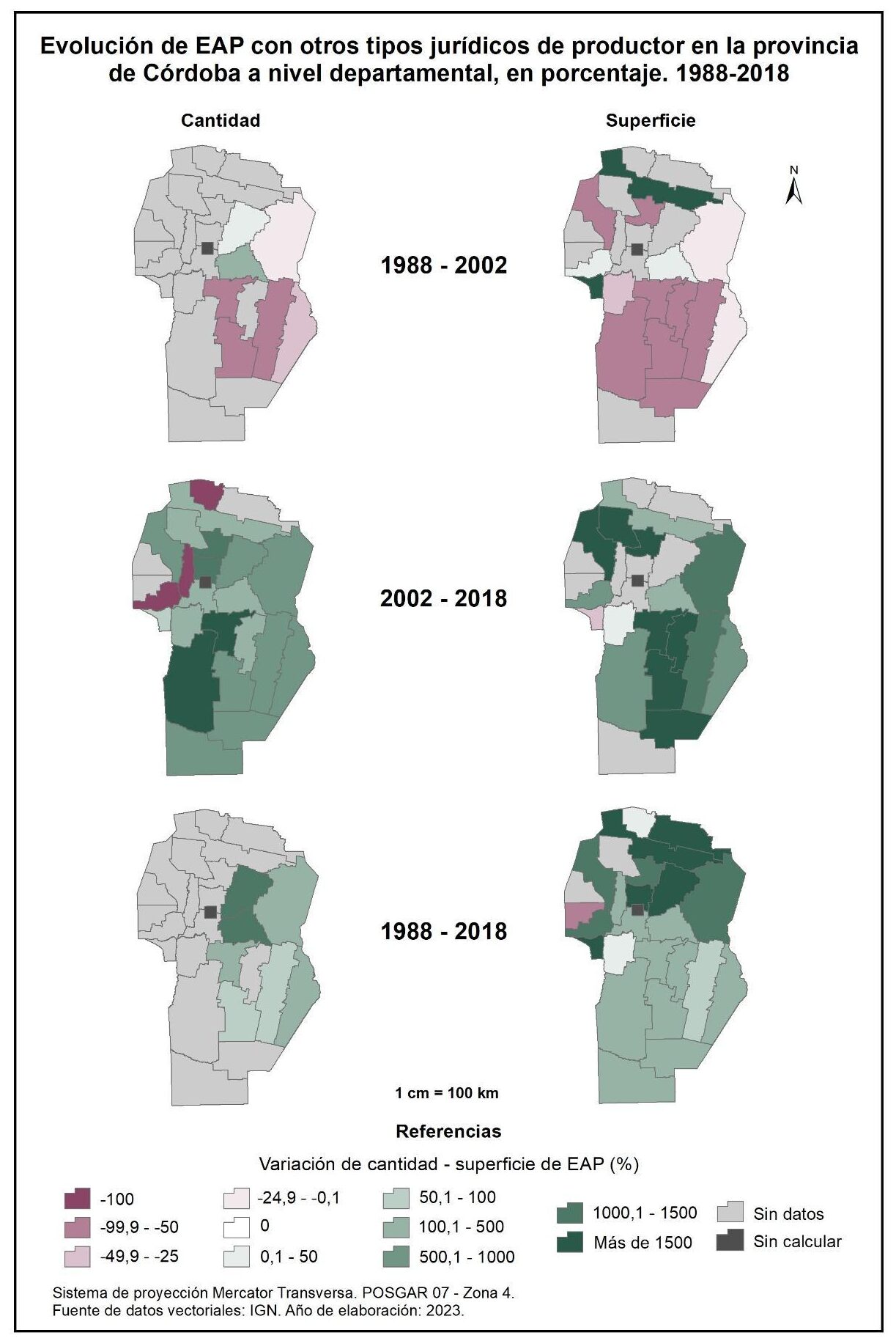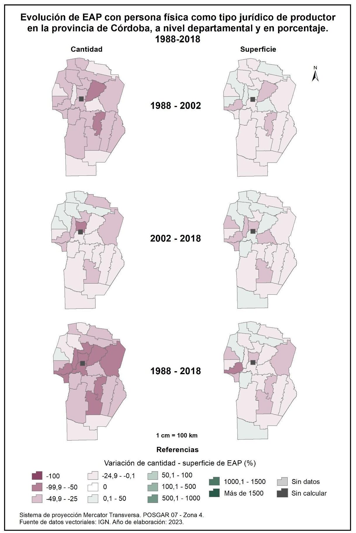 Por tanto, en la totalidad del corte temporal analizado la mayor parte de la provincia muestra una disminución en la superficie de EAP con persona física como tipo jurídico de productor del orden del -15%; se destaca el departamento de San Alberto con el -53%, seguido por Minas, San Javier, Colón, San Justo, General San Martín y Juárez Celman con porcentajes de entre el -50 y -25%. En oposición, Sobremonte, Tulumba, Cruz del Eje, Calamuchita y General Roca registran un aumento de la superficie de EAP con persona física como tipo jurídico de productor con valores de entre el 0,1 y 50%.