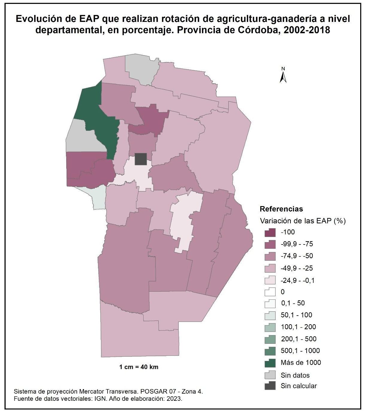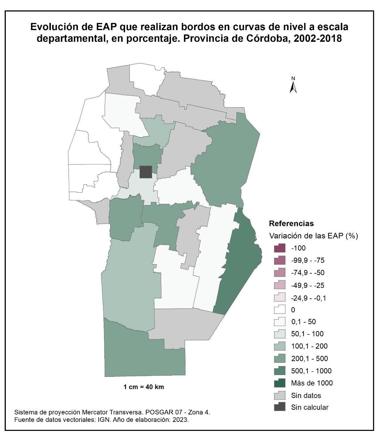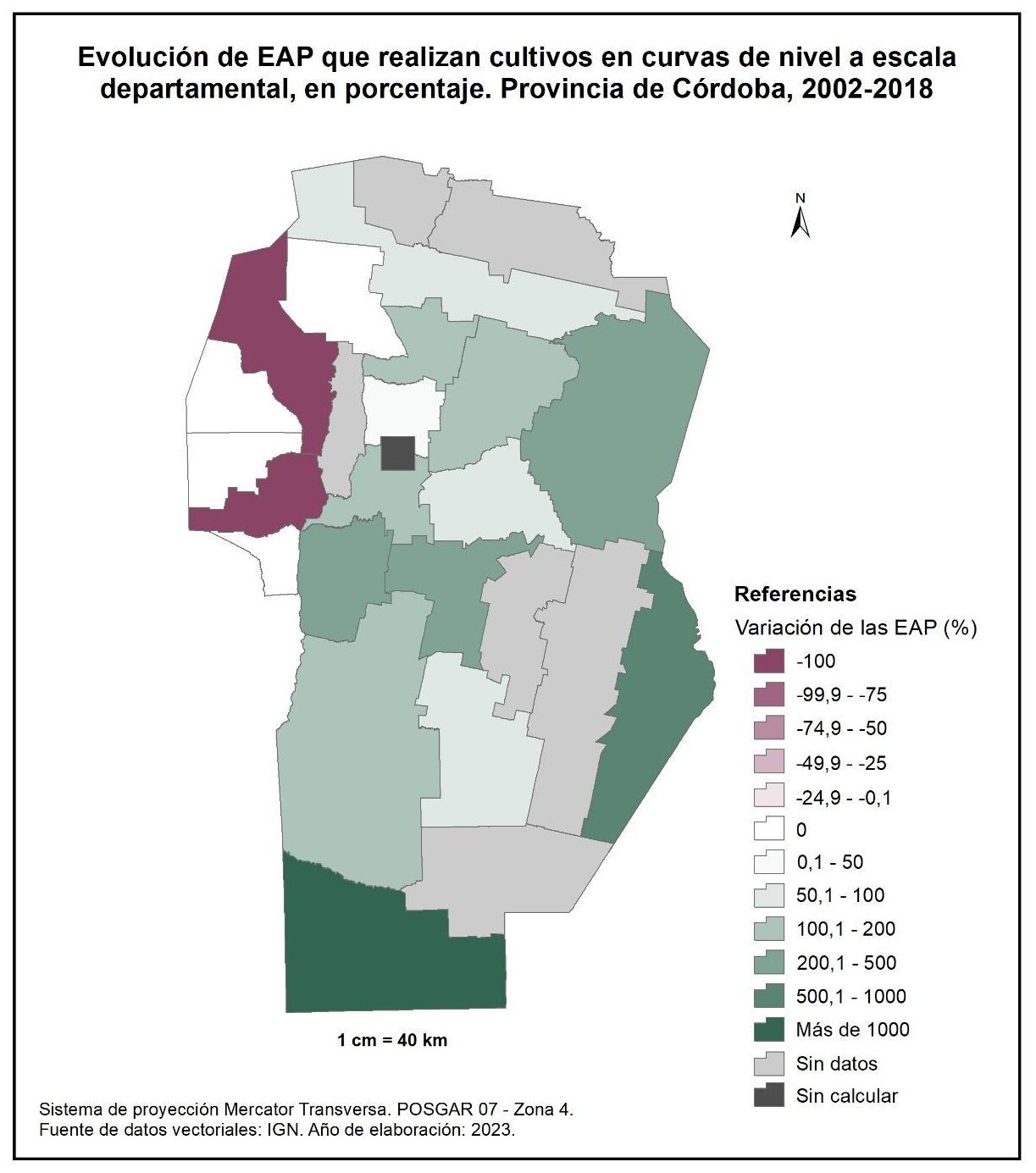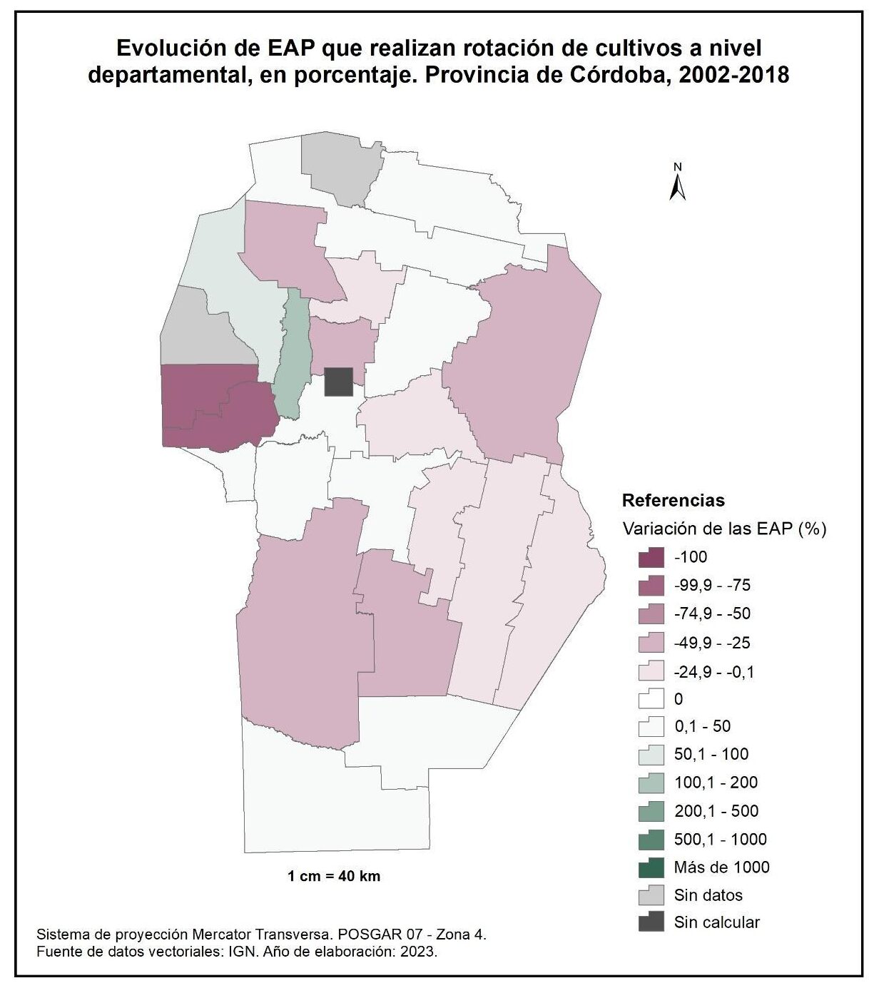 Por tanto, en la totalidad del corte temporal analizado la mayor parte de la provincia muestra una disminución en la superficie de EAP con persona física como tipo jurídico de productor del orden del -15%; se destaca el departamento de San Alberto con el -53%, seguido por Minas, San Javier, Colón, San Justo, General San Martín y Juárez Celman con porcentajes de entre el -50 y -25%. En oposición, Sobremonte, Tulumba, Cruz del Eje, Calamuchita y General Roca registran un aumento de la superficie de EAP con persona física como tipo jurídico de productor con valores de entre el 0,1 y 50%.