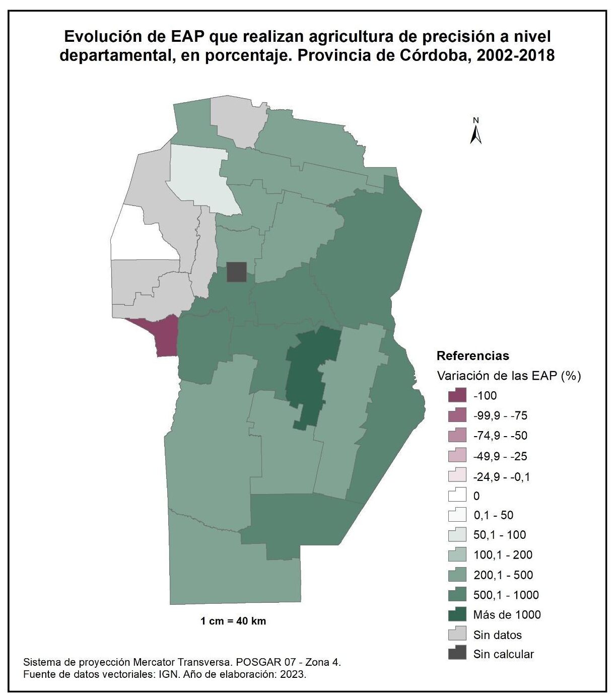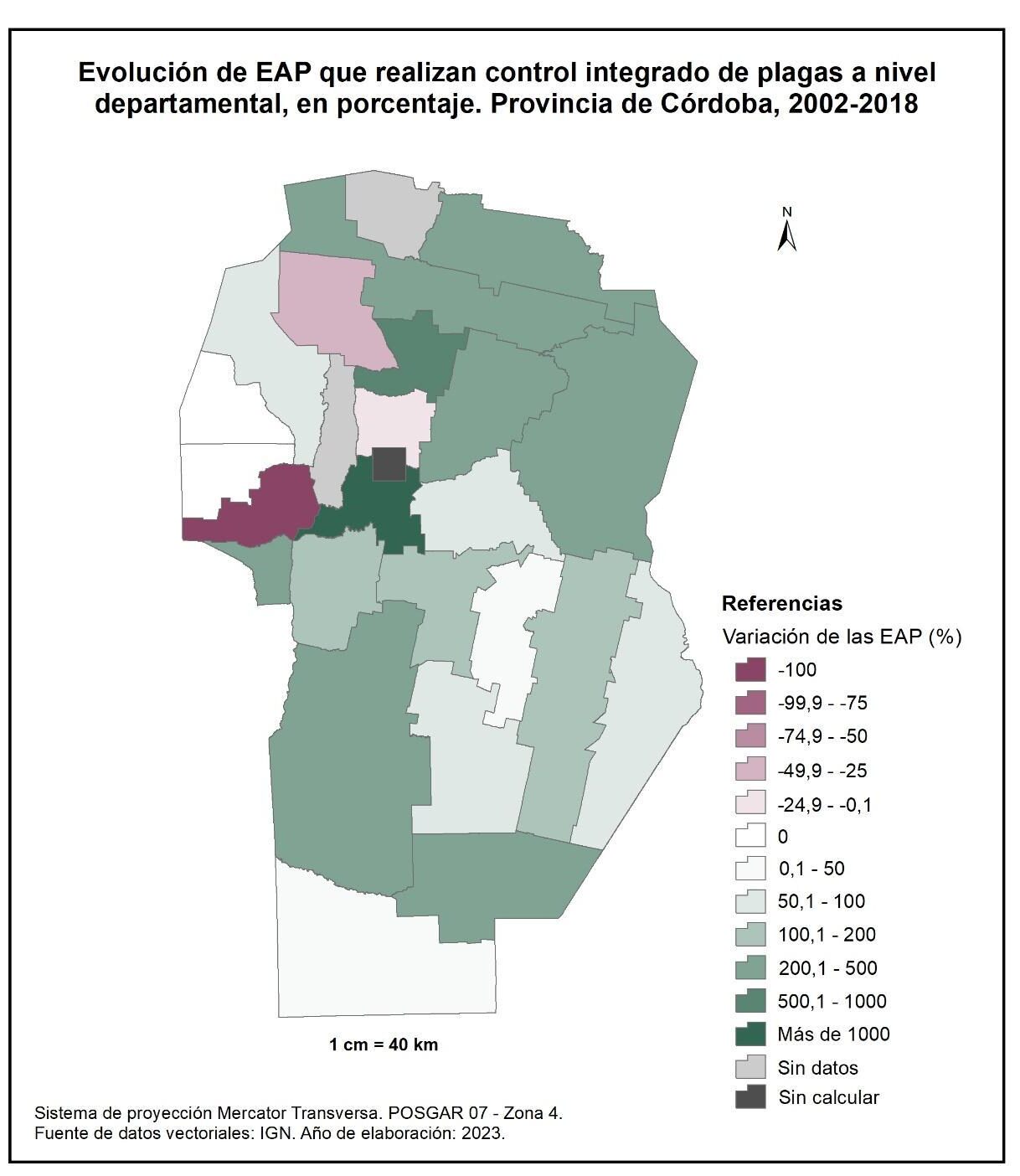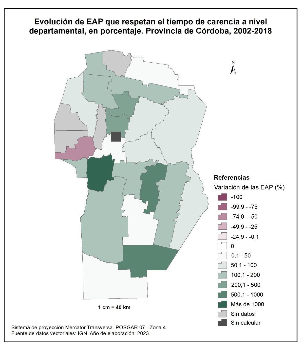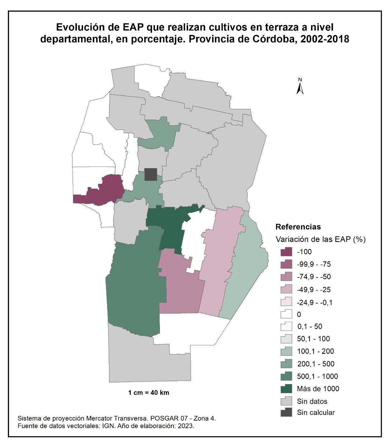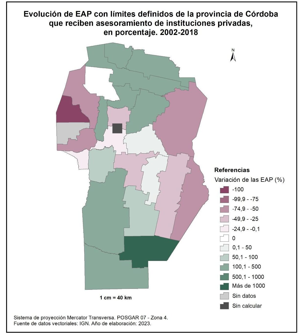 Por tanto, en la totalidad del corte temporal analizado la mayor parte de la provincia muestra una disminución en la superficie de EAP con persona física como tipo jurídico de productor del orden del -15%; se destaca el departamento de San Alberto con el -53%, seguido por Minas, San Javier, Colón, San Justo, General San Martín y Juárez Celman con porcentajes de entre el -50 y -25%. En oposición, Sobremonte, Tulumba, Cruz del Eje, Calamuchita y General Roca registran un aumento de la superficie de EAP con persona física como tipo jurídico de productor con valores de entre el 0,1 y 50%.