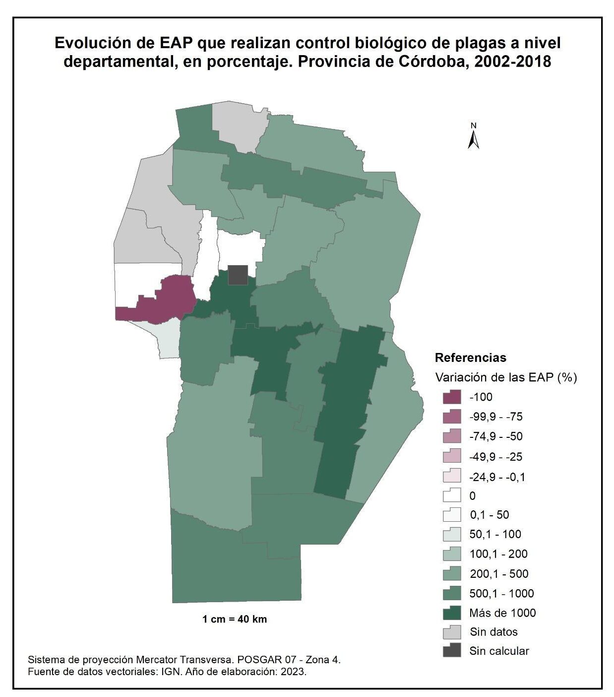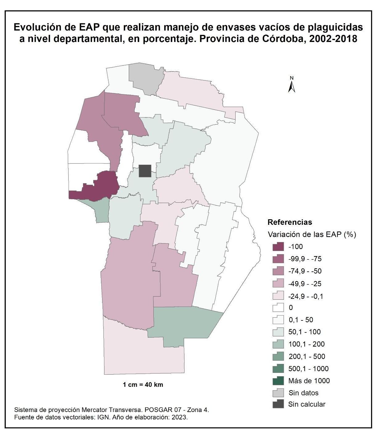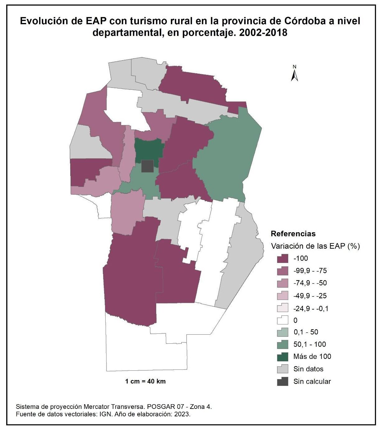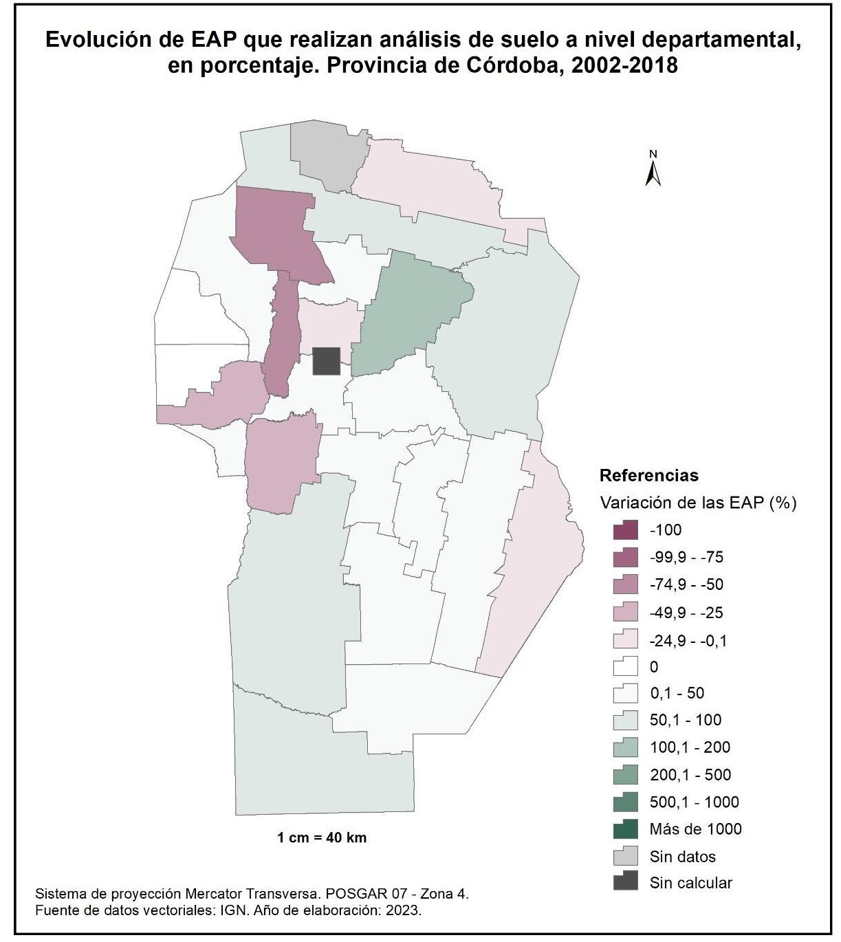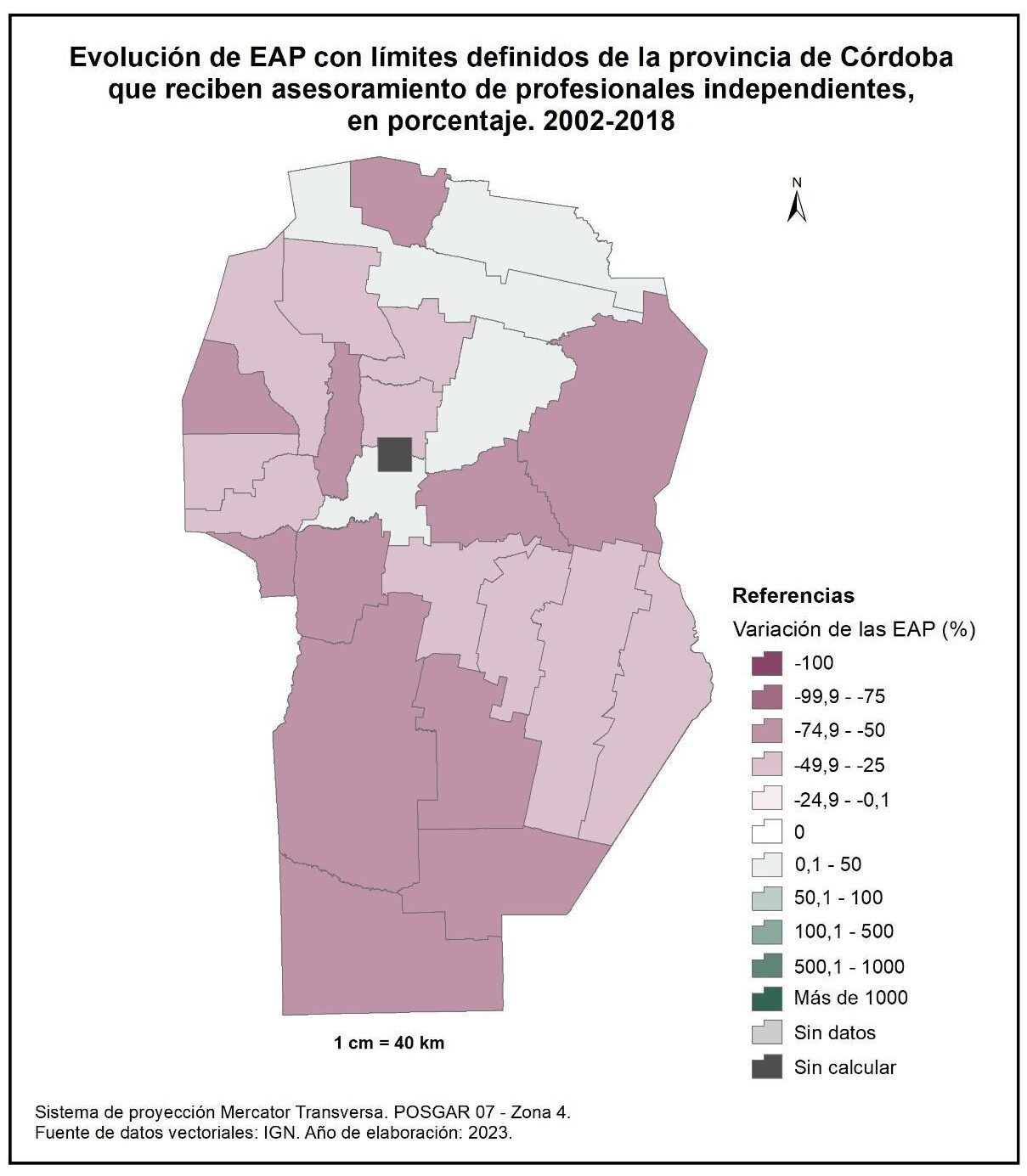 Por tanto, en la totalidad del corte temporal analizado la mayor parte de la provincia muestra una disminución en la superficie de EAP con persona física como tipo jurídico de productor del orden del -15%; se destaca el departamento de San Alberto con el -53%, seguido por Minas, San Javier, Colón, San Justo, General San Martín y Juárez Celman con porcentajes de entre el -50 y -25%. En oposición, Sobremonte, Tulumba, Cruz del Eje, Calamuchita y General Roca registran un aumento de la superficie de EAP con persona física como tipo jurídico de productor con valores de entre el 0,1 y 50%.