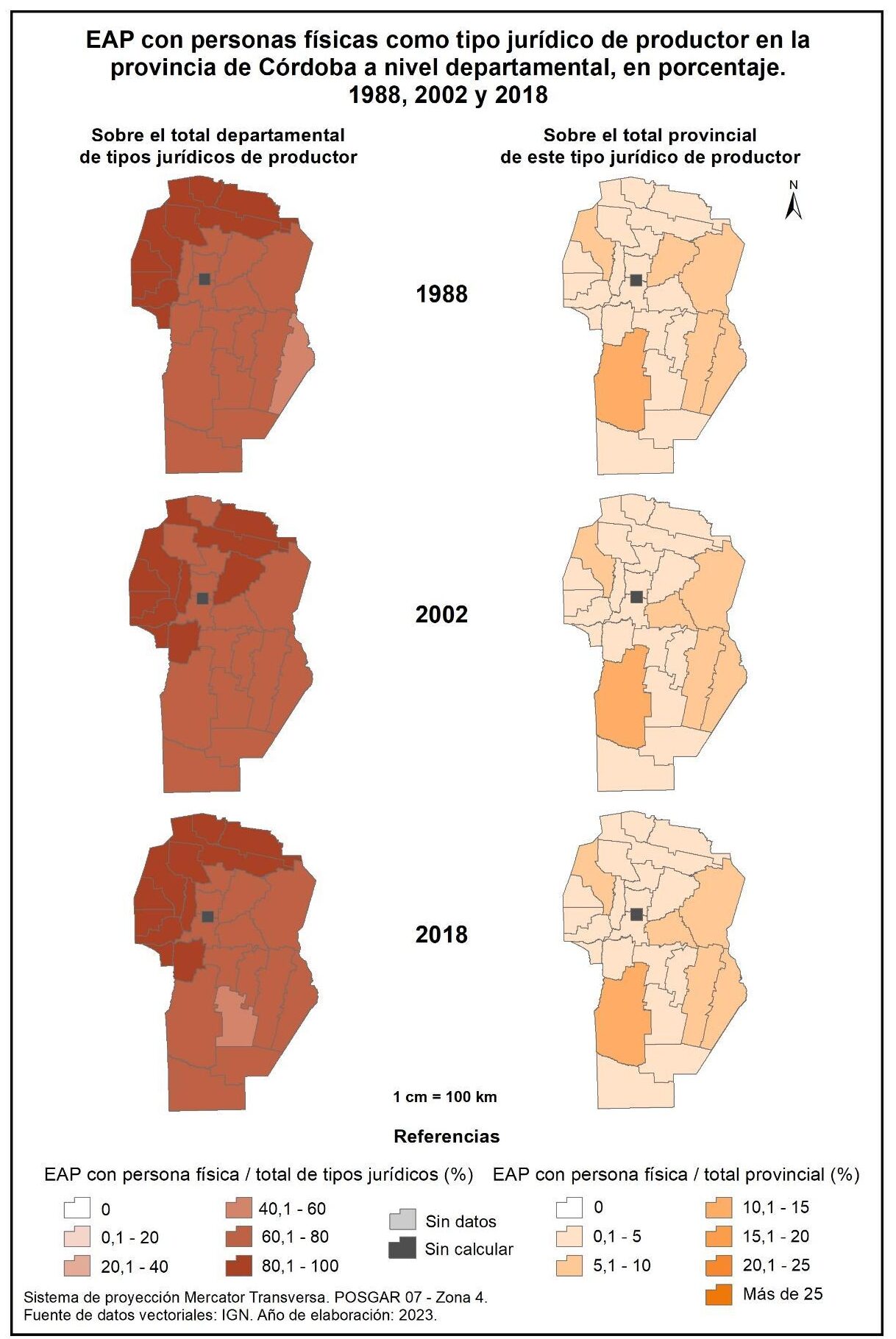 Figura 1.9. Evolución de EAP con persona física como tipo jurídico de productor en la provincia de Córdoba, a nivel departamental y en porcentaje. Años 1988, 2002 y 2018.