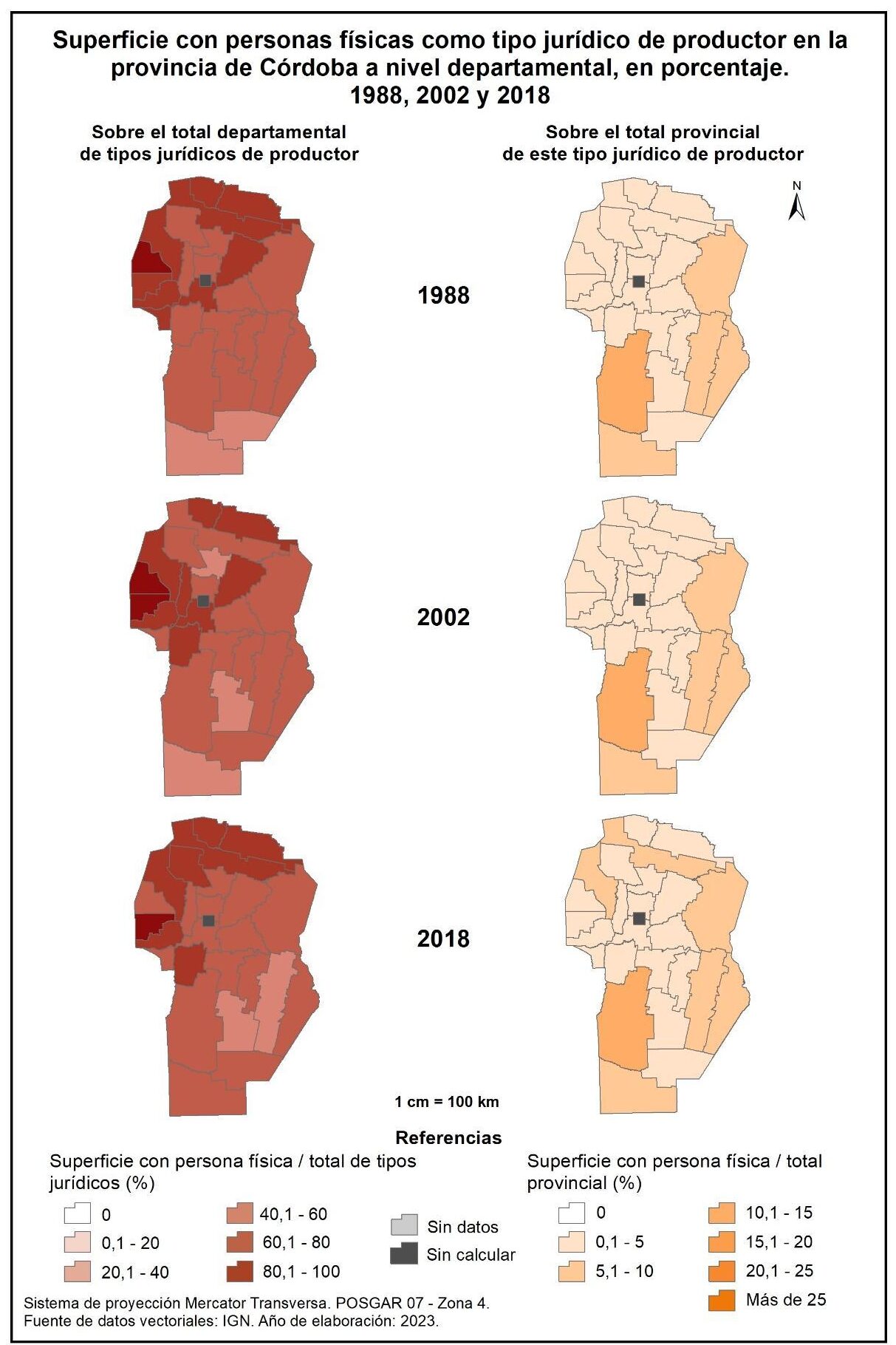 Figura 1.11. Superficie con personas físicas como tipo jurídico de productor en la provincia de Córdoba a nivel departamental, en porcentaje. Años 1988, 2002 y 2018.