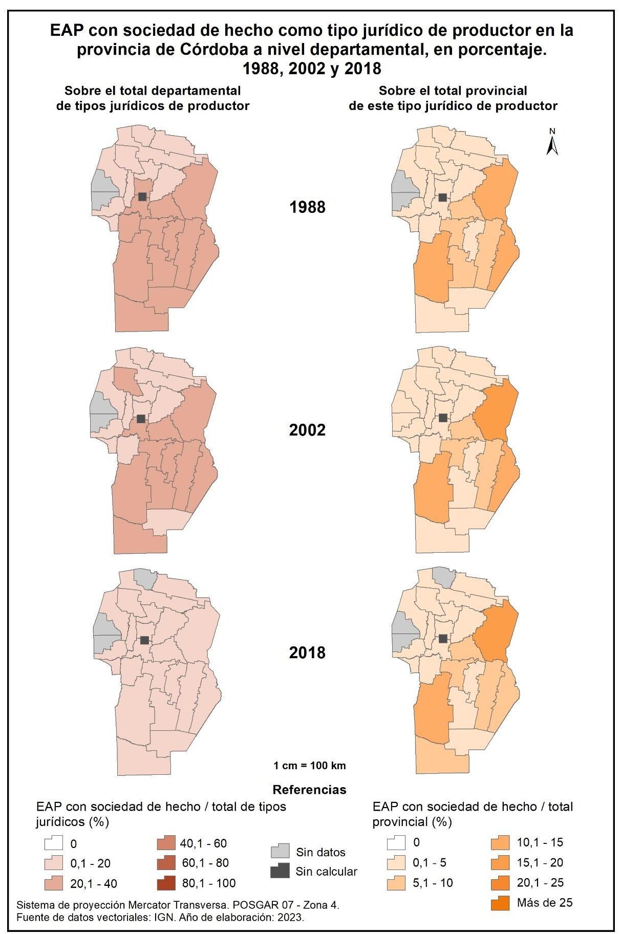 Figura 1.13. EAP con sociedad de hecho como tipo jurídico de productor en la provincia de Córdoba a nivel departamental, en porcentaje. Años 1988, 2002 y 2018.