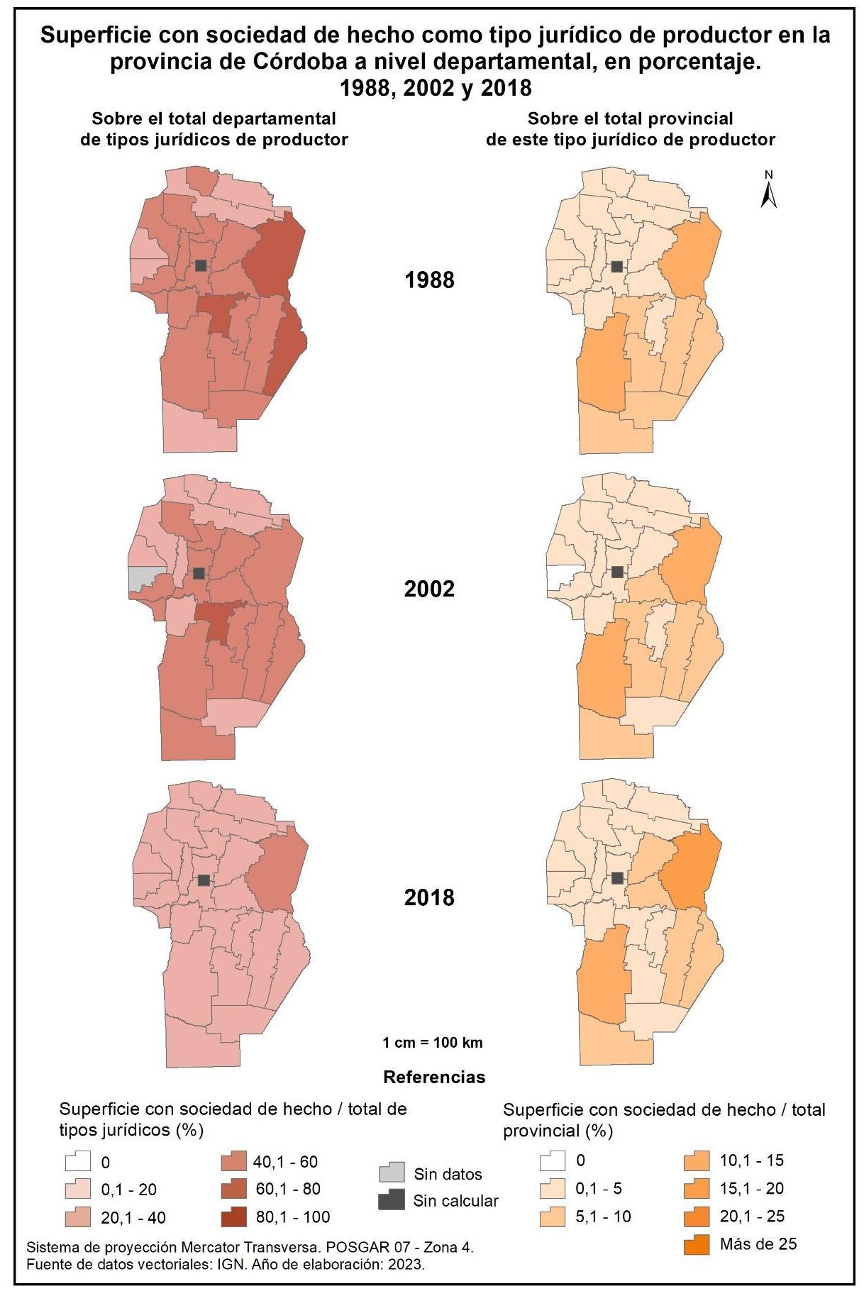 La participación de la superficie con sociedad formal como tipo jurídico de productor con respecto al total departamental de tipos jurídicos (figura 1.17, columna izquierda) alcanza el 16% en 1988, 20% en 2002 y 32% en 2018. En el primer censo, la mayor participación se registra en el norte y sur provincial, con valores en el rango del 20 al 40% en los departamentos de General Roca, Presidente Roque Sáenz Peña, Juárez Celman, Punilla, Colón, Totoral y Río Seco. En el resto la participación ronda entre el 0,1 y 20%. En 2002 se incrementa significativamente el número de departamentos del norte y sur provincial que registran una participación de entre el 20 y 40 %. Finalmente, en 2018, General Roca, Juárez Celman y Unión alcanzan el rango de entre el 40 y 60%. Por otro lado, algunos departamentos del norte, centro y oeste continúan mostrando una participación del 0,1 al 20%, específicamente Tulumba, Cruz del Eje, Minas, Pocho, Calamuchita y Tercero Arriba.