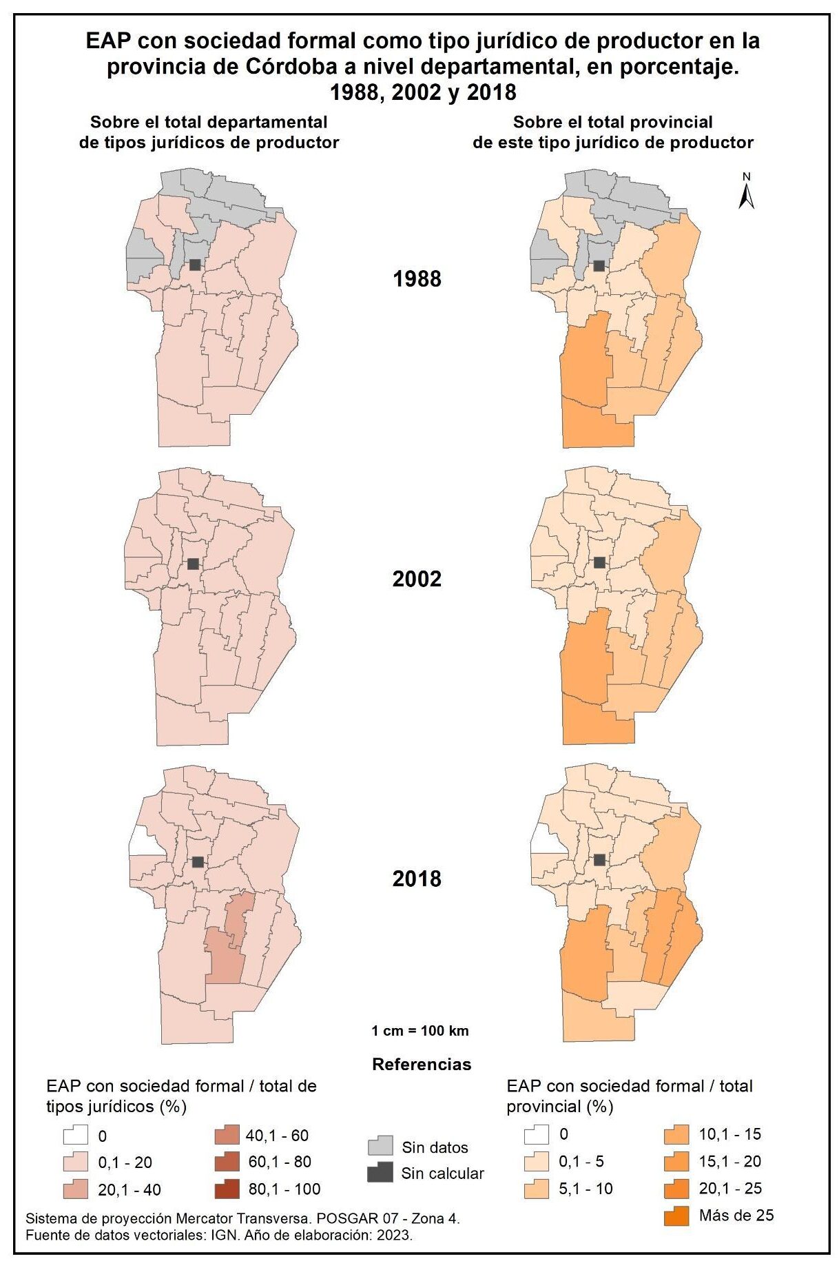 Figura 1.16. EAP con sociedad formal como tipo jurídico de productor en la provincia de Córdoba a nivel departamental, en porcentaje. Años 1988, 2002 y 2018.