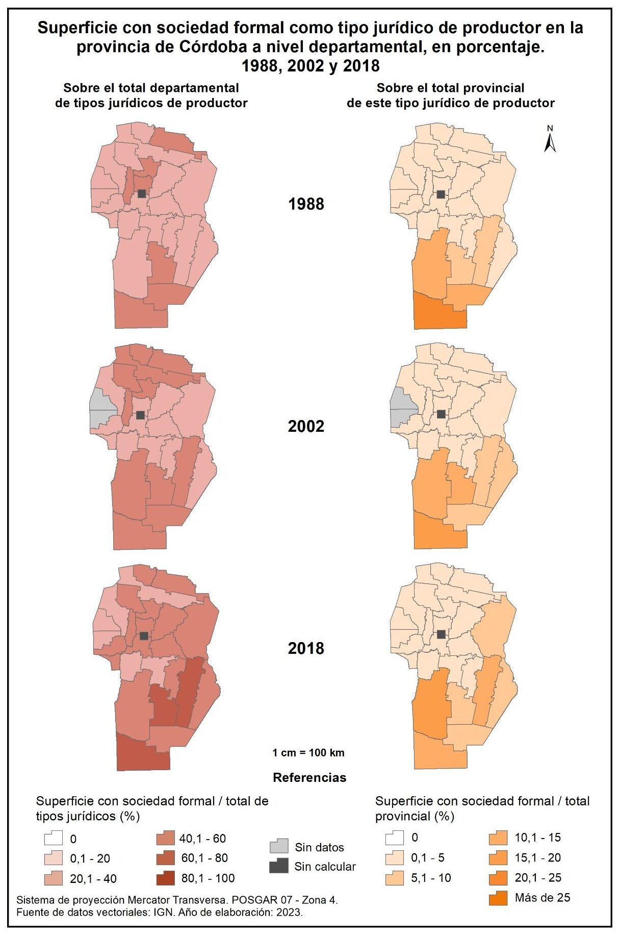 Figura 1.17. Superficie con sociedad formal como tipo jurídico de productor en la provincia de Córdoba a nivel departamental, en porcentaje. Años 1988, 2002 y 2018.