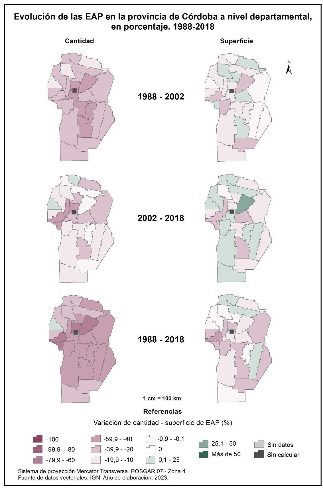 En lo que respecta a la superficie de las explotaciones, en el primer período intercensal se registra una disminución en torno al -10% en la mayor parte de los departamentos, en tanto que en Ischilín, Río Seco, Totoral, San Javier, Río Segundo y Juárez Celman esta aumenta levemente. Para el segundo período se desacelera la reducción de la superficie de EAP y varios departamentos invierten su tendencia; gran parte de ellos registran incrementos cercanos al 10% y, en el caso de Río Primero, al 40%. En cuanto al corte temporal total la mayoría de la provincia muestra una disminución en la superficie de EAP, con un valor promedio del -15%, a excepción de los departamentos Sobremonte, Tulumba y Unión que registran incrementos cercanos al 5%.