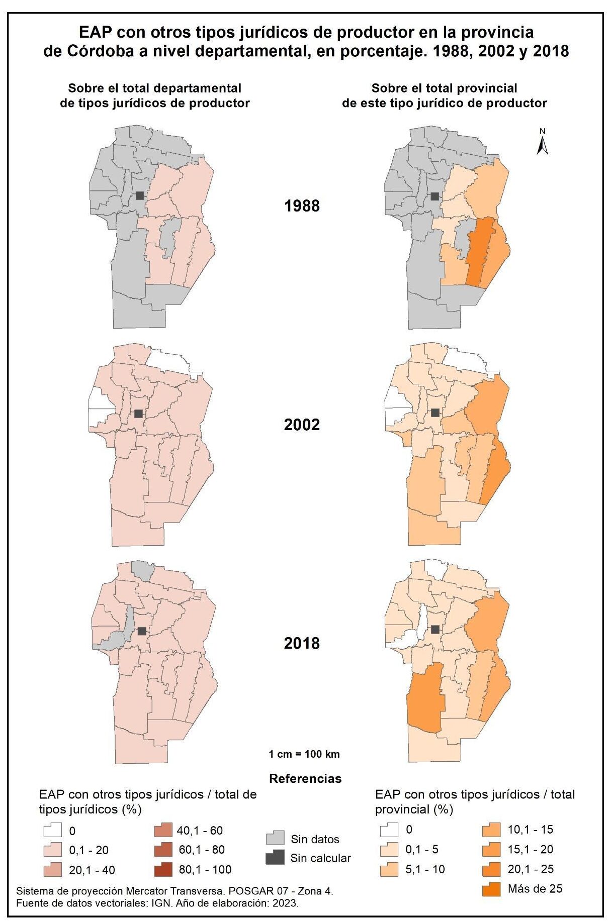 La participación de EAP con otros tipos jurídicos de productor con respecto al total departamental de tipos jurídicos (figura 1.19, columna izquierda) registra porcentajes bajos: menos del 1% en 1988 y 2002 y del 5% en 2018. Con respecto al año 1988, los valores porcentuales rondan entre el 2 y 1% en el este cordobés, mientras que para 2002 y 2018 el porcentaje de participación continúa con valores bajos (menos del 10%) en la totalidad de la provincia.