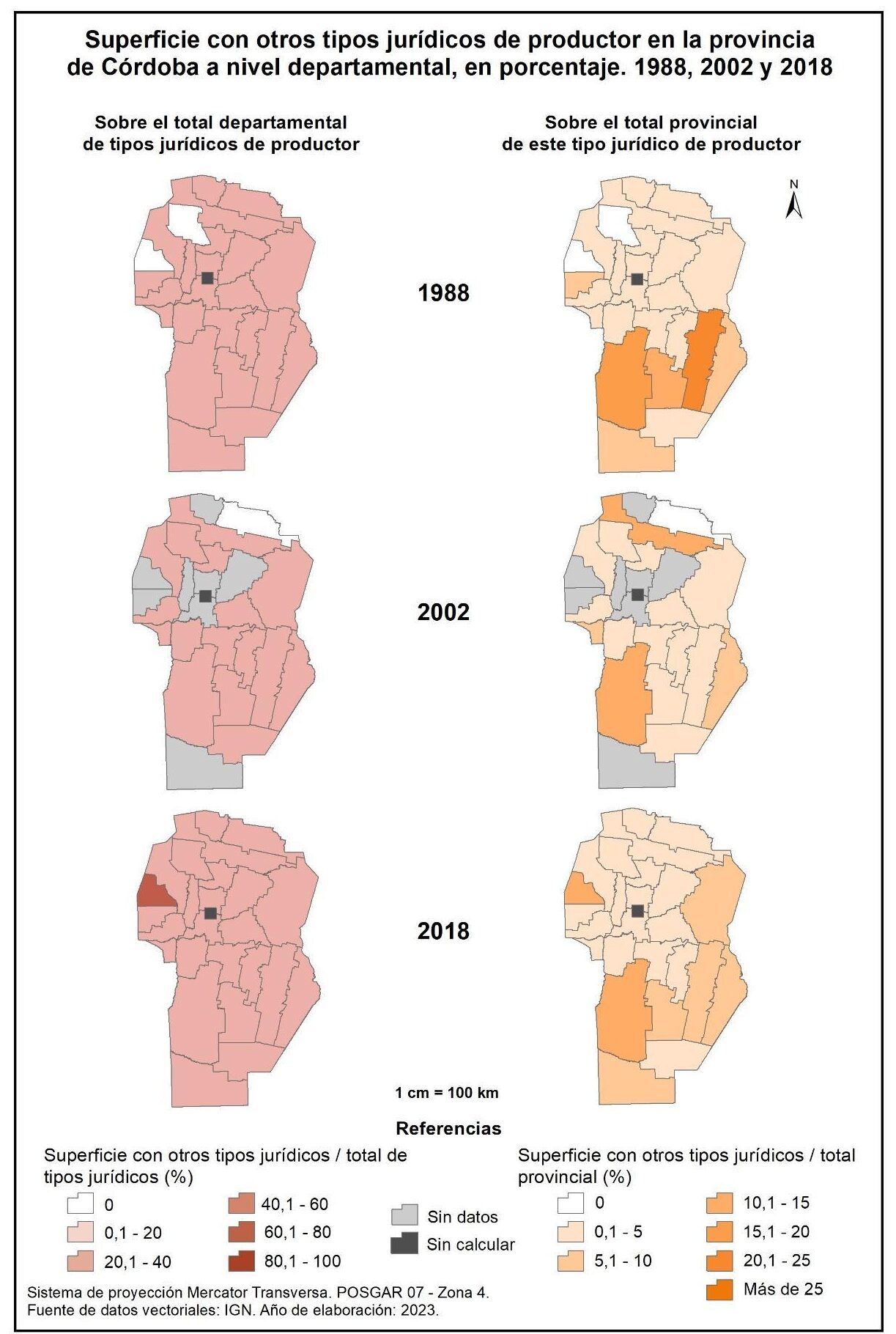 Figura 1.20. Superficie con otros tipos jurídicos de productor en la provincia de Córdoba a nivel departamental, en porcentaje. Años 1988, 2002 y 2018.