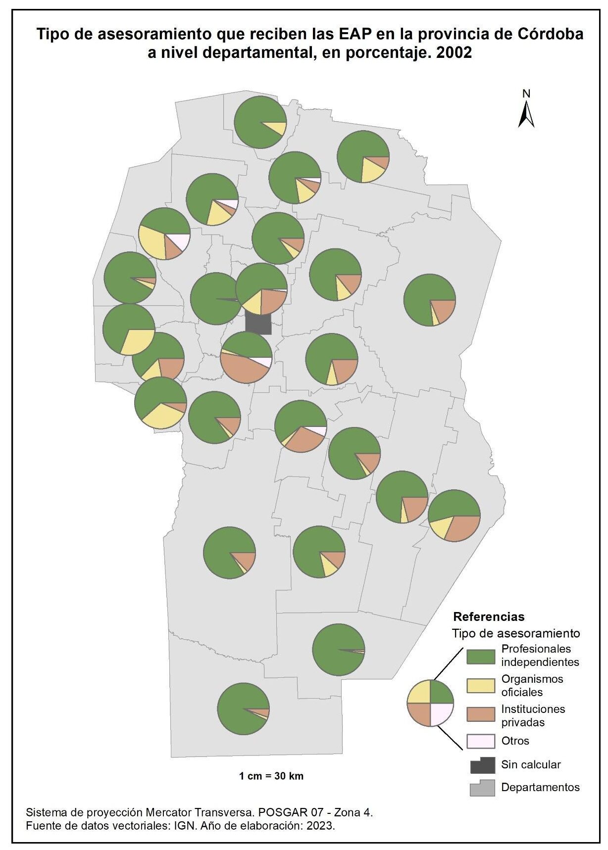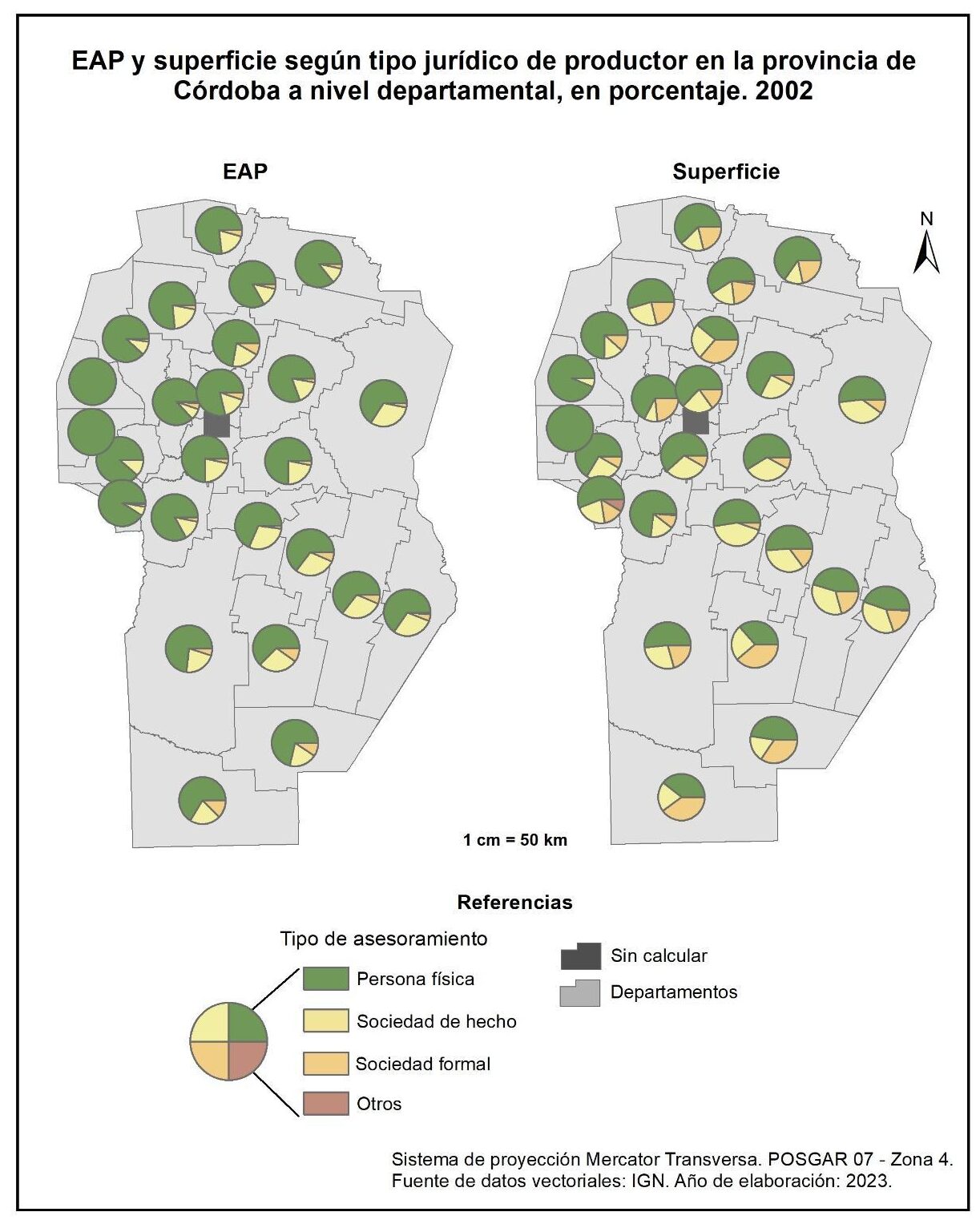 La cantidad relativa de EAP según el tipo jurídico de productor en la provincia de Córdoba para el año 2002 (figura 1.22) muestra un predominio de la persona física que alcanza valores cercanos al 100% en Minas y Pocho. En segundo orden, se observa un significativo porcentaje de EAP con la presencia de sociedad de hecho, sobre todo en el este y sur provincial y, en tercer orden, algunos departamentos del sur muestran porcentajes relativamente significativos de la figura de sociedad formal, sobre todo General Roca.