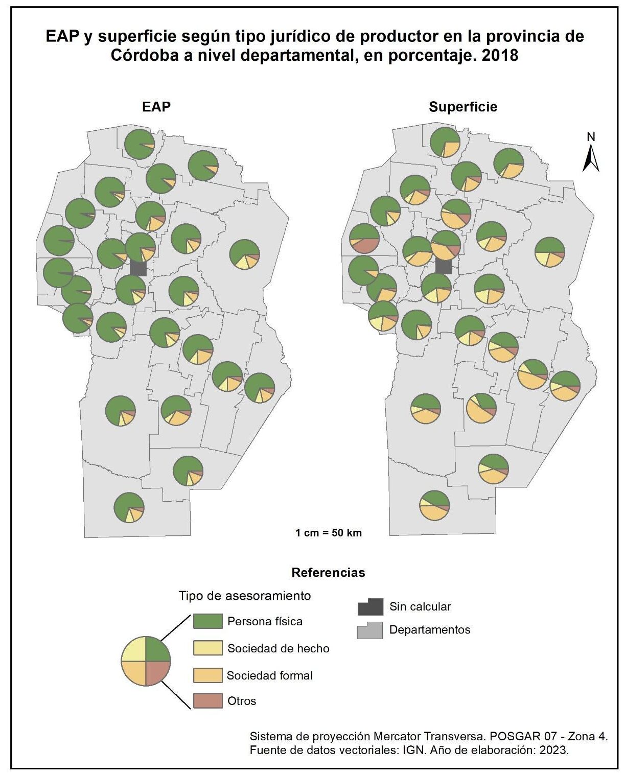 Figura 1.23. EAP y superficie según tipo jurídico de productor en la provincia de Córdoba a nivel departamental, en porcentaje. Año 2018.