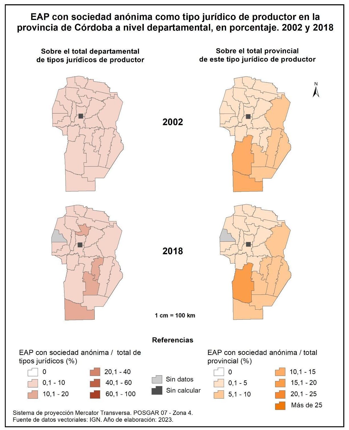 Figura 1.25. EAP con sociedad anónima como tipo jurídico de productor en la provincia de Córdoba a nivel departamental, en porcentaje. Años 2002 y 2018.