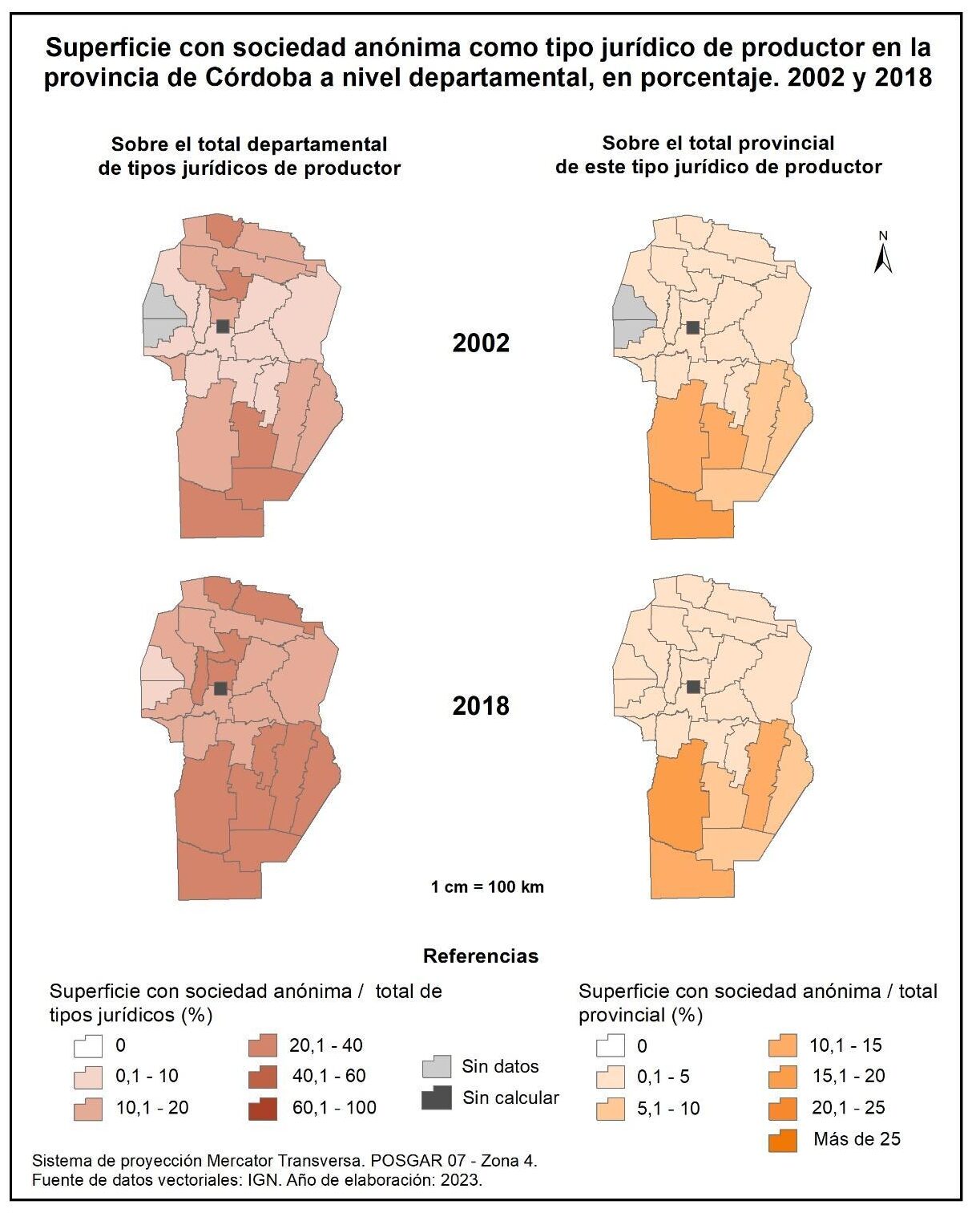 Figura 1.26. Superficie con sociedad anónima como tipo jurídico de productor en la provincia de Córdoba a nivel departamental, en porcentaje. Años 2002 y 2018.