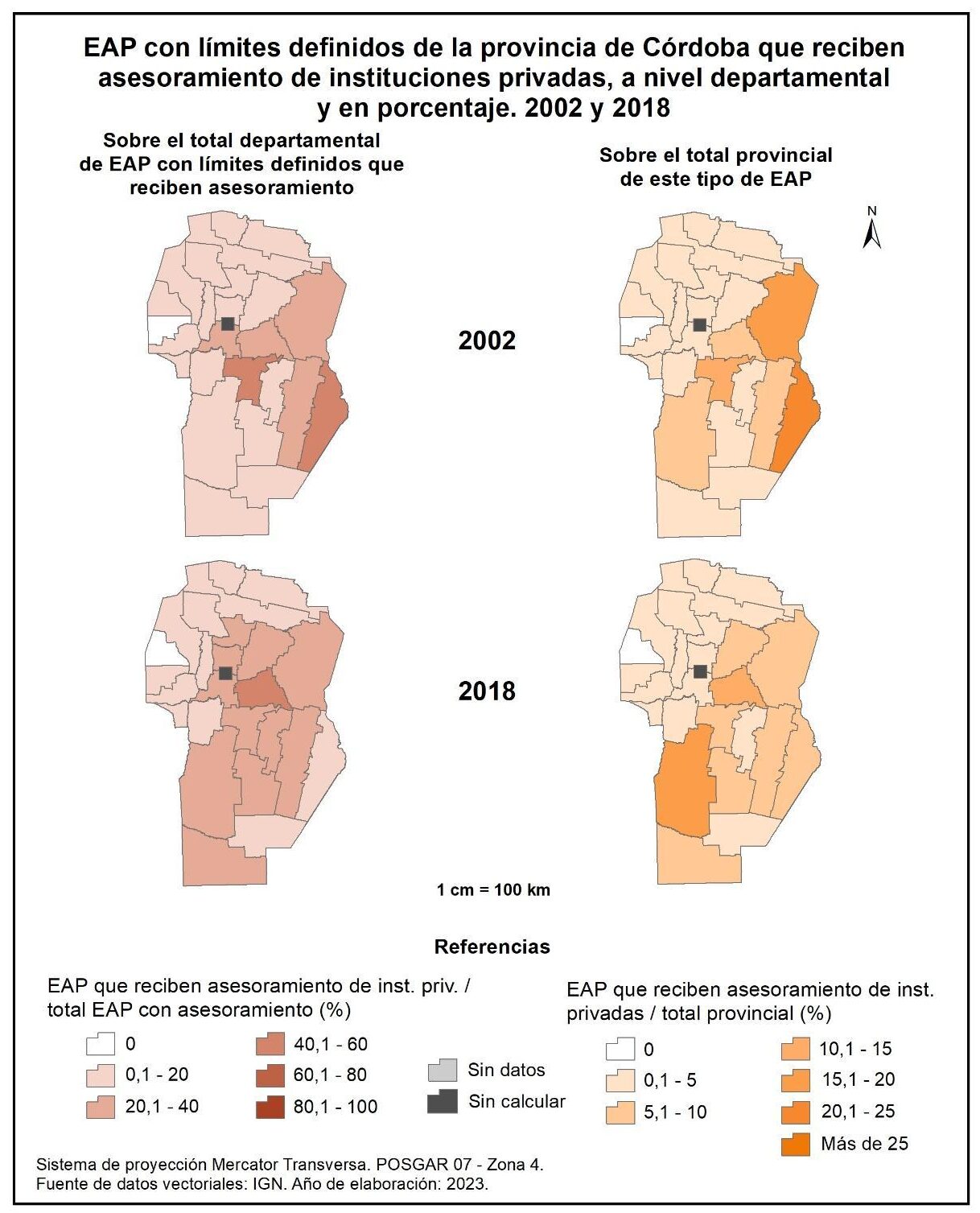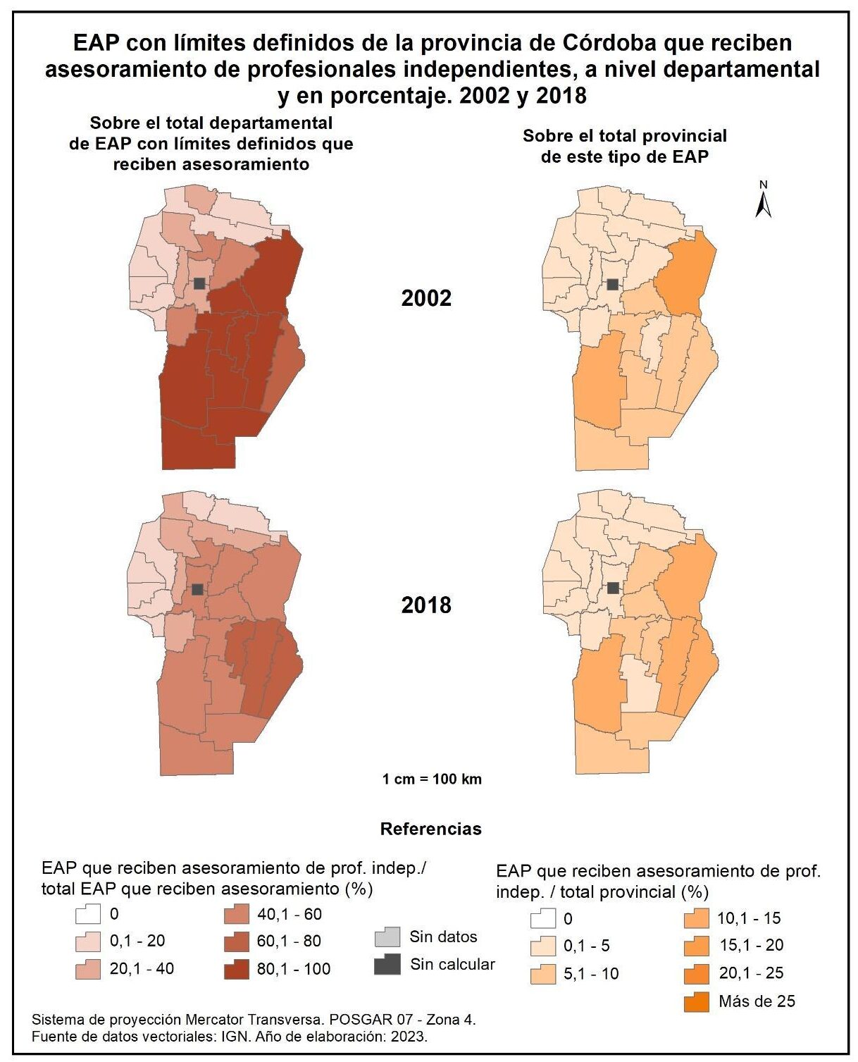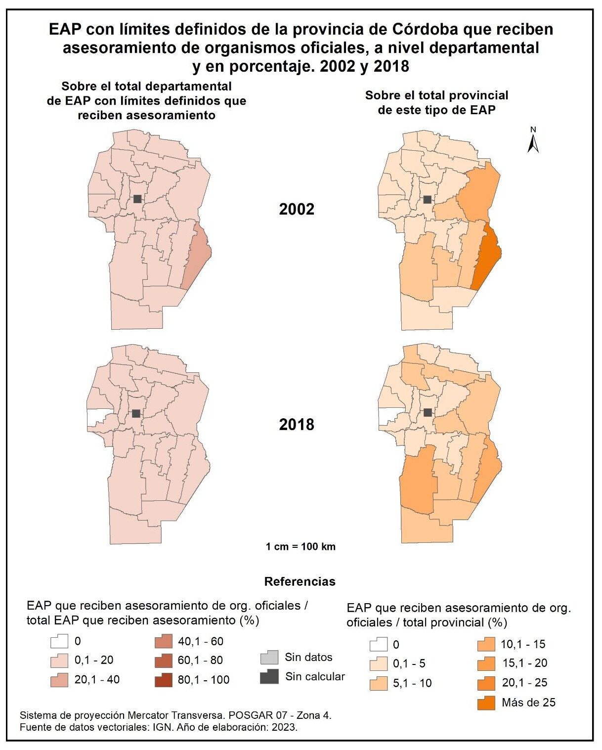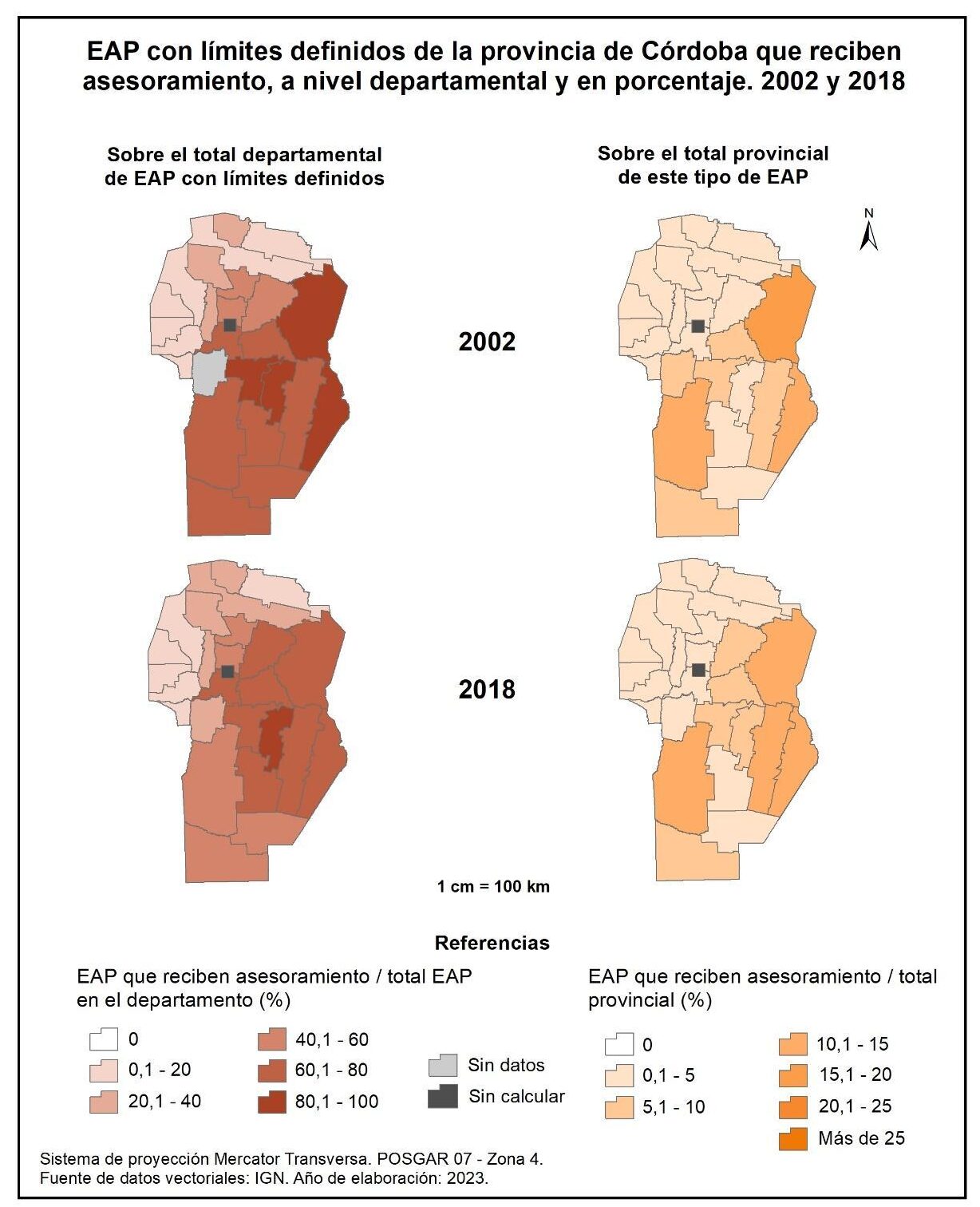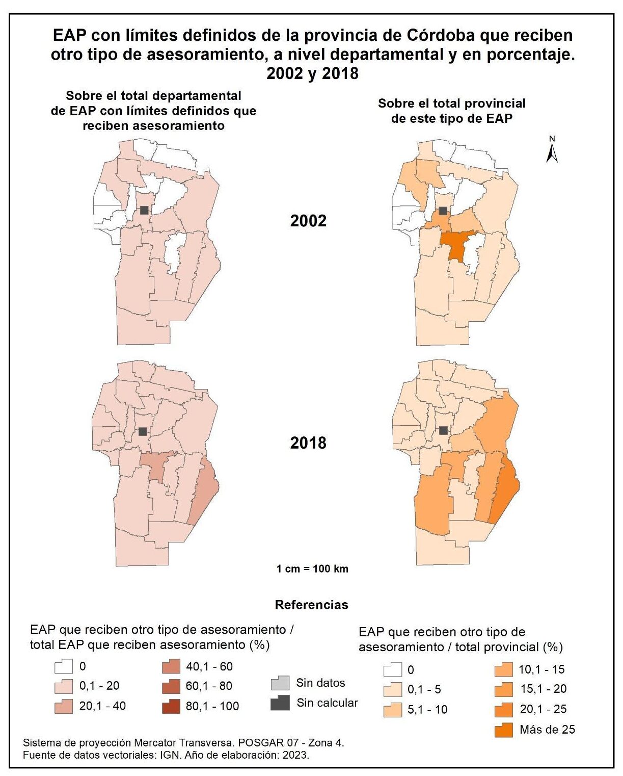 Figura 1.28. EAP con límites definidos de la provincia de Córdoba que reciben asesoramiento, a nivel departamental y en porcentaje. Años 2002 y 2018.