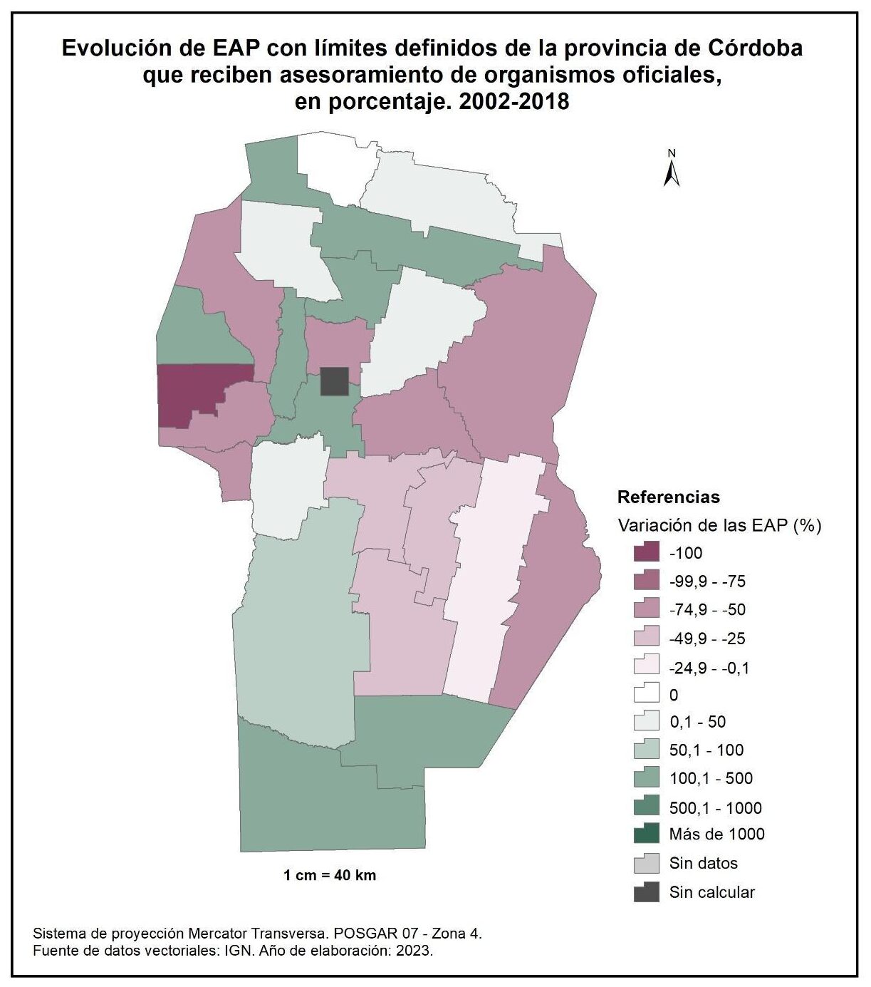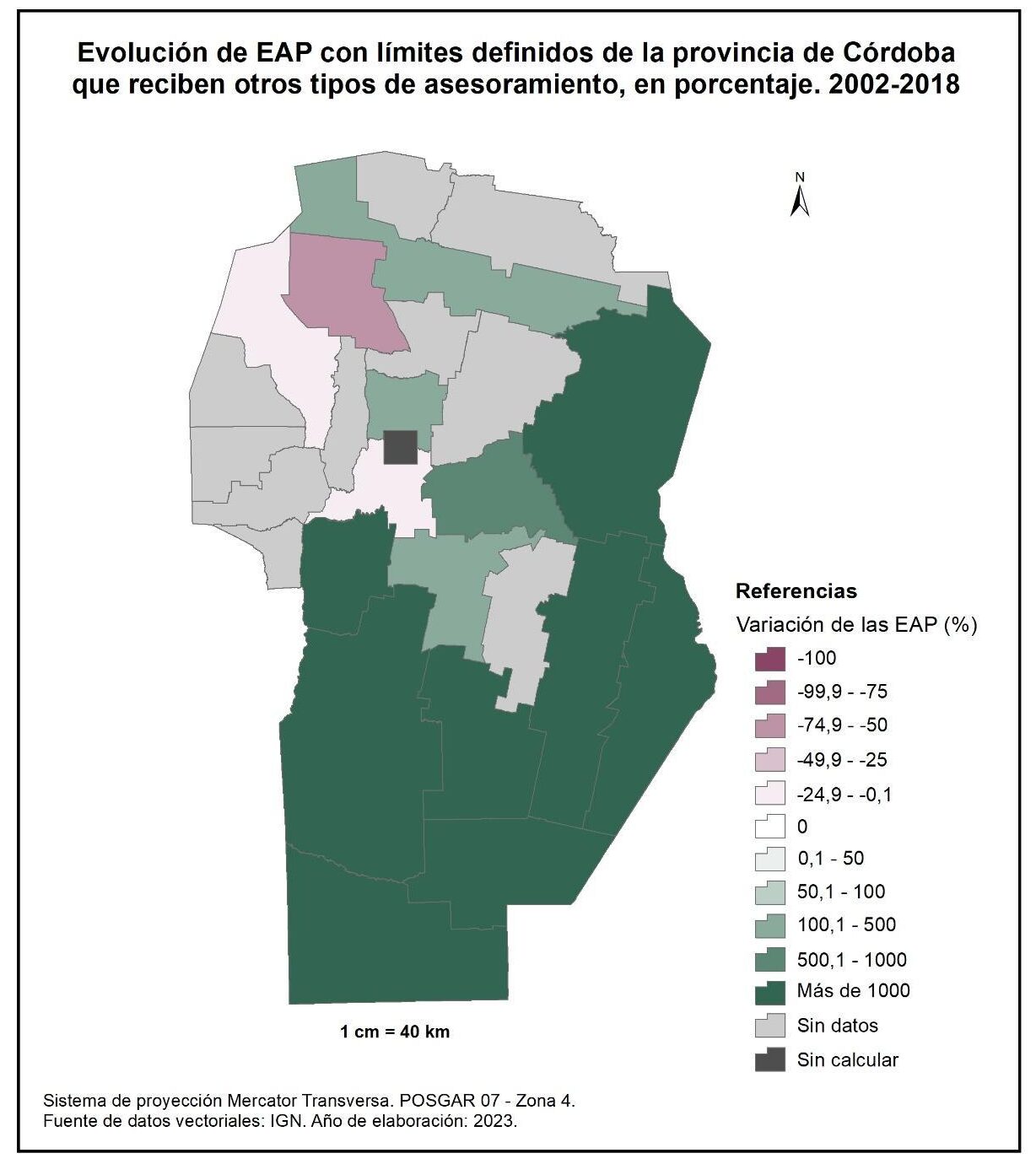 En este sentido, con relación a la cantidad de EAP de la provincia de Córdoba que recibe asesoramiento (figura 1.27) experimentó, a nivel general, una disminución significativa entre 2002 y 2018, que alcanzó el -25% a nivel provincial. Este decrecimiento es más marcado en el departamento de San Justo con el -51%, seguido por algunos departamentos del norte y oeste como Sobremonte, Cruz del Eje, Punilla, Colón, Pocho, San Alberto, San Javier y Calamuchita, y por algunos del sur como General Roca, Presidente Roque Sáenz Peña y Juárez Celman, con valores de entre el -50 y -25%. La excepción la constituyen Tulumba, Río Primero y Río Seco que registran un incremento del 89, 43 y 38% respectivamente.