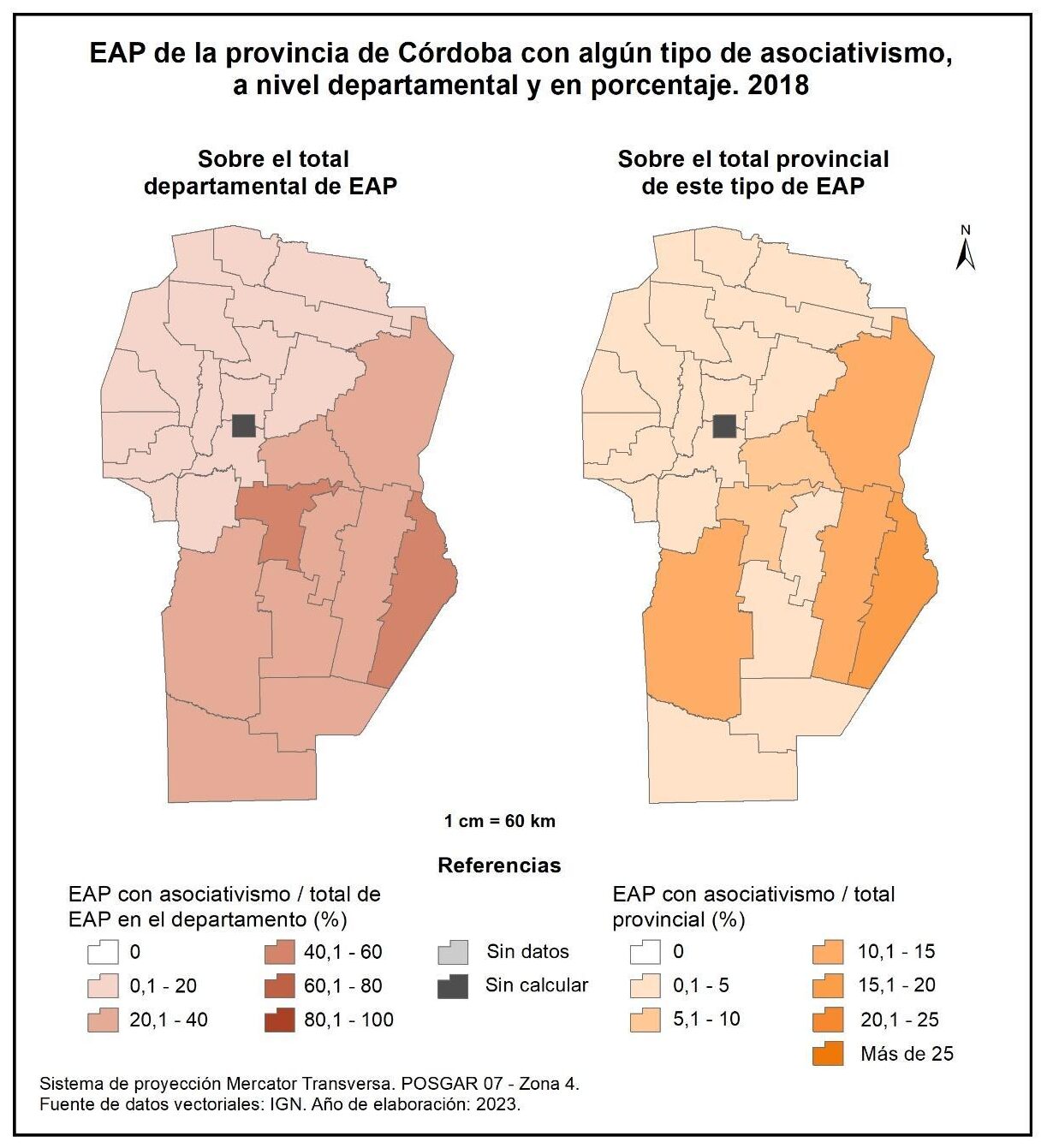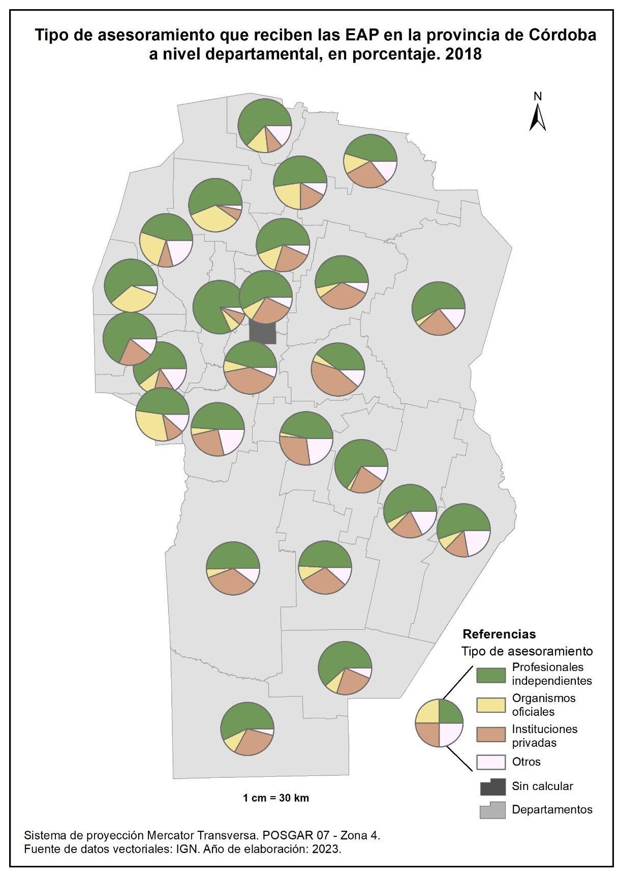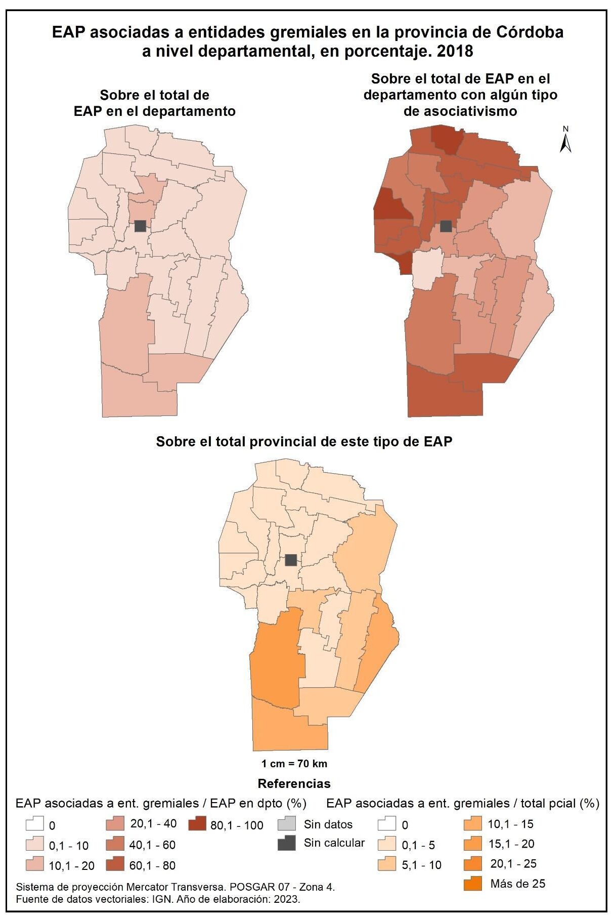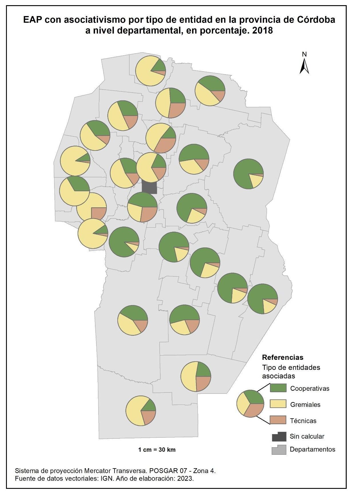 Figura 1.43. EAP asociadas a entidades técnicas en la provincia de Córdoba a nivel departamental, en porcentaje. Año 2018.