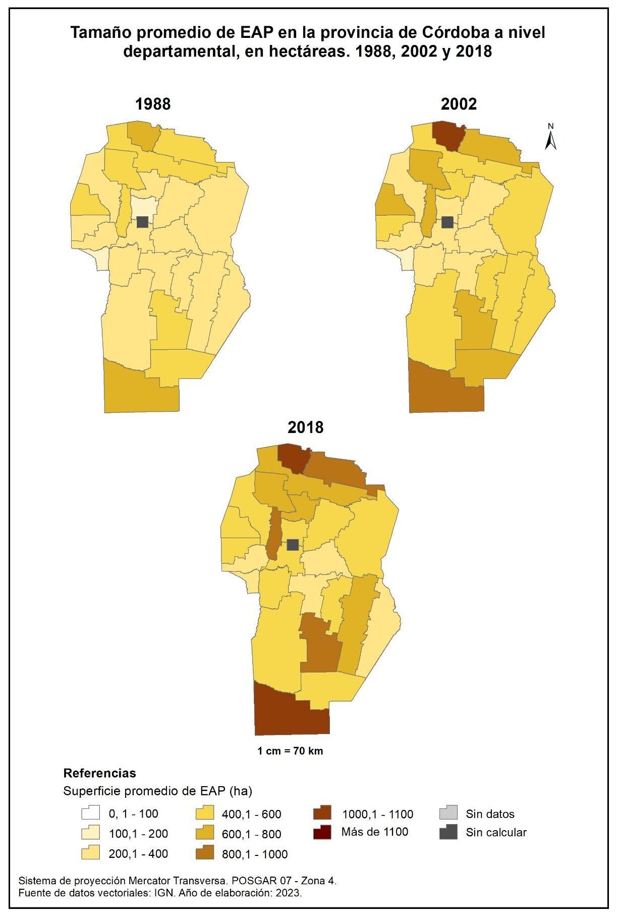 Figura 1.3. Tamaño promedio de EAP en la provincia de Córdoba a nivel departamental, en hectáreas. Años 1988, 2002 y 2018.