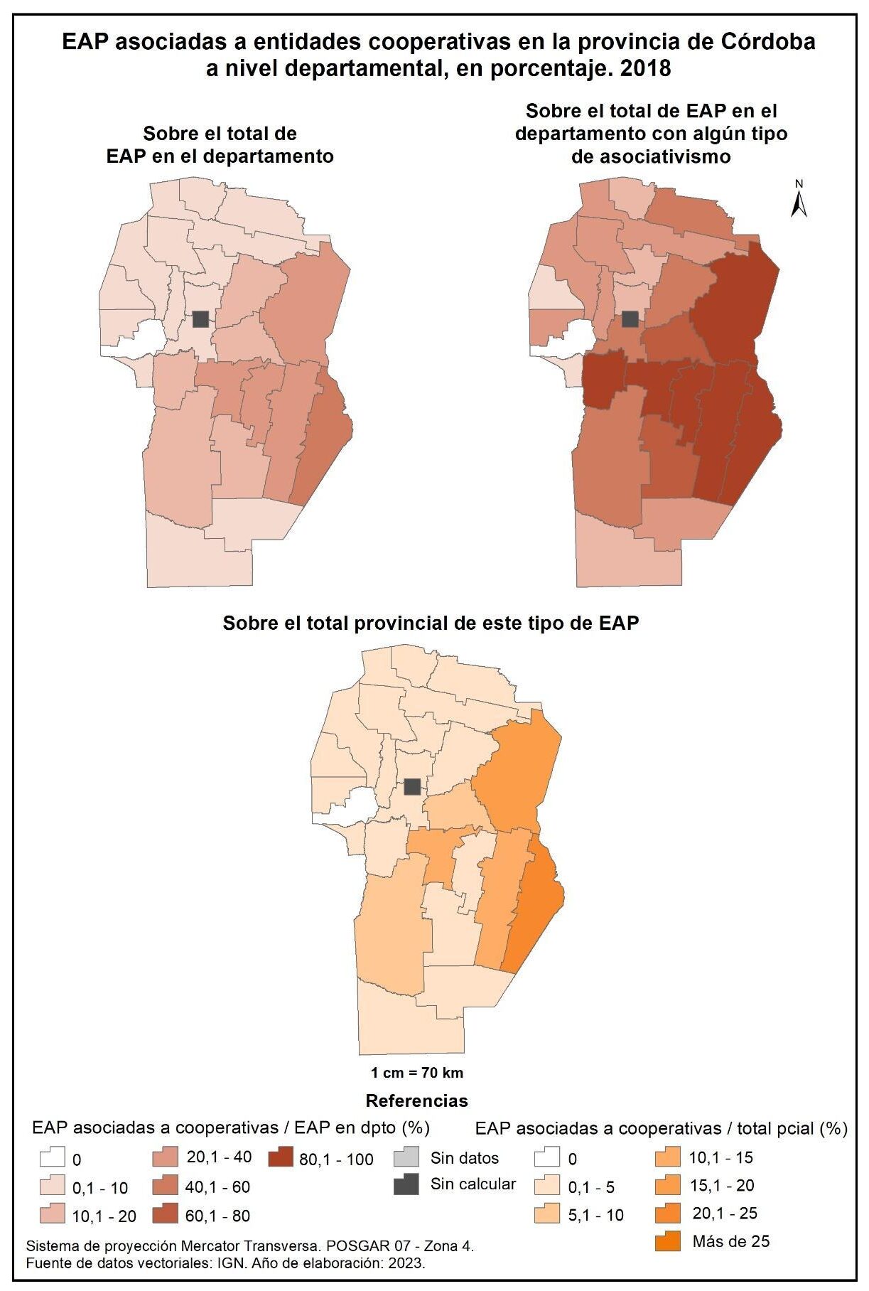 Figura 1.44. EAP con asociativismo por tipo de entidad en la provincia de Córdoba a nivel departamental, en porcentaje. Año 2018.