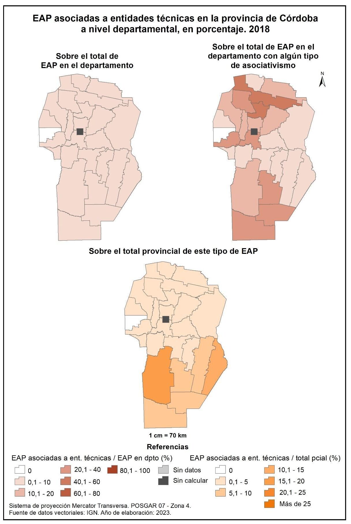 En cuanto a las EAP del departamento asociadas a entidades técnicas sobre el total provincial de EAP con este tipo de asociación, la mayor parte de los departamentos participa con valores inferiores al 5% en el registro censal de 2018. Por su parte, los departamentos del sur concentran la mayor cantidad de este tipo de EAP; resaltan Río Cuarto y Marcos Juárez en los que llegan a un 19 y 13% respectivamente.
