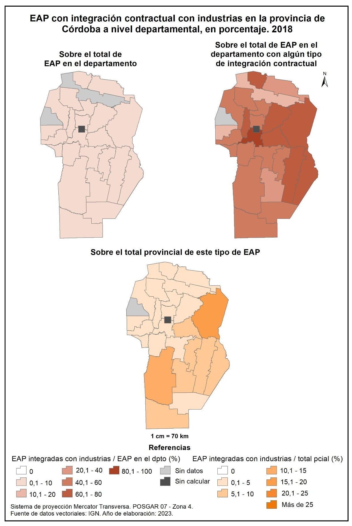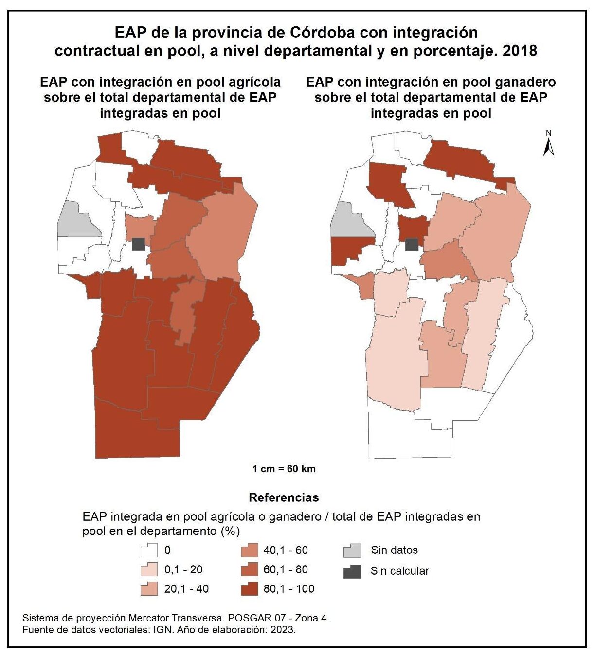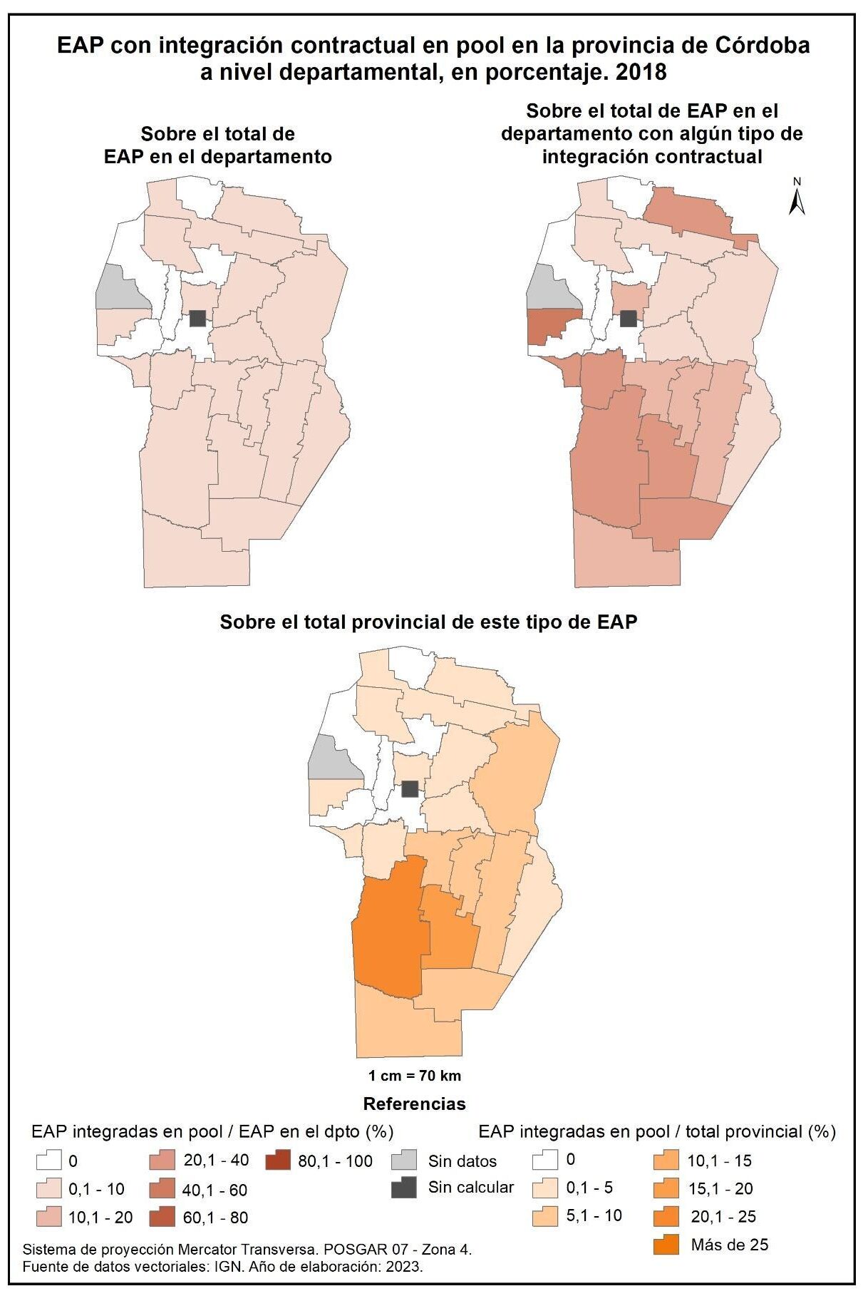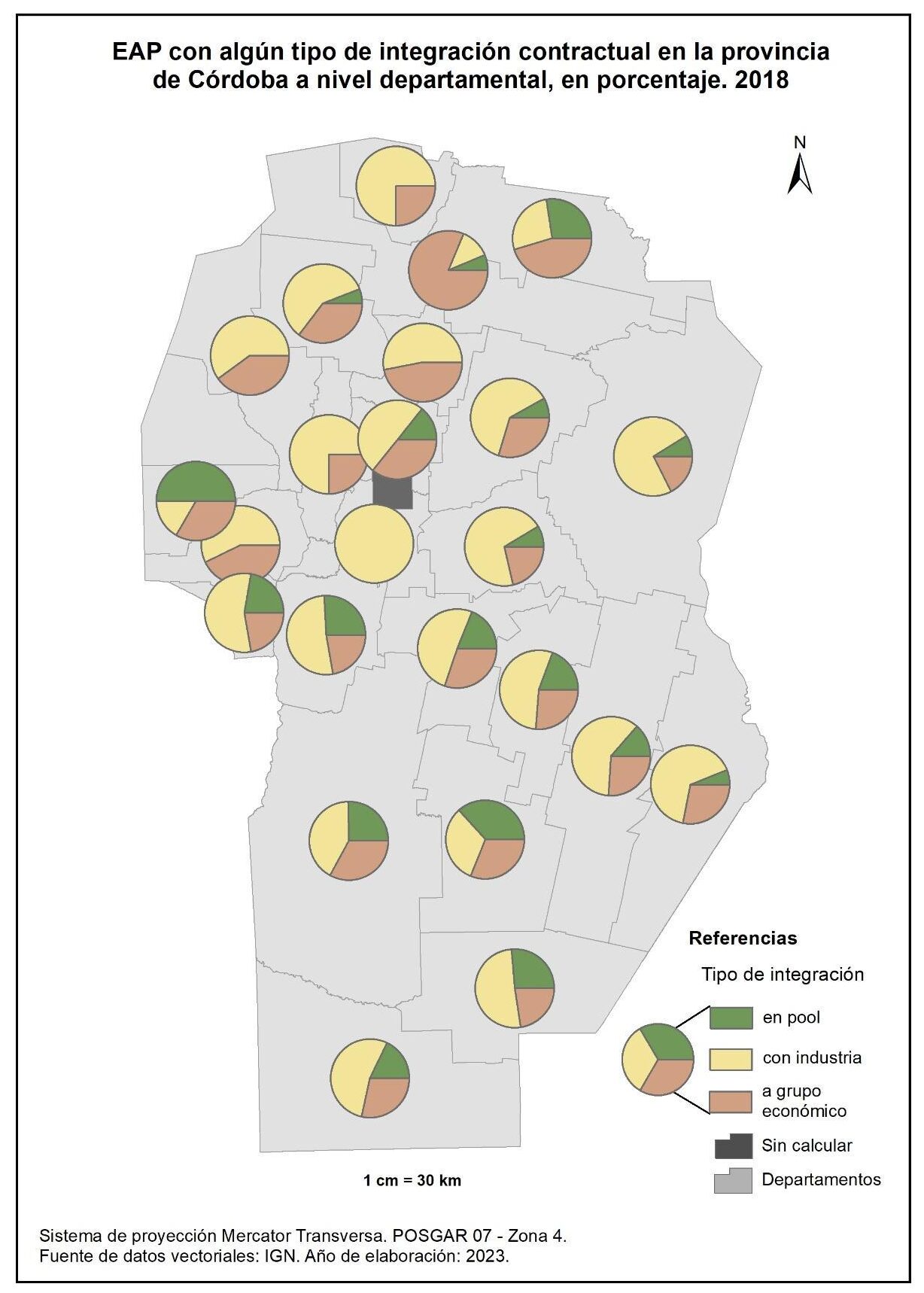 Figura 1.47. EAP de la provincia de Córdoba con integración contractual en pool, a nivel departamental y en porcentaje. Año 2018.