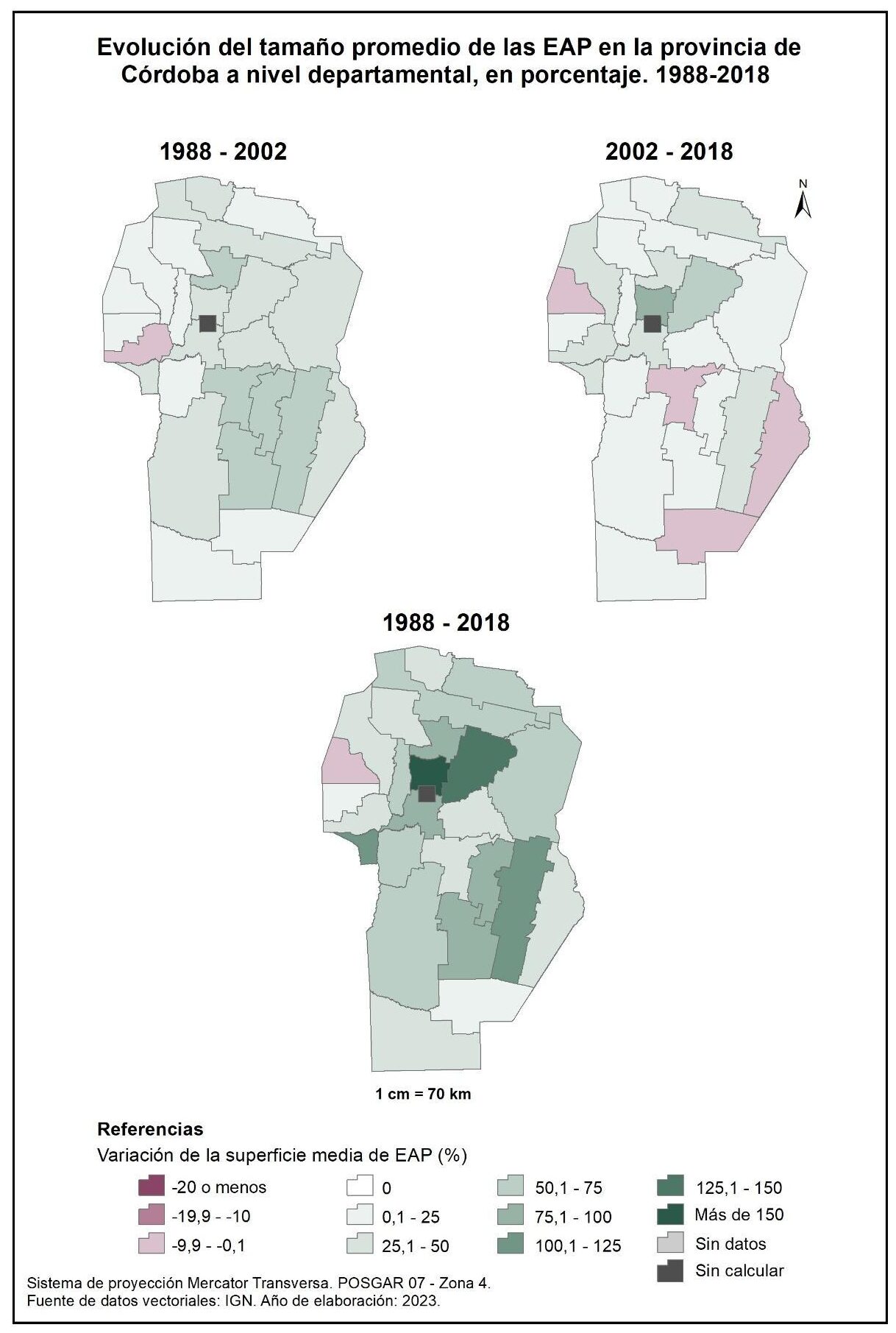 Figura 1.4. Evolución del tamaño promedio de las EAP en la provincia de Córdoba a nivel departamental, en porcentaje. Años 1988, 2002 y 2018.