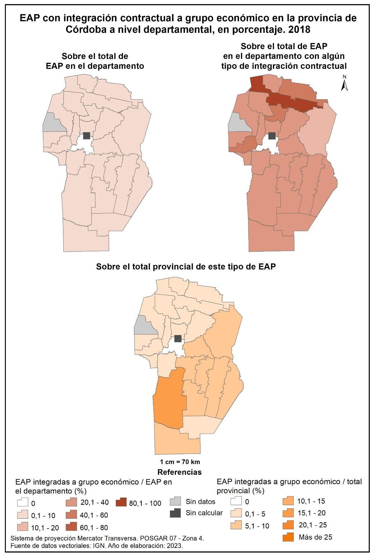 Por su parte, las explotaciones integradas a grupo económico sobre el total de EAP departamental con algún tipo de integración contractual registran valores de entre el 20 y 40% en la mayor parte de los departamentos. Se destacan algunos del norte y oeste –Río Seco, Totoral, y San Alberto– con porcentajes de entre el 40 y 60% y Tulumba con el 81%. En tanto que Santa María detenta porcentajes nulos de EAP con este tipo de integración.