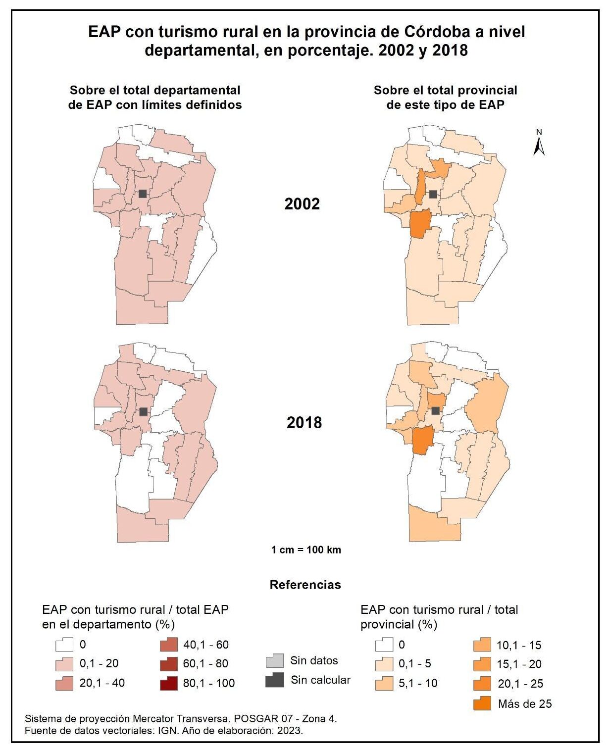 Figura 1.52. EAP con turismo rural en la provincia de Córdoba a nivel departamental, en porcentaje. Años 2002 y 2018.