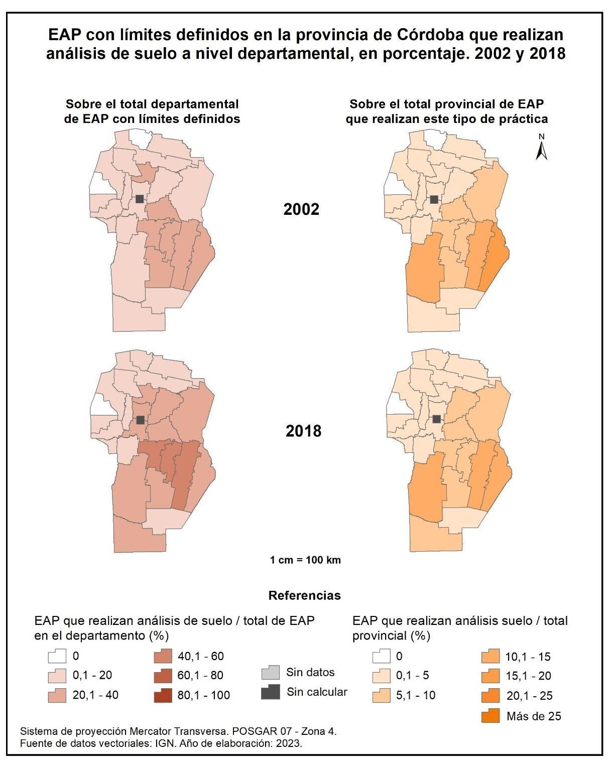 Figura 1.54. EAP con límites definidos en la provincia de Córdoba que realizan análisis de suelo a nivel departamental, en porcentaje. Años 2002 y 2018.