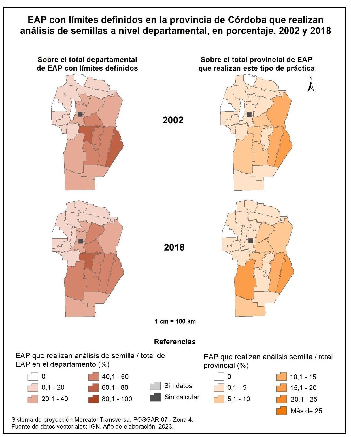 Figura 1.56. EAP con límites definidos en la provincia de Córdoba que realizan análisis de semilla a nivel departamental, en porcentaje. Años 2002 y 2018.