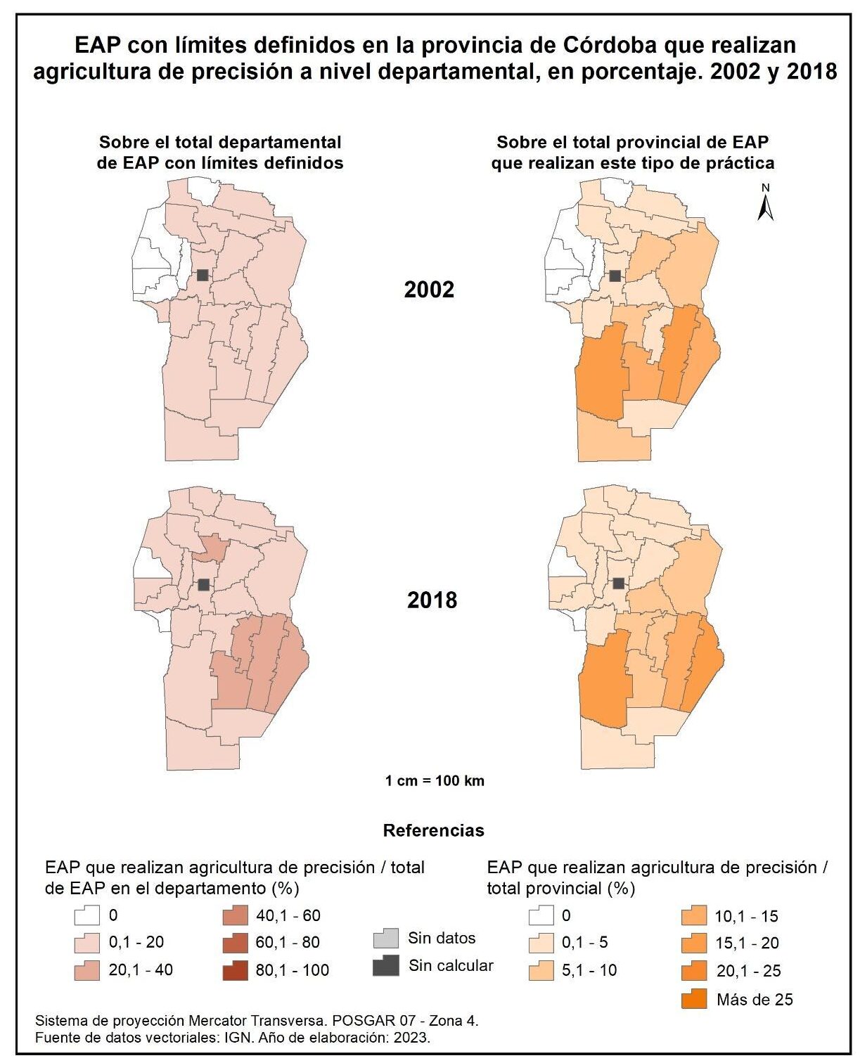 Figura 1.58. EAP con límites definidos en la provincia de Córdoba que realizan agricultura de precisión a nivel departamental, en porcentaje. Años 2002 y 2018.