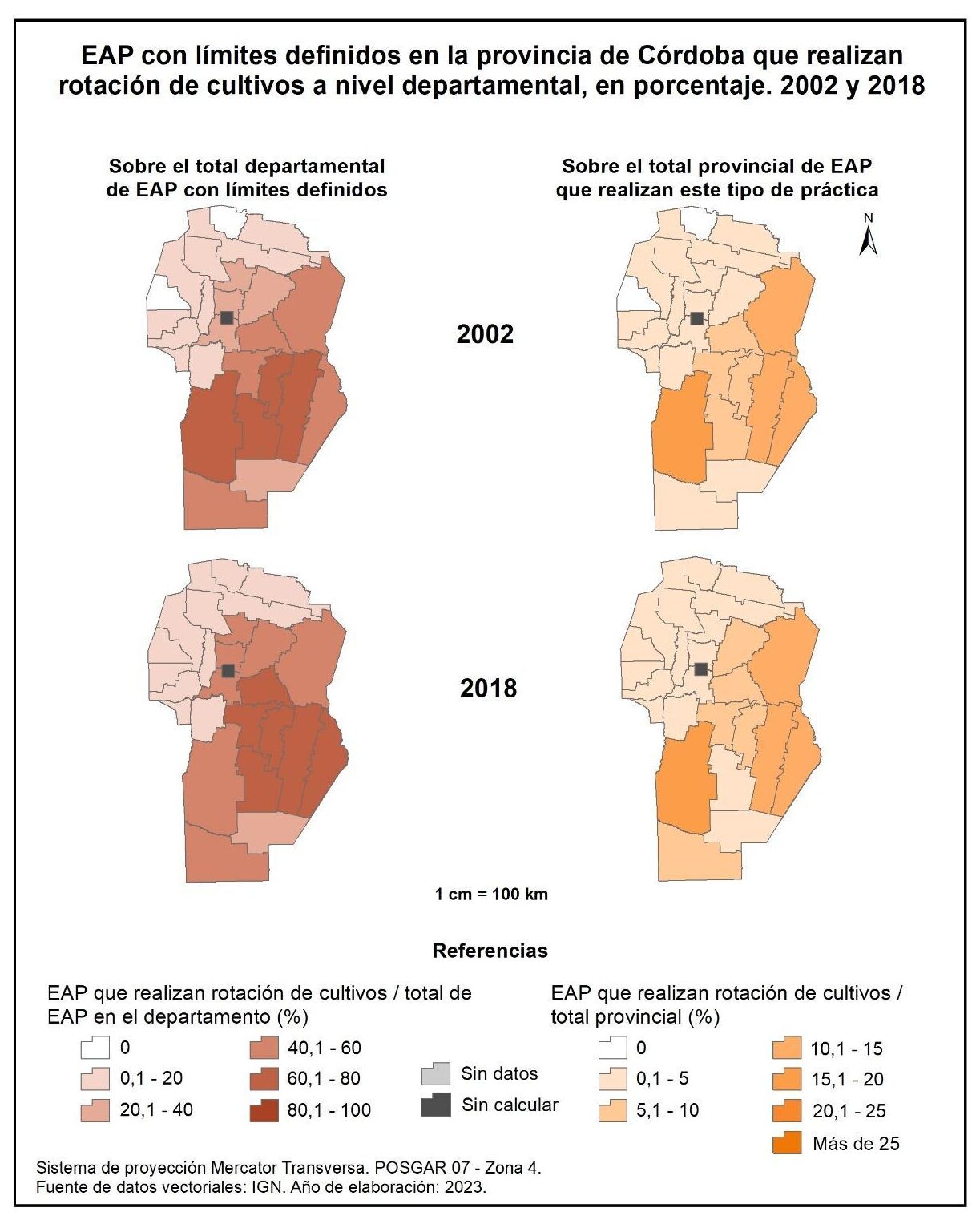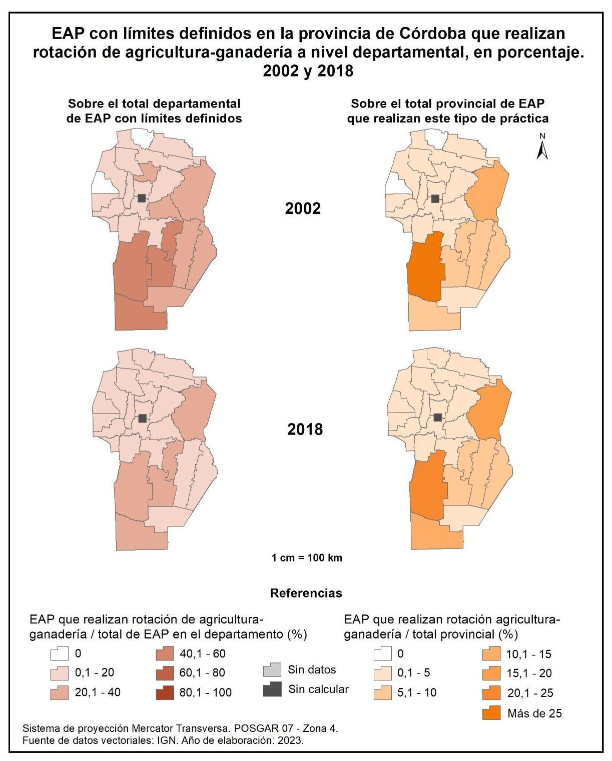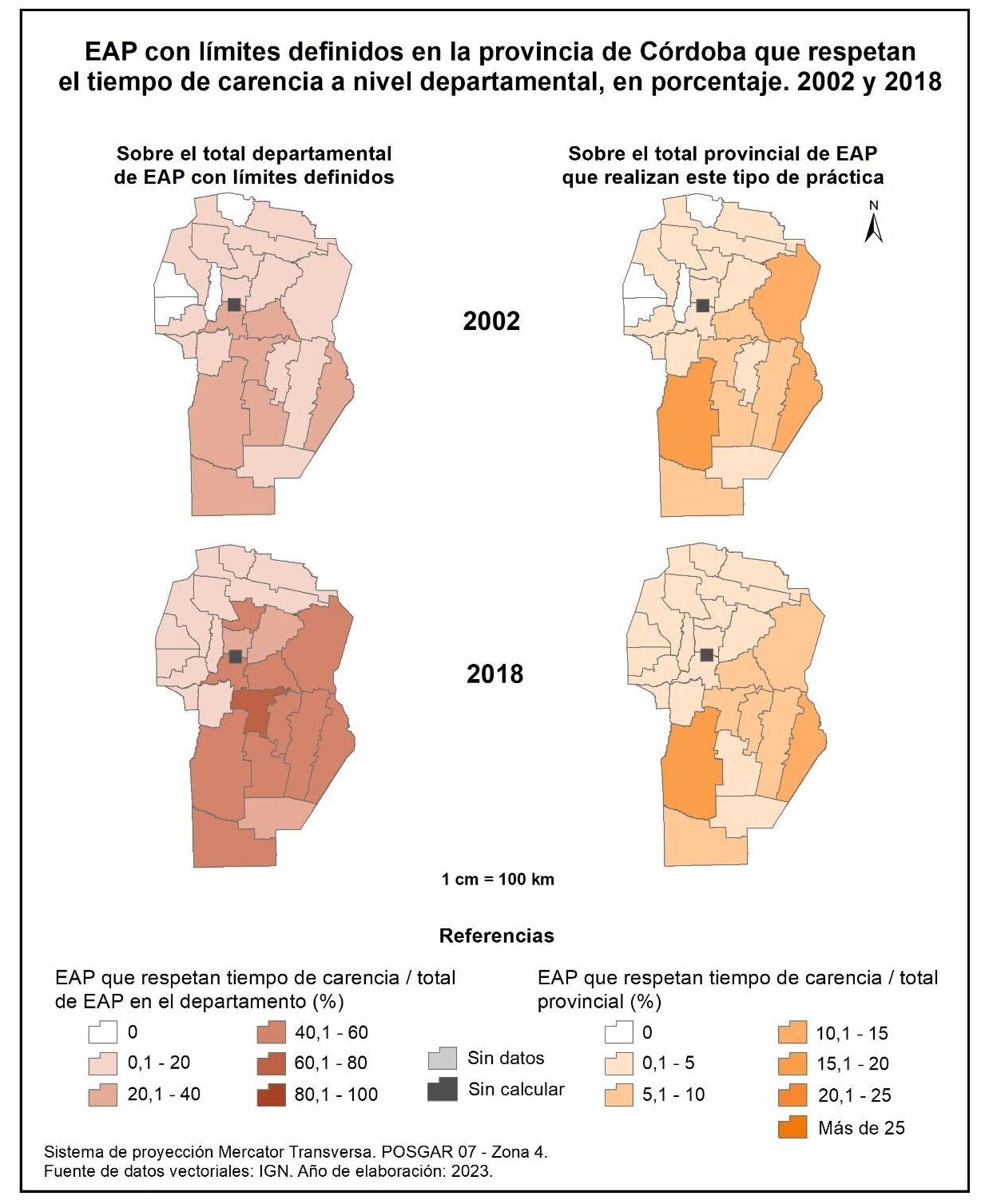 Las EAP de la provincia de Córdoba que respetan el tiempo de carencia a escala departamental (figura 1.78, columna izquierda) alcanzan el 16% en 2002 y el 38% en 2018. En ambos censos, la mayor participación de este tipo de EAP se registra en el sur, centro y este provincial, con valores de entre el 20 al 40% en 2002 y del 40 al 60% en 2018; Tercero Arriba sobresale con el 63%.