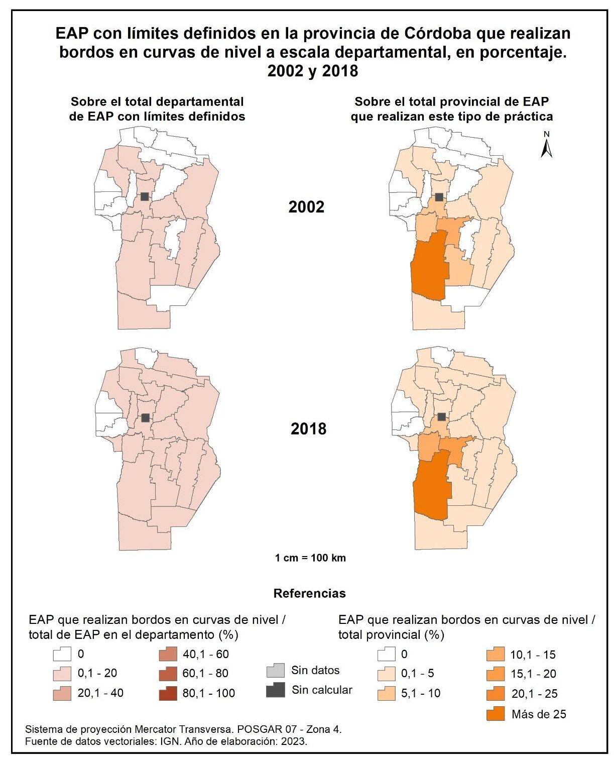 Figura 1.66. EAP con límites definidos en la provincia de Córdoba que realizan bordos en curvas de nivel a escala departamental, en porcentaje. Años 2002 y 2018.