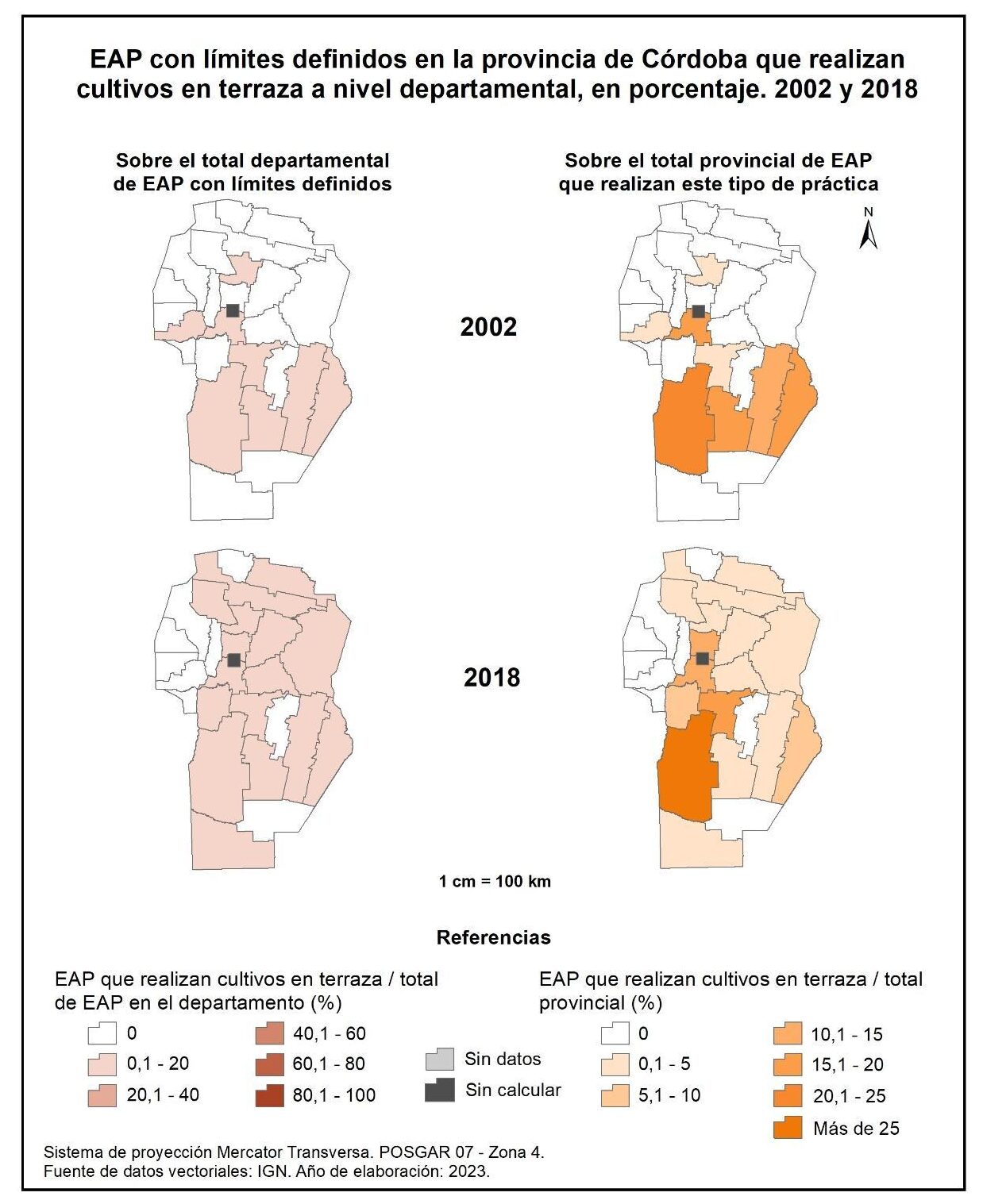 Las EAP de la provincia de Córdoba que realizan cultivos en terraza a escala departamental (figura 1.68, columna izquierda) aumentaron de 0,1 a 1% entre 2002 y 2018. Estos bajos porcentajes se traducen en que en ambos cortes censales la participación en cada departamento no supere el 20%. A su vez, algunos del norte y oeste y sureste presentan valores nulos.