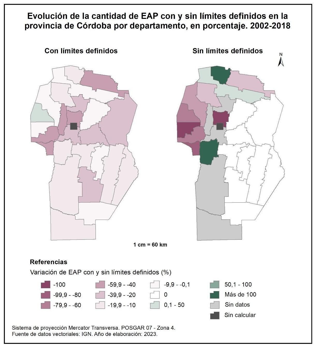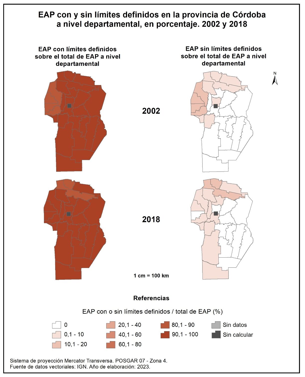 Figura 1.7. EAP con y sin límites definidos en la provincia de Córdoba a nivel departamental, en porcentaje. Años 2002 y 2018.