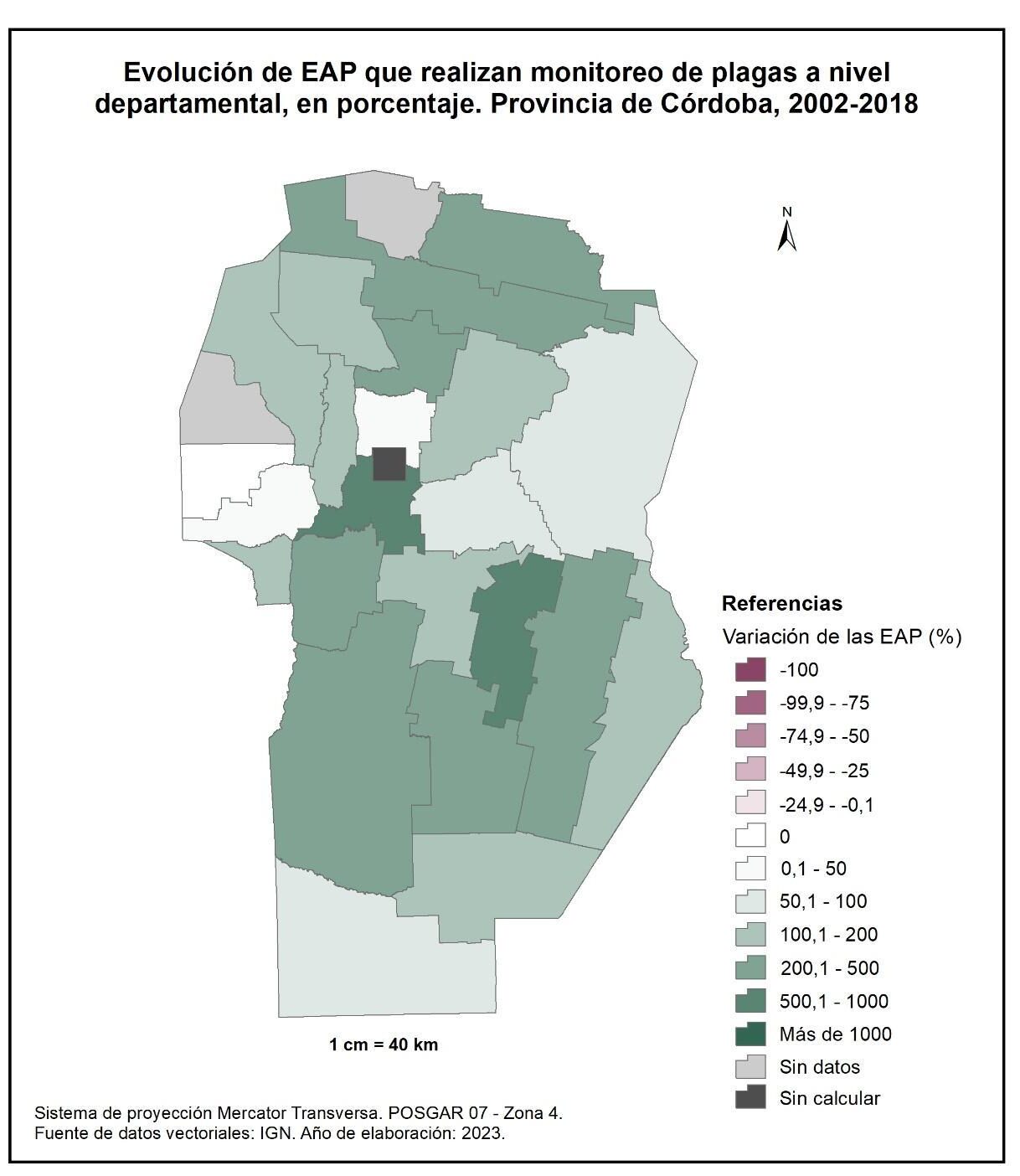 La cantidad de EAP que realizan monitoreo de plagas a nivel departamental (figura 1.69) experimentó en promedio un aumento del 170%; algunos departamentos del norte y centro provincial, especialmente Santa María y General San Martín, se destacan con el 871 y 785% de incremento respectivamente. Por su parte, Pocho es el único departamento que registra una evolución nula.