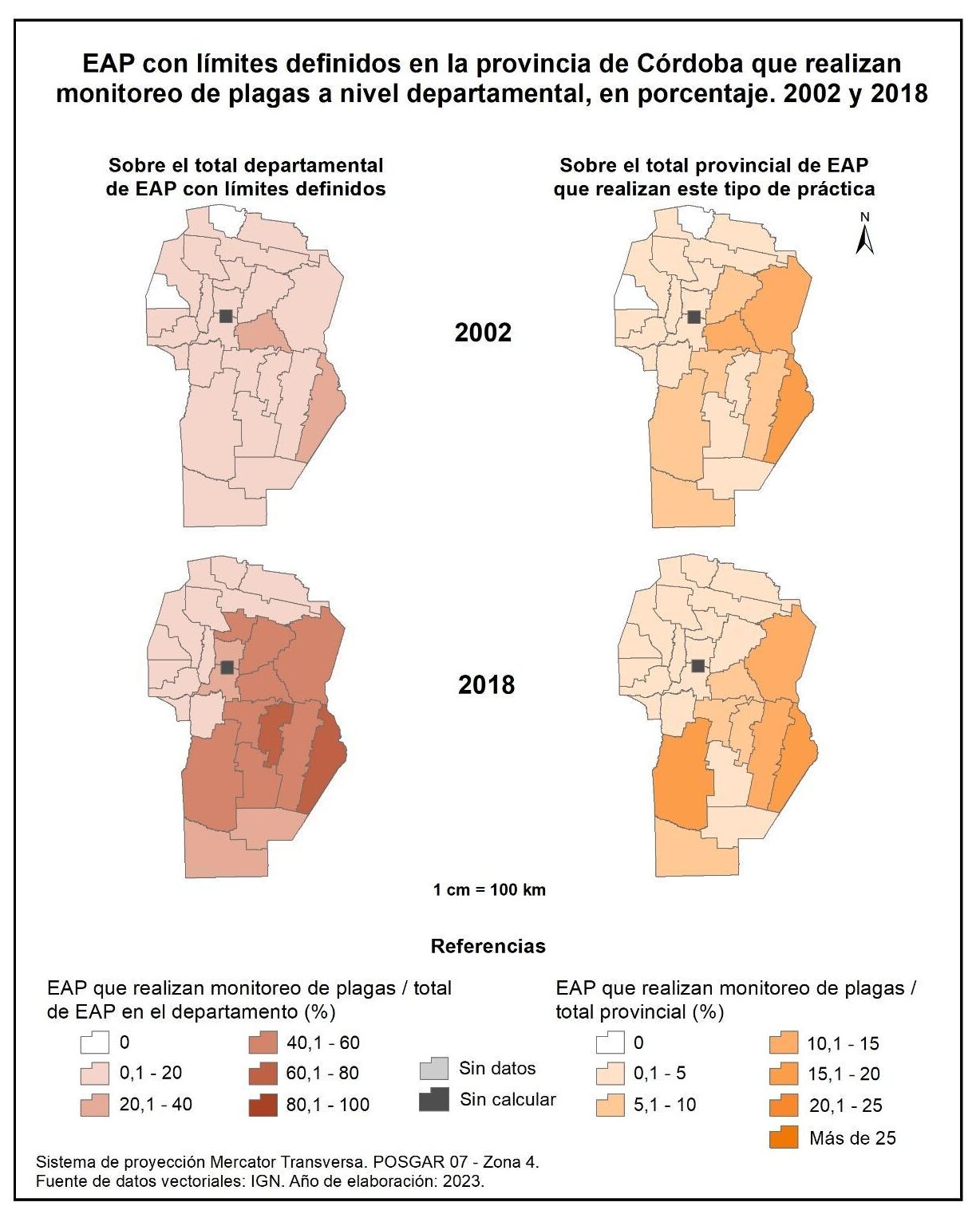 Las EAP de la provincia de Córdoba que realizan monitoreo de plagas a escala departamental (figura 1.70, columna izquierda) detentan valores promedios del 11% en 2002 y del 37% en 2018. En el primer registro censal, se destacan los departamentos de Marcos Juárez y Río Segundo con valores en torno al 25%, y en 2018 los departamentos del centro y sureste provincial, especialmente Marcos Juárez y General San Martín con valores cercanos al 65%.