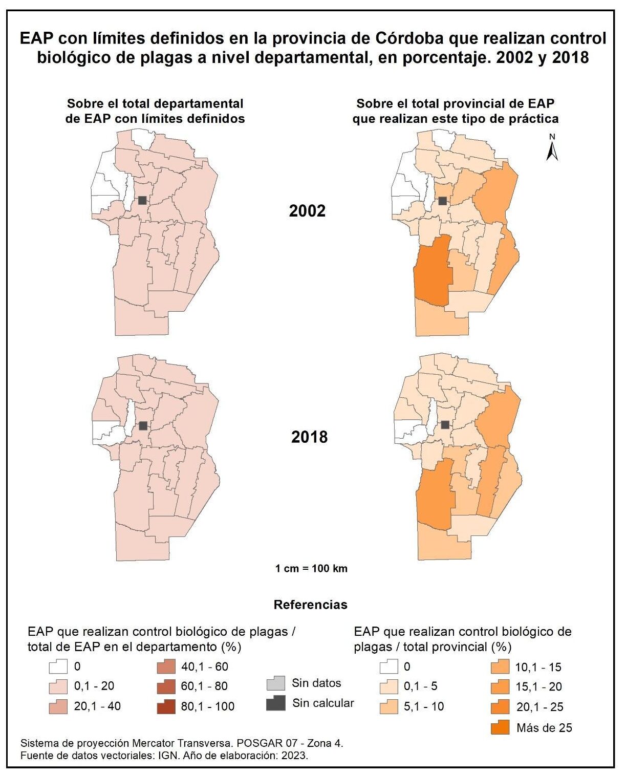 Las EAP de la provincia de Córdoba que realizan control biológico de plagas a escala departamental (figura 1.72, columna izquierda) alcanzan al 1% en 2002 y el 10% en 2018. Estos bajos porcentajes se traducen en que en ambos cortes censales la participación en cada departamento no supere el 20%. A su vez, los departamentos de Sobremonte, Cruz del Eje, Minas, Pocho y Punilla en 2002 y Pocho, San Alberto y Punilla en 2018 registran nula participación.