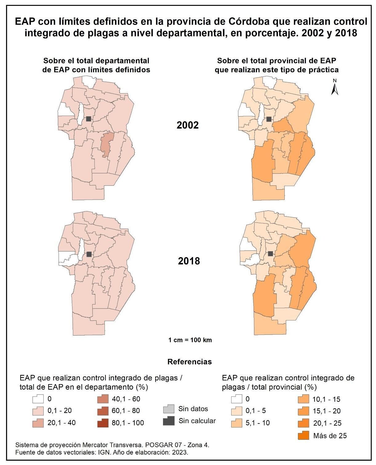 Las EAP de la provincia de Córdoba que realizan control integrado de plagas a escala departamental (figura 1.74, columna izquierda) alcanzan el 8% en 2002 y el 22% en 2018. En ambos períodos intercensales, la totalidad de los departamentos no supera el 20%, a excepción de General San Martín (21%). Los departamentos que no registran participación son Sobremonte, Minas y Punilla en 2002 y Pocho, San Alberto y Punilla en 2018.