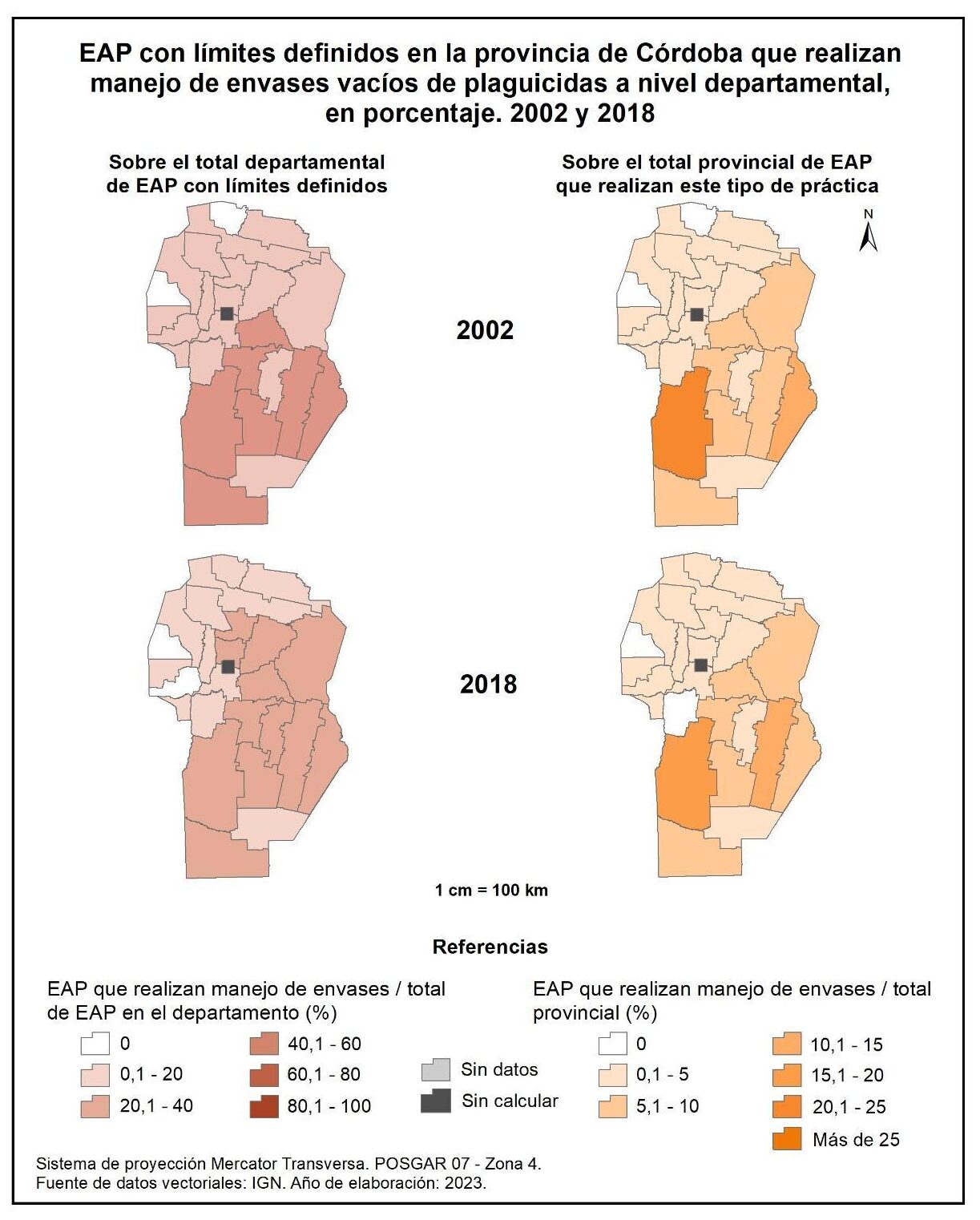 Figura 1.76. EAP con límites definidos en la provincia de Córdoba que realizan manejo de envases vacíos de plaguicidas a nivel departamental, en porcentaje. Años 2002 y 2018.