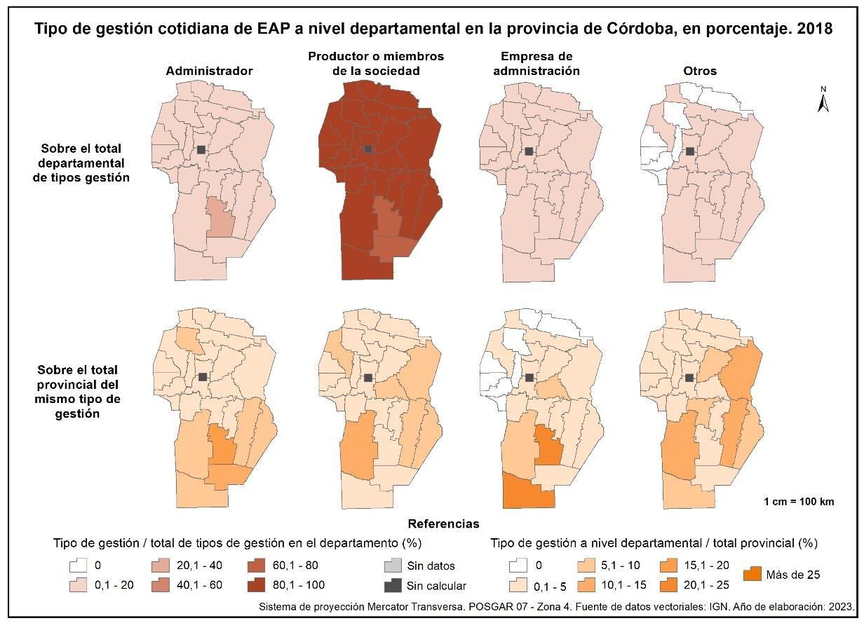 La participación de EAP por tipo de gestión cotidiana con respecto al total departamental de EAP (figura 1.8, fila superior) muestra una significativa presencia del productor o miembros de la sociedad con porcentajes que superan el 90%, salvo en Juárez Celman y Presidente Roque Sáenz Peña. En lo que respecta al resto de las tipologías –administrador, empresa de administración y otros– los valores porcentuales se encuentran por debajo del 20% en toda la provincia, a excepción del administrador en Juárez Celman que participa en un 27% con relación al total de tipos de gestión cotidiana en el departamento.