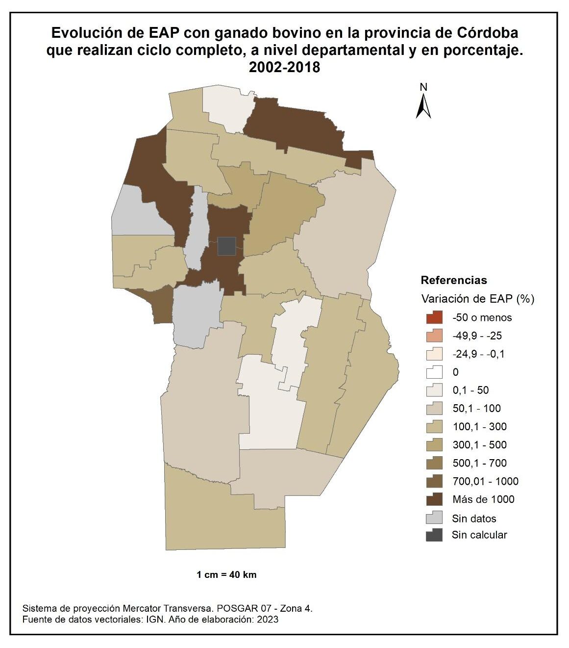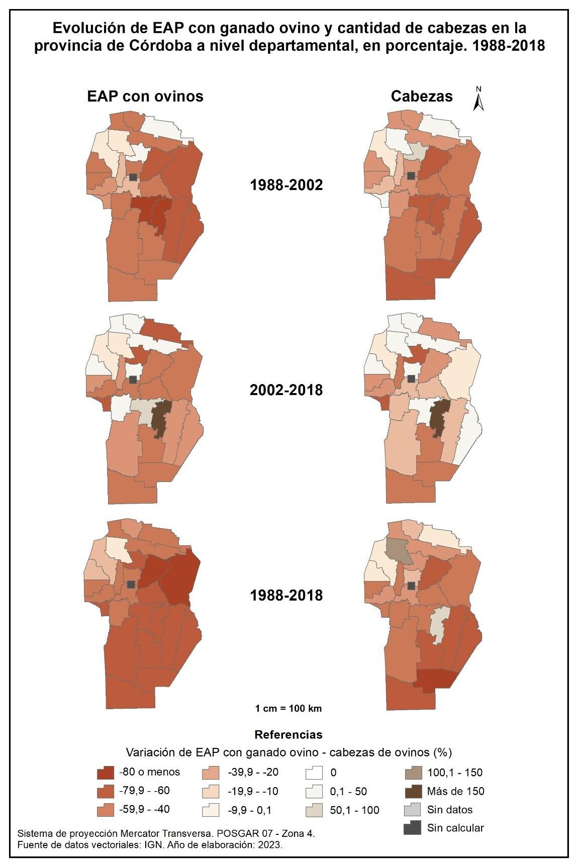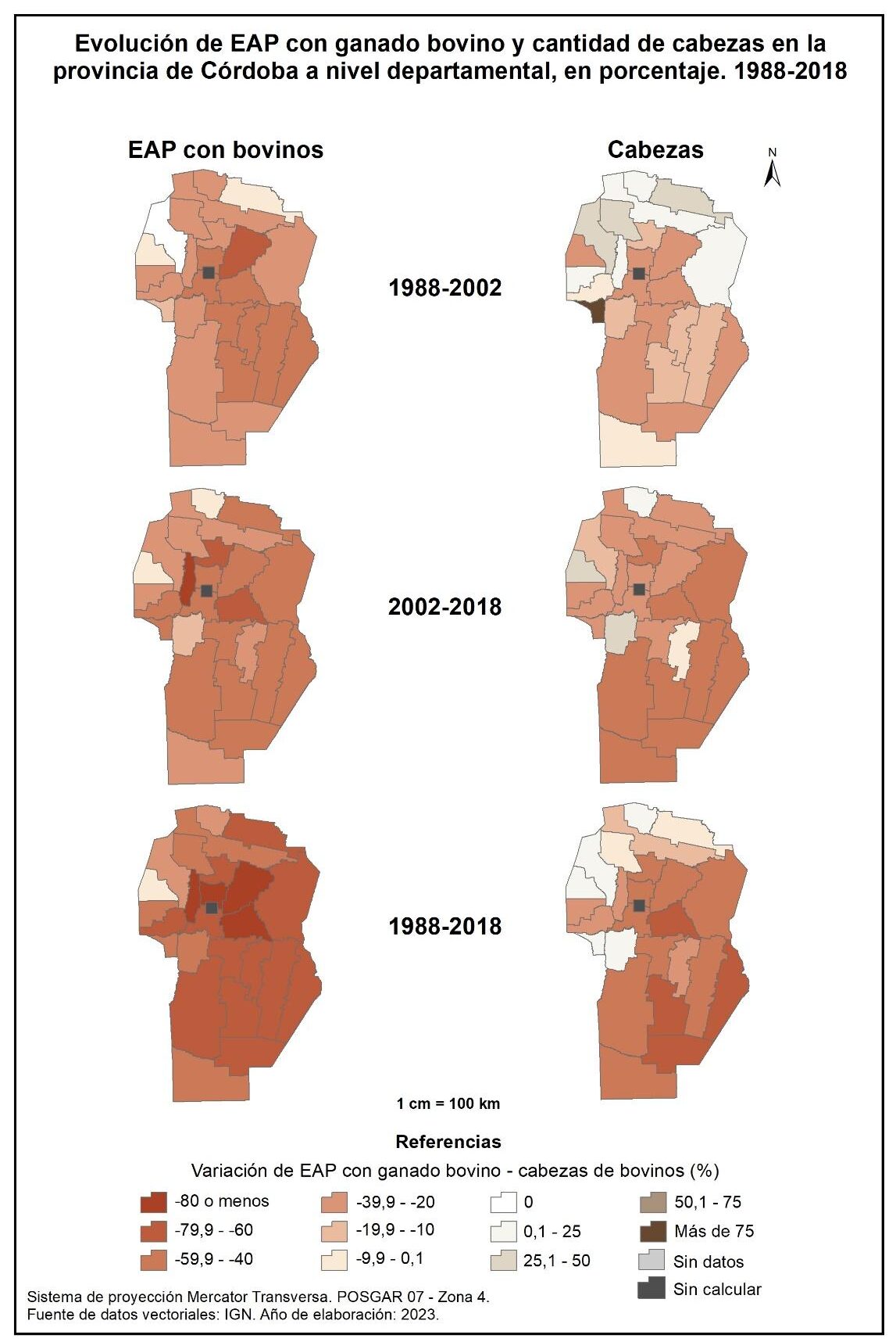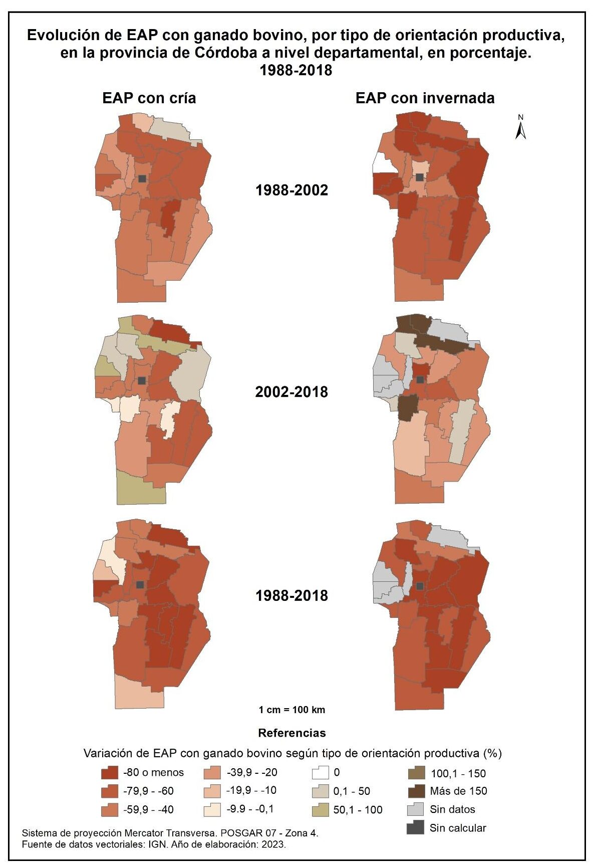 En la totalidad del corte temporal analizado (1988-2018) la provincia muestra una marcada disminución de EAP con cría, con un valor promedio del -65%. Los departamentos de Río Seco, Pocho y gran parte del centro provincial son los que acusan el mayor descenso, con valores superiores al -80%. En cambio, Cruz del Eje, Minas y General Roca registran la menor disminución de EAP con cría (-9, -10 y -15% respectivamente).