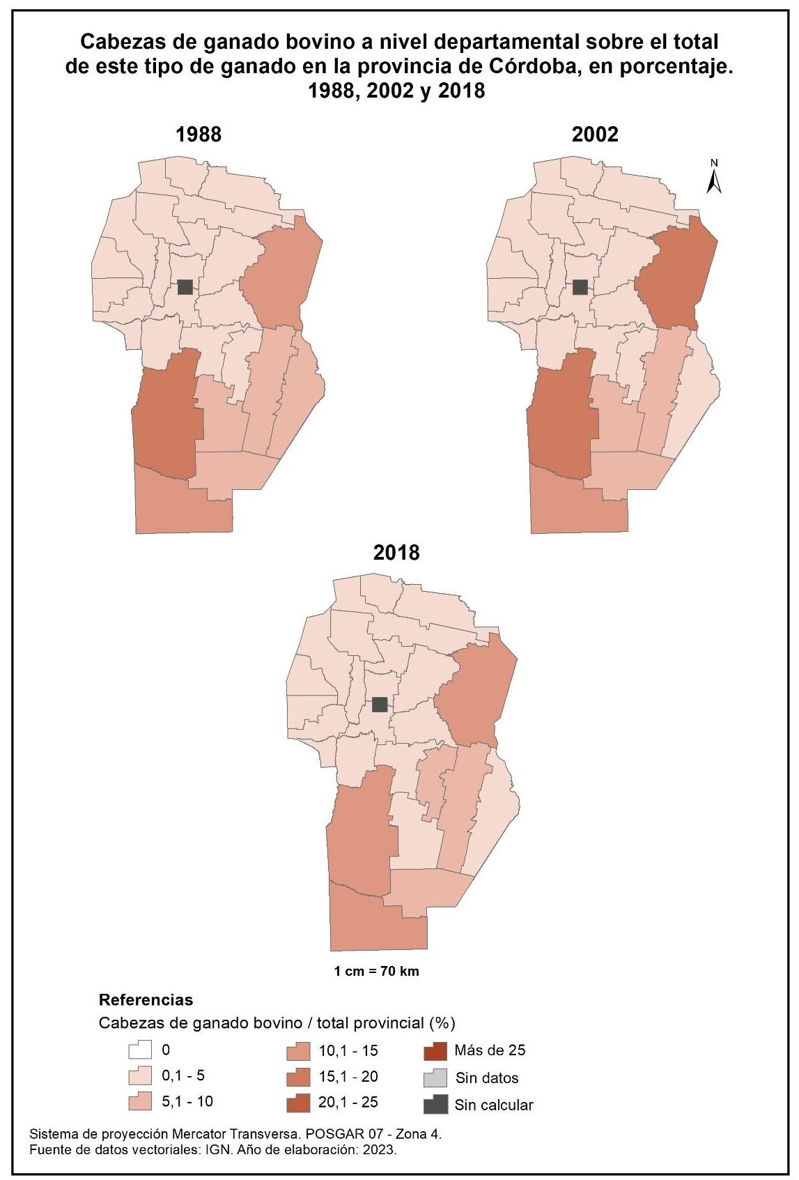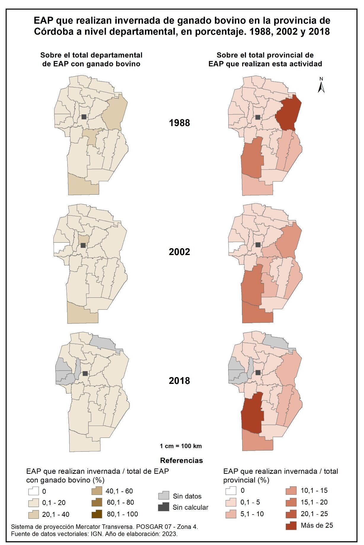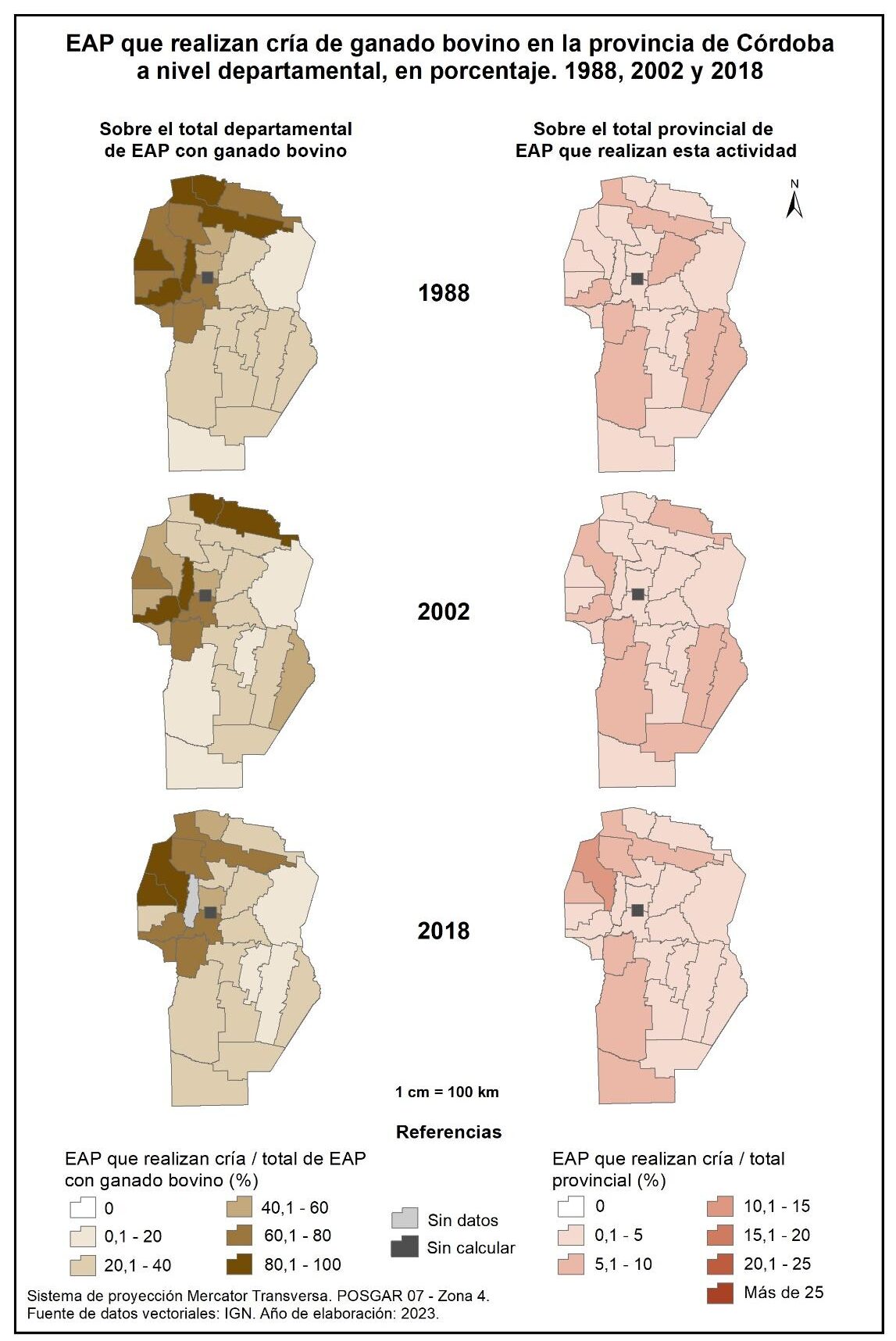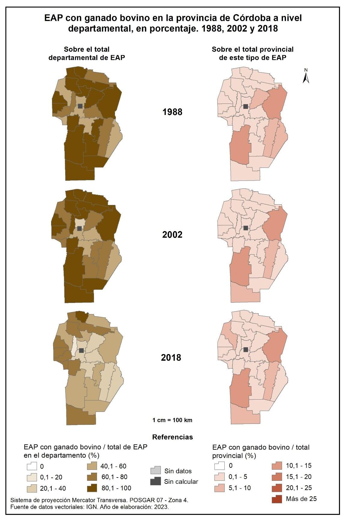 Figura 4.2. EAP con ganado bovino en la provincia de Córdoba a nivel departamental, en porcentaje. Años 1988, 2002 y 2018.