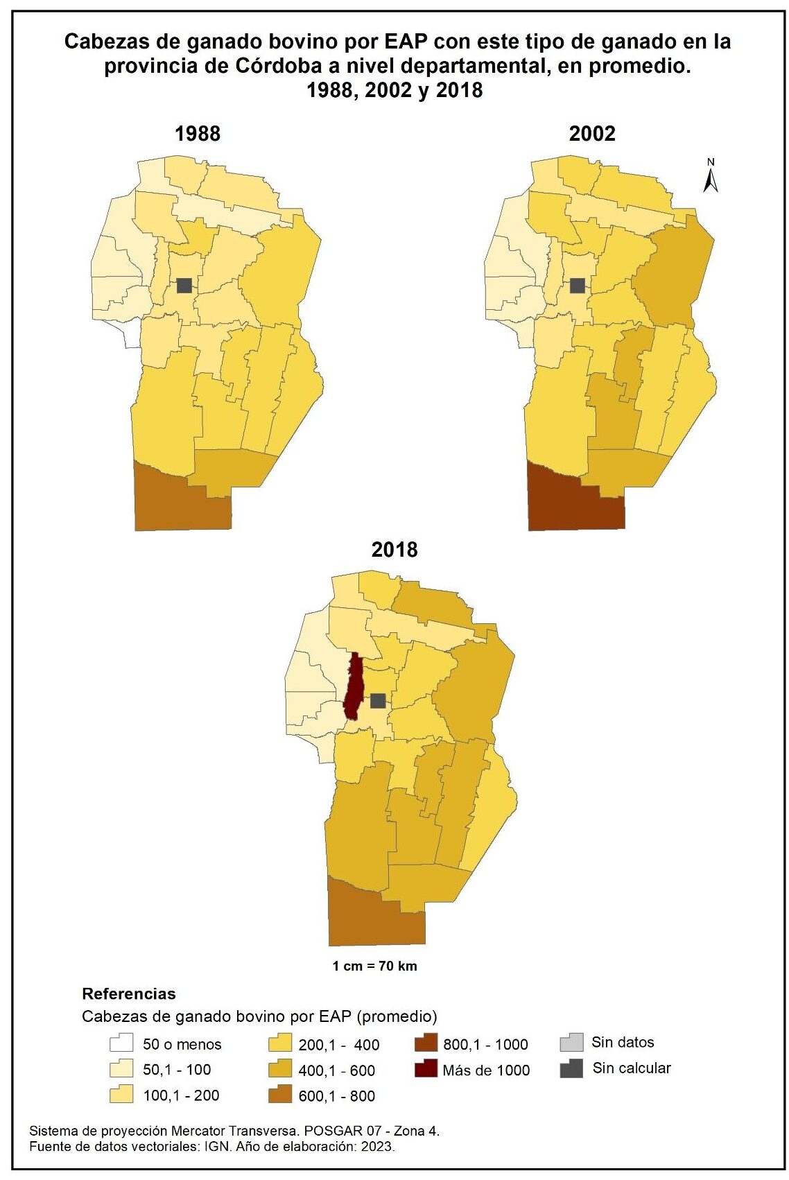 Figura 4.4. Cabezas de ganado bovino por EAP con este tipo de ganado en la provincia de Córdoba a nivel departamental, en promedio. Años 1988, 2002 y 2018.